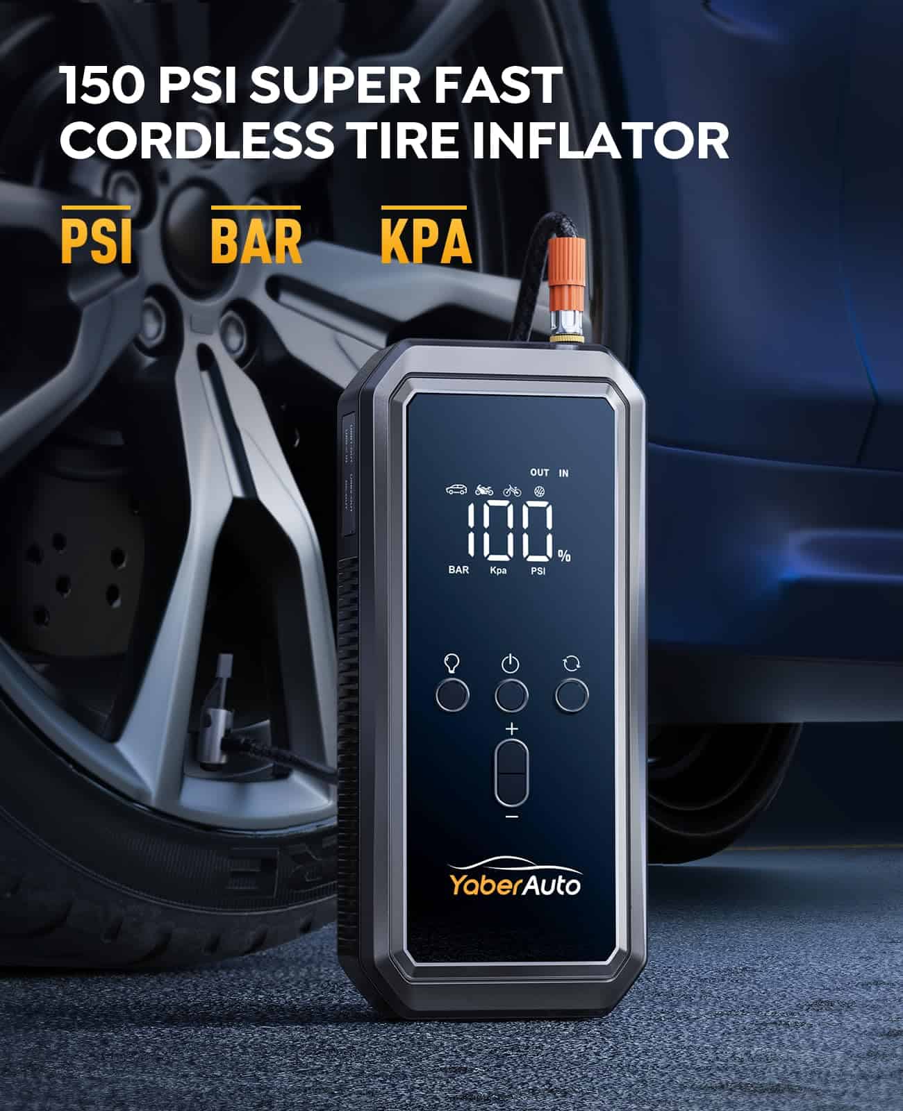 Dile adiós a los antiguos y voluminosos arrancadores de batería de coche! YA70 es más liviano y portátil, integra 8 funciones prácticas para satisfacer todas tus necesidades, incluido el arranque de emergencia de coche, compresor de aire, medidor de presión, luces de 3 modos (linterna, SOS, estroboscópica), dos puertos USB para power bank, y salida DC de 160W con adaptador para encendedor de cigarrillos DC. Portátil, versátil y un kit imprescindible para viajes por carretera. Potente y seguro. Con una corriente de arranque de 5500A mejorada, el arrancador de batería de coche portátil puede reiniciar instantáneamente tus vehículos de 12V (hasta 9.0L de gas/8.0L de diesel) incluso a -4 a 140 , compatible con más de 1000 ciclos de recarga. Este arrancador de batería para coche dura unos 24 meses en espera, siempre listo para ayudar. El arrancador de batería de coche está equipado con la función DE ARRANQUE FORZADO para baterías muertas o de bajo voltaje. Inflador inalámbrico de 150PSI con pantalla LCD inteligente. Presintonización inteligente y apagado automático sin ajustes ni verificaciones repetidas. Con un potente turbo de 35L/Min (150 PSI) que dura 25 minutos, el arrancador de coche portátil con compresor de aire infla rápidamente un neumático de coche hasta 20 PSI en solo 2 minutos. 5 modos de inflado, 3 opciones de cambio de unidad, 3 diferentes boquillas para aplicaciones variadas, como inflar coches, bicicletas, pelotas, etc. Gran pantalla LCD para leer datos en tiempo real, manguera de aire extendida desmontable para mayor facilidad de uso. Gracias a la innovación subversiva del diseño térmico de panal, la temperatura de arranque del arrancador de batería de coche portátil se reduce en un 30% para equilibrar. Cables de arranque pesados y alargados para llegar a terminales de baterías variadas, 10 protecciones de seguridad inteligentes incorporadas, detección automática de conexión, alarmas visibles en tiempo real, el arrancador de carga de batería de coche portátil es 100% seguro, sin chispas. Lo que obtienes y garantía: YabeAuto YA70 (1 arrancador con compresor de aire, 1 cables de arranque inteligentes, 1 manguera de bombeo de aire, 3 boquillas de gas, 1 cable de carga USB-C, 1 adaptador para encendedor de cigarrillos DC, 1 manual de usuario, 1 estuche portátil de EVA, y garantía de 12 meses, soporte técnico de por vida. Esperamos que nunca lo necesites, pero si tienes alguna pregunta postventa sobre arrancadores de batería, no dudes en contactarnos.