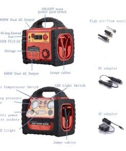 Arrancador de energía portátil Tyrell Chenergy 1800 Peak Amp es la solución todo en uno que necesitas para emergencias en la carretera y actividades al aire libre. Con una potencia de arranque de 1800 amperios pico, este arrancador de batería está diseñado para vehículos de 12V como camiones, SUVs, motocicletas, botes, RVs, furgonetas, tractores, cortacéspedes y más, con capacidad para motores de gasolina de hasta 6L y diésel de hasta 6L. Las pinzas de alta calidad con indicación de polaridad invertida y alarma garantizan un arranque seguro y estable sin preocupaciones. La estación de energía 6-en-1 HH715 combina una batería recargable de plomo-ácido de seguridad de 12V 20AH (20000mAh) con un inversor de corriente de 400W, puertos dobles AC/DC y un puerto USB de 2.1A para cargar una variedad de dispositivos como teléfonos inteligentes, tabletas, computadoras portátiles, cámaras, drones, ventiladores eléctricos, mini impresoras, neveras para autos y otros pequeños cargas. El compresor de aire de 260 PSI con monitor de presión de neumáticos infla un neumático de automóvil regular a 30 PSI en solo 3-4 minutos, y las 3 boquillas de alto flujo provistas permiten inflar neumáticos, balones, colchones de aire y más. El pack de batería de arranque seguro y estable de Tyrell Chenergy está equipado con una batería de plomo-ácido sellado de 12V, diseño a prueba de errores y un voltímetro analógico de fácil lectura para verificar el estado de la batería. Las 5 luces LED integradas proporcionan iluminación en situaciones de poca luz. Con una marca en la que puede confiar para producir arrancadores seguros y confiables, Tyrell Chenergy ofrece un servicio al cliente postventa de 12 meses que incluye instrucciones de uso del producto, protección del producto, reparación, reemplazo y más.