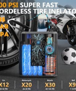 1. Inflador de Neumáticos Ultra-potente 200 PSI y 4X Más Rápido: Construido en cilindro de aluminio, motor de alta velocidad de 17500 rpm para una experiencia de inflado súper rápida, haga que su inflado de neumáticos sea libre de preocupaciones, el inflador de neumáticos ofrece un flujo de aire de 42 L/min de la mayoría de los 200 PSI inflado, 4 veces más rápido que otros. Solo se necesitan 4 minutos para inflar completamente un neumático de coche 205/55 R16 (0-36PSI), 0.5 minutos para rellenar de 29 a 36PSI en pruebas en laboratorios especializados.