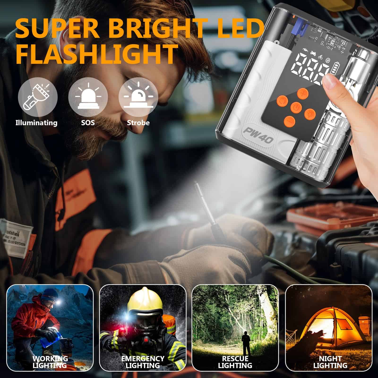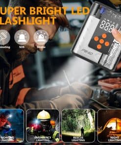 5. Linterna LED y Larga Vida de la Batería: El arrancador de batería utiliza una linterna LED brillante con 3 modos: Luz Estroboscópica, Luz Estroboscópica y Luz SOS. Cuando no está en uso, este arrancador de batería para coche puede mantener la energía durante aproximadamente 24 meses, siempre listo para ayudarlo.