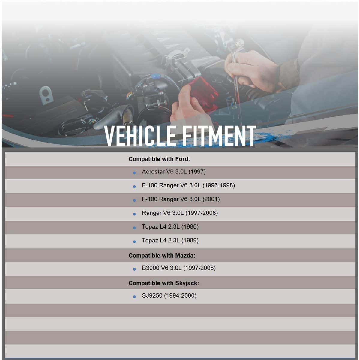 3. Compatible con Ford Ranger Splash 3.0L 1998; Ranger XL, XLT 3.0L 1999-06; Ranger Edge 3.0L 2001-05; Compatible con Mazda B3000 SE 3.0L 1994-03 – Consulte la descripción para más aplicaciones.