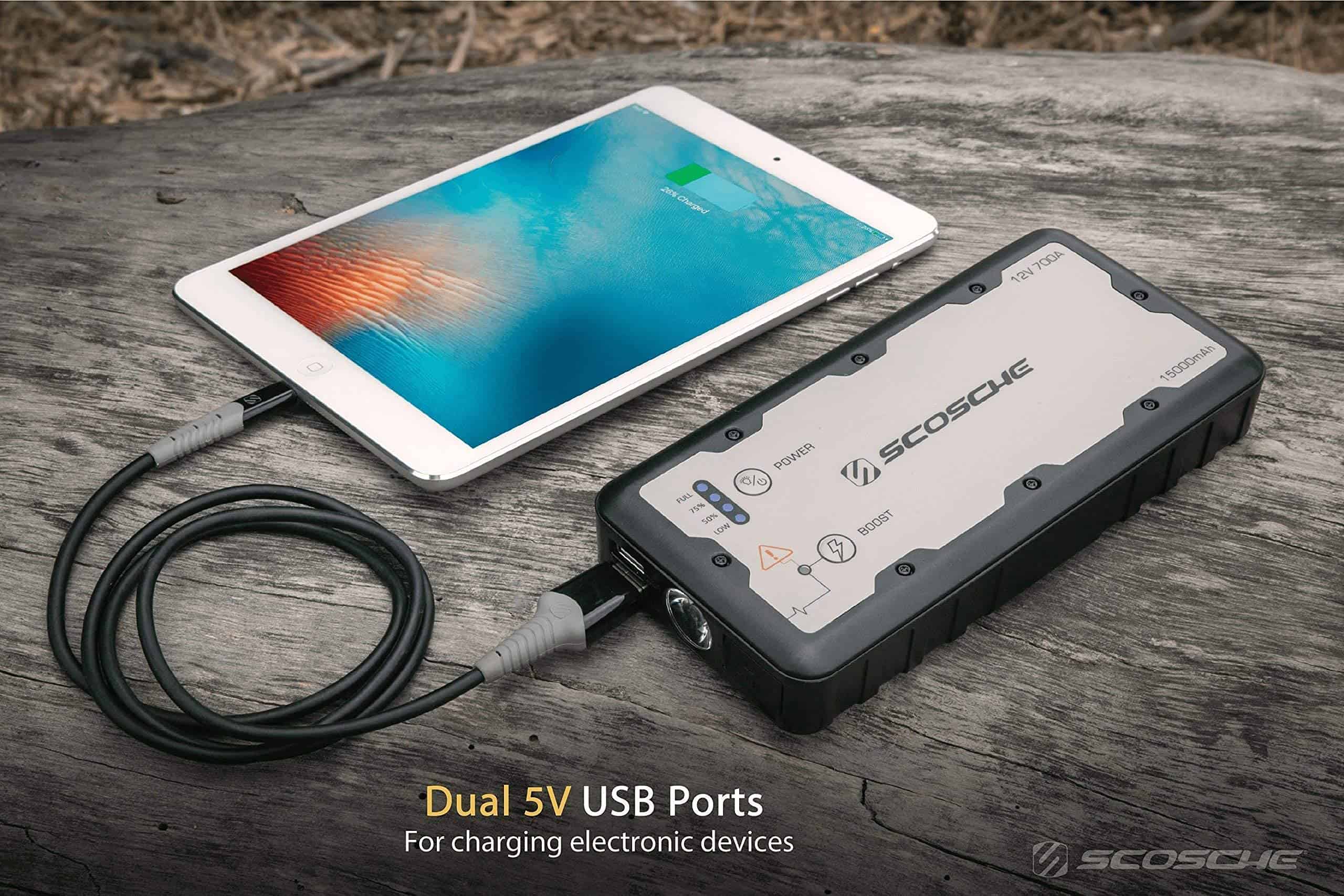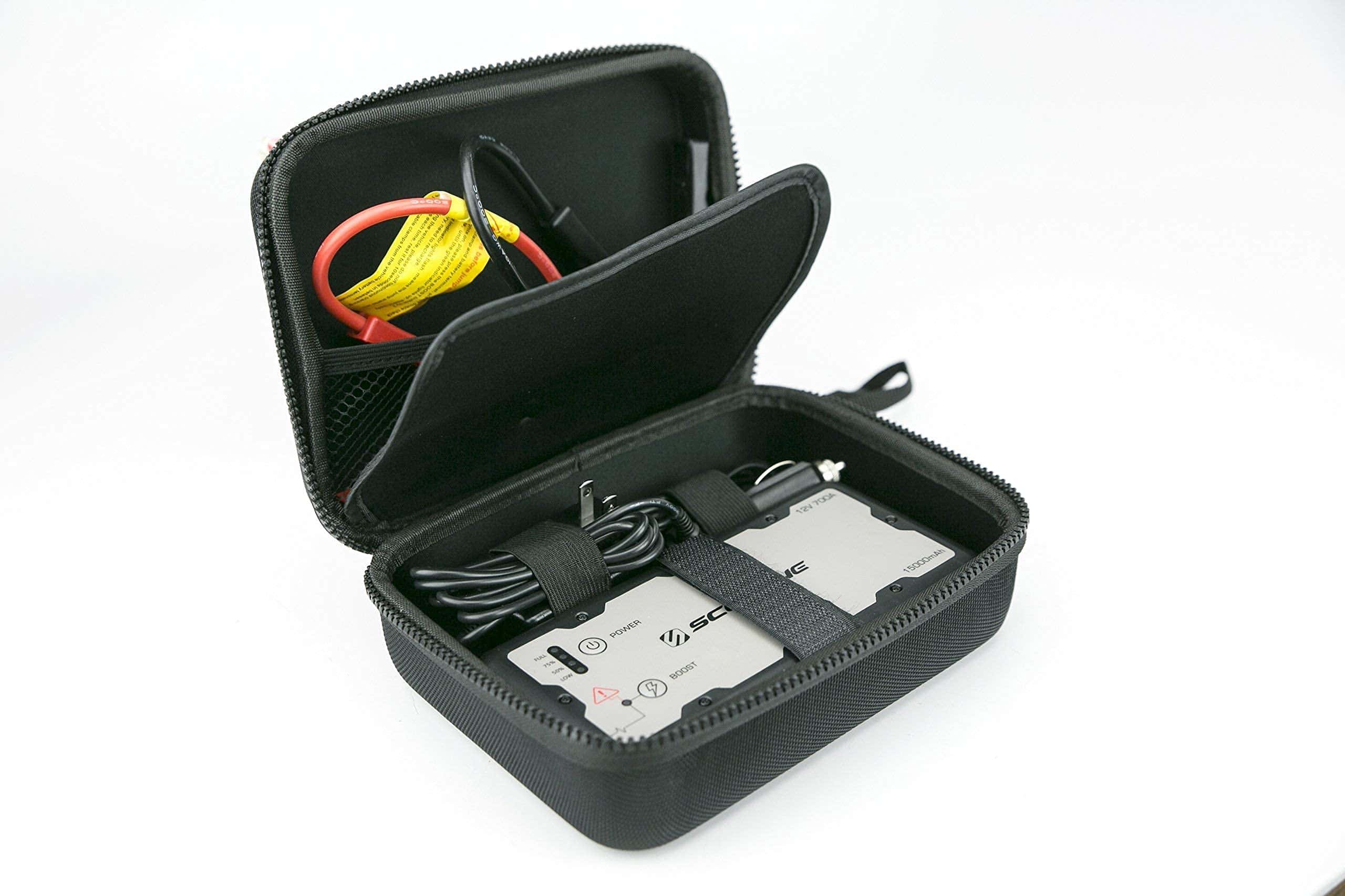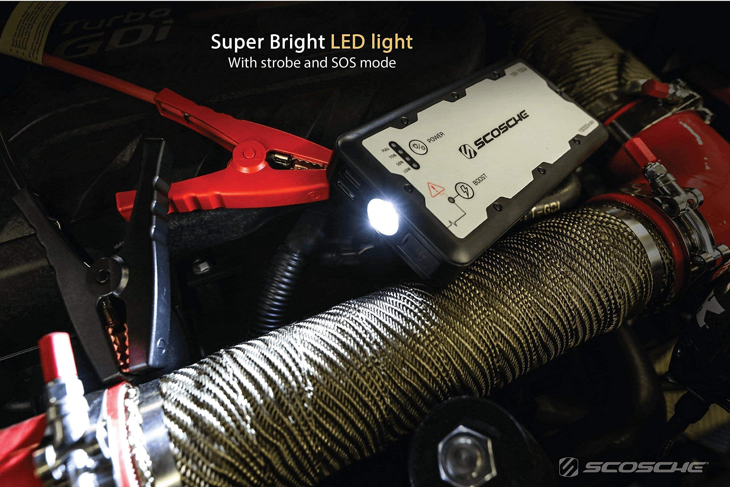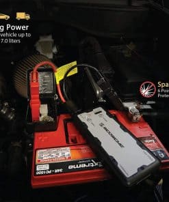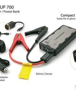 El arrancador de batería portátil SCOSCHE PBJ700-1 es la respuesta compacta y ligera a situaciones de emergencia en vehículos. Su tecnología avanzada y amplia potencia arrancará su coche, camión, barco, motocicleta o ATV/UTV cuando la batería esté baja o completamente muerta con la batería portátil de 15,000 mAh y 700A pico. El potenciador de batería puede mantenerse completamente cargado sin necesidad de recarga durante hasta 6 meses y tiene un ciclo de vida útil de carga y recarga de más de 1,000 veces. Los dos puertos USB de 5 voltios (2.1 + 1.1A) le permiten cargar rápidamente dos dispositivos USB al mismo tiempo desde la batería portátil. Presione el botón de encendido para verificar las 4 luces indicadoras separadas que le mostrarán en qué nivel de carga de la batería se encuentra actualmente, ya sea baja, 50%, 75% o completa. También se puede usar para recargar un dispositivo móvil o GPS o como linterna utilizando el modo SOS o intermitente en caso de emergencia en condiciones de poca iluminación o mientras está fuera por la noche. Nuestro arrancador de batería le brinda más que nuestros competidores con un total de 10 protecciones de seguridad integradas como cortocircuito, tiempo de espera, a prueba de chispas, sobre descarga, carga inversa, sobre corriente, sobre voltaje, sobrecalentamiento, capacidad de anulación, polaridad y protección a prueba de chispas para mantenerlo a usted, a su vehículo y a la unidad arrancadora seguros. La protección a prueba de chispas evita que ocurran chispas y el botón de refuerzo anula la protección de baja tensión del arrancador para arrancar una batería cuando la tensión es baja o está completamente descargada. El diseño resistente y duradero proporciona una larga vida útil para años de uso y con solo 3 de ancho, 7 de largo y 1 de grosor, el arrancador se guarda fácilmente en un maletero o compartimento de guantes. Este arrancador de batería para automóviles está respaldado por el soporte técnico de por vida de Scosche y garantía de 1 año
