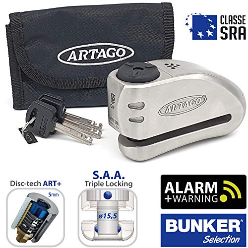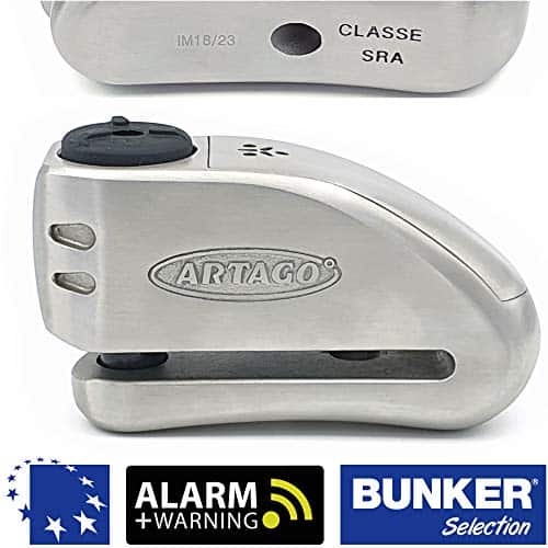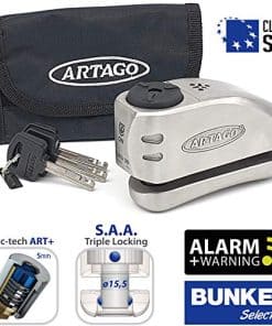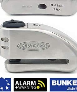 El ARTAGO 32 es un candado de disco de freno de moto de alta gama con alarma y función de advertencia. La activación de la alarma para moto es opcional y cuenta con un módulo de alarma de alta calidad, reemplazable e independiente. El candado de disco ha sido probado contra todo tipo de ataques en las pruebas de aprobación en Francia, calificando para ser aprobado CLASSE SRA. El candado de disco para motocicleta tiene el sistema de bloqueo anti-robo DISC-TECH ART+ con disco anti-taladro de 5 mm y cubierta antipolvo. Candado para moto fabricado por ARTAGO SECURE en Europa, especialista en productos antirrobo.