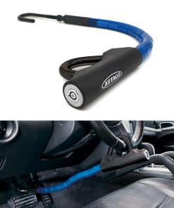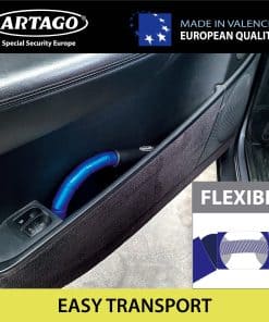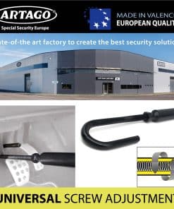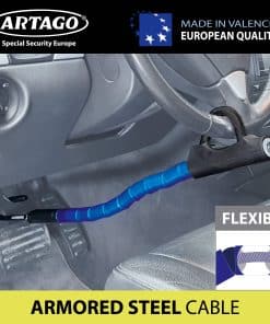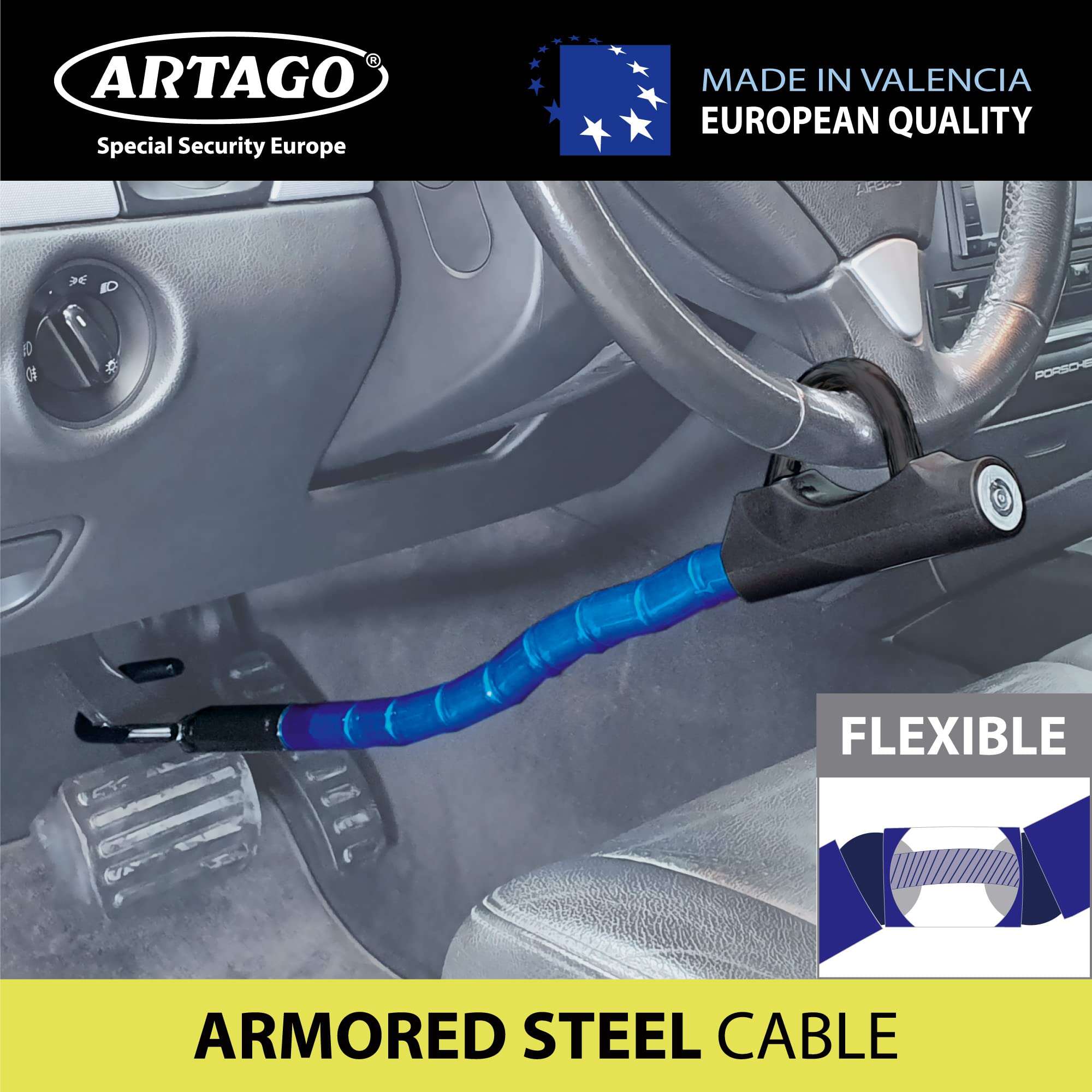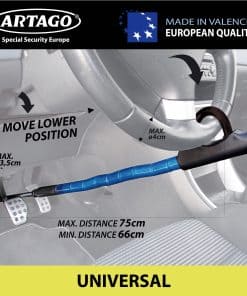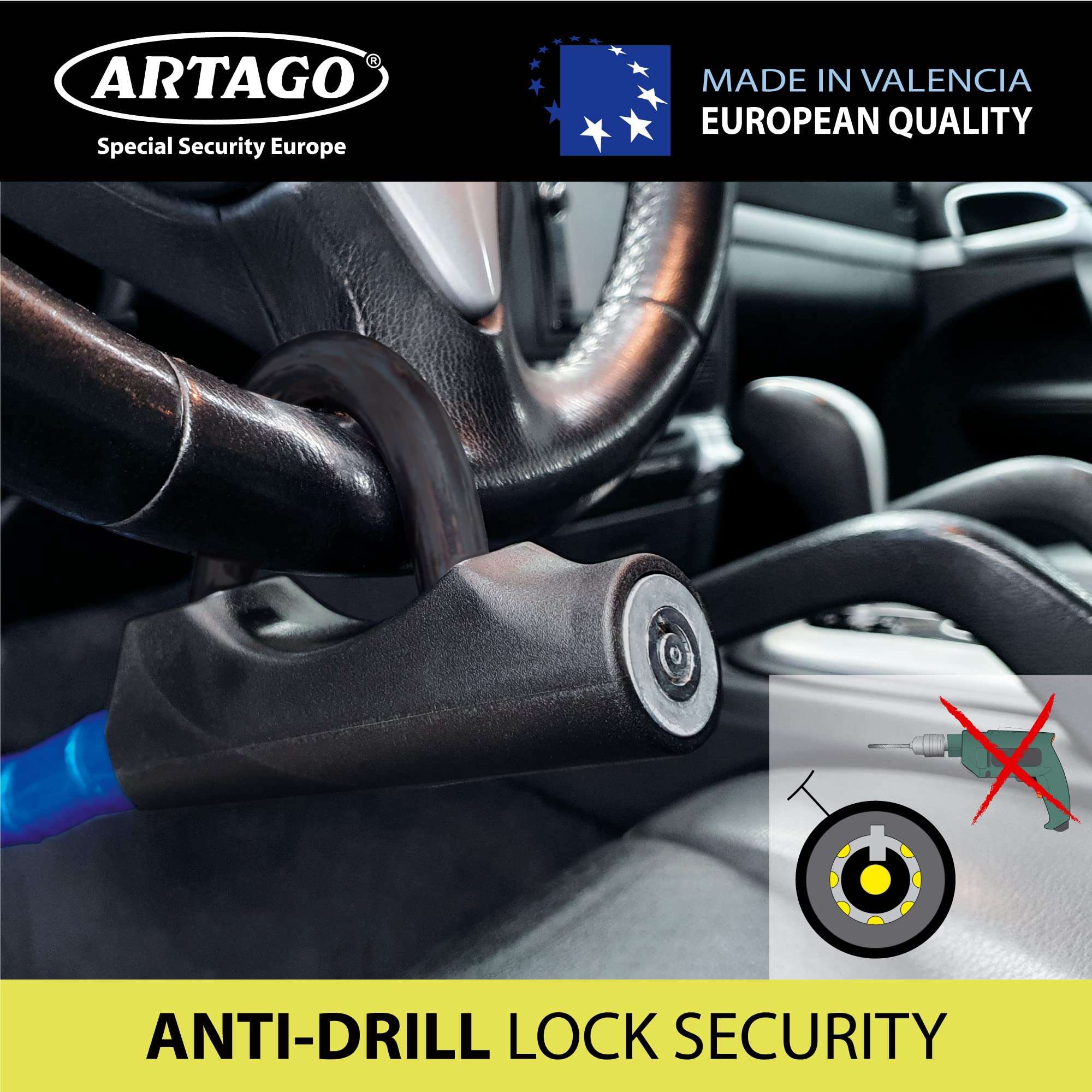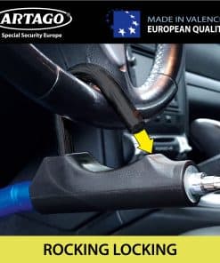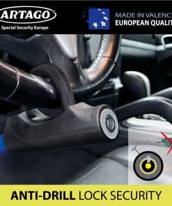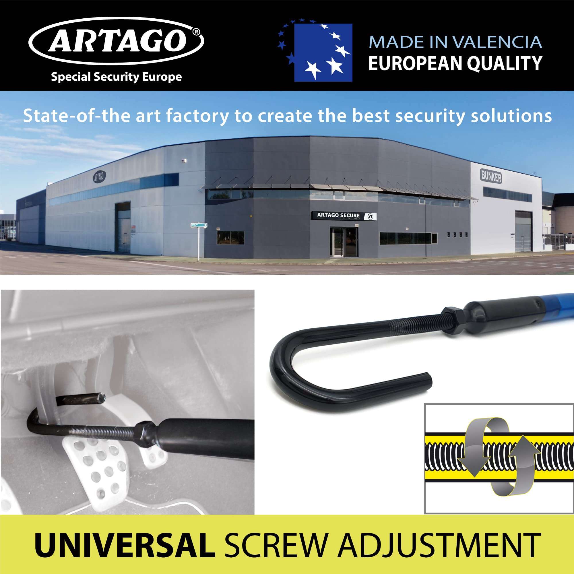 Dispositivo antirrobo de bloqueo de volante de alta gama Artago 880/B con arco de bloqueo basculante, Sistema de Gancho Fácil y ajuste de tornillo. Una vez colocado y bloqueado el candado para volante de coche, no se puede desenroscar. Ajuste la barra de bloqueo del volante solo la primera vez que lo use, con su ajuste de tornillo. El dispositivo de seguridad antirrobo para coche tiene un gancho de acero para sujetar fácilmente el bloqueo al pedal. Bloqueo de volante reforzado con un cable interno de acero blindado con casquillos de acero y bolas articuladas. El bloqueo para coche tiene un candado de alta seguridad con bola antitaladro. Dispositivo antirrobo para coche para volantes regulables en altura y distancia entre volante y pedal de máximo 29 pulgadas (74 cm), ideal para coche, SUV, furgoneta camper o autocaravana. Hecho en Europa, este dispositivo antirrobo para coche está fabricado por Artago Secure, especialista en productos de seguridad para coches de alta gama. Su fábrica se encuentra entre las más avanzadas y calificadas a nivel mundial, ubicada en Europa.