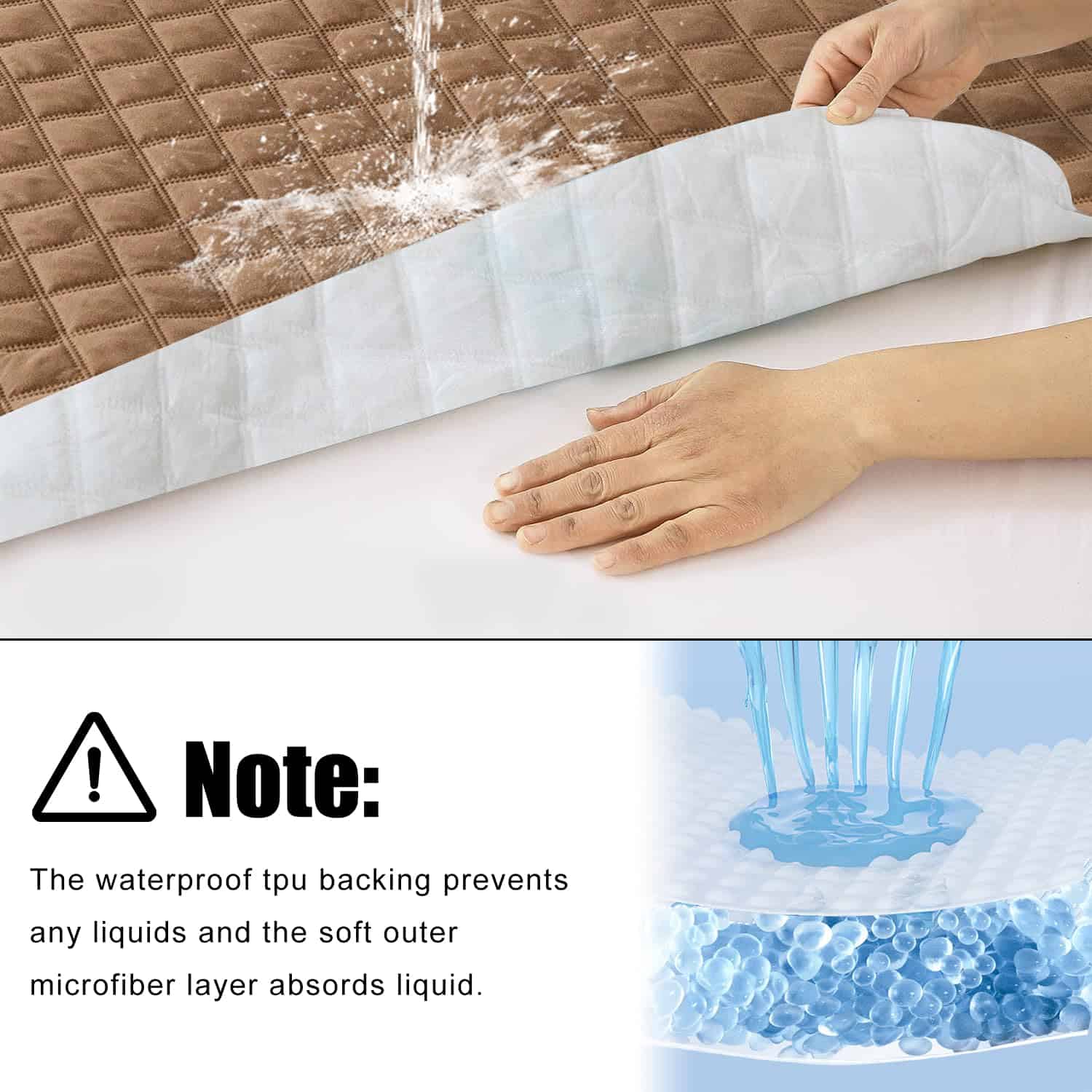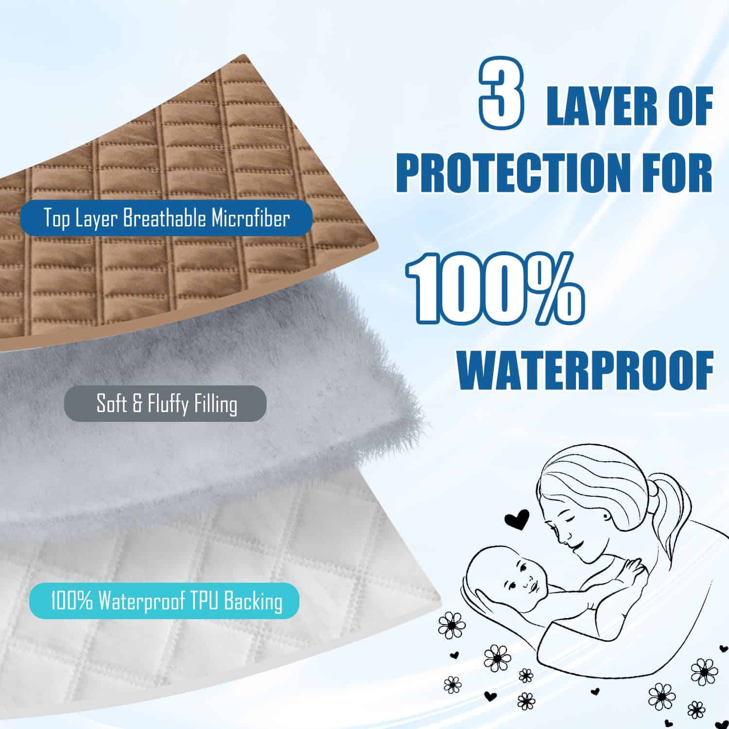 4. Capa impermeable: Con una barrera impermeable debajo de la suave y transpirable tela de microfibra de poliéster. La cubierta de la almohadilla de colchón ARYURBU protege la parte superior de su colchón del polvo, líquidos, orina, sudor sin alterar la sensación de su colchón.