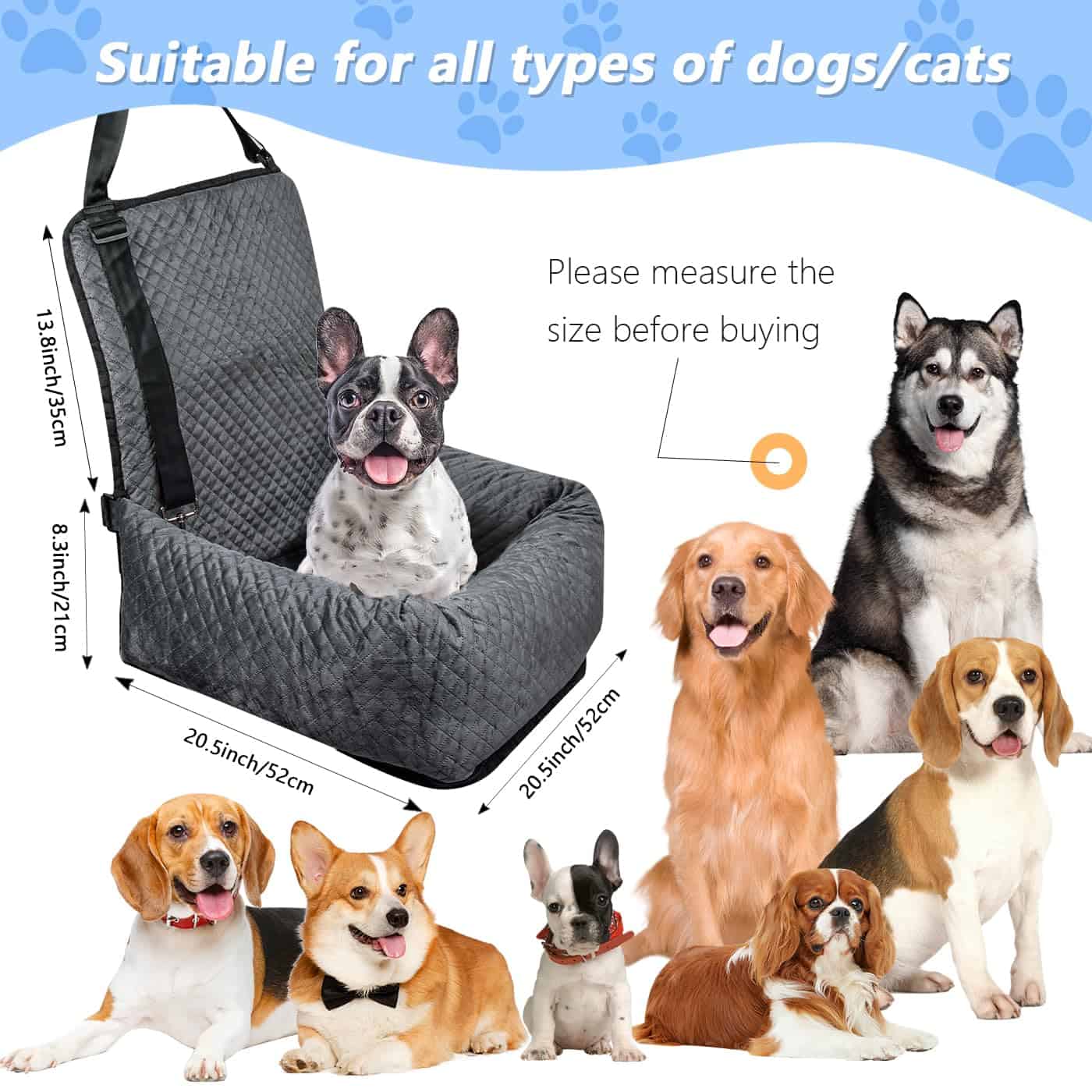 1. Perfectamente dimensionado para tu peludo Con unas medidas de 22.44x 21.25x 12.99 pulgadas, este asiento de coche para perros está diseñado para sostener cómodamente perros pequeños y medianos de hasta 35 libras. Ideal para razas como Bulldog Francés, Beagles o Shelties. Se adapta a casi todos los vehículos, desde automóviles compactos hasta SUVs y camiones.