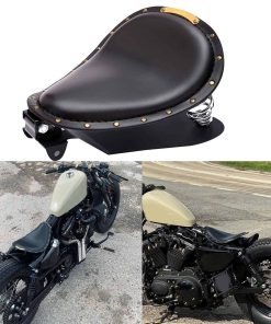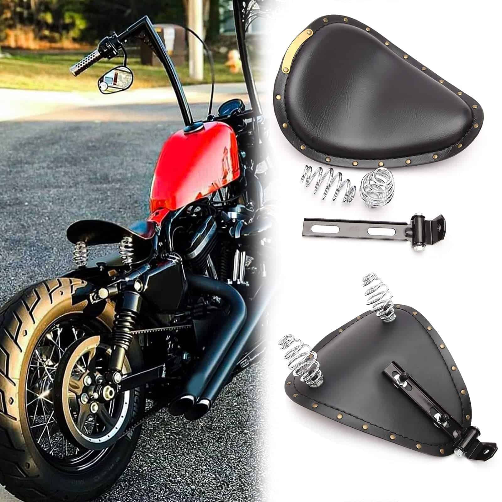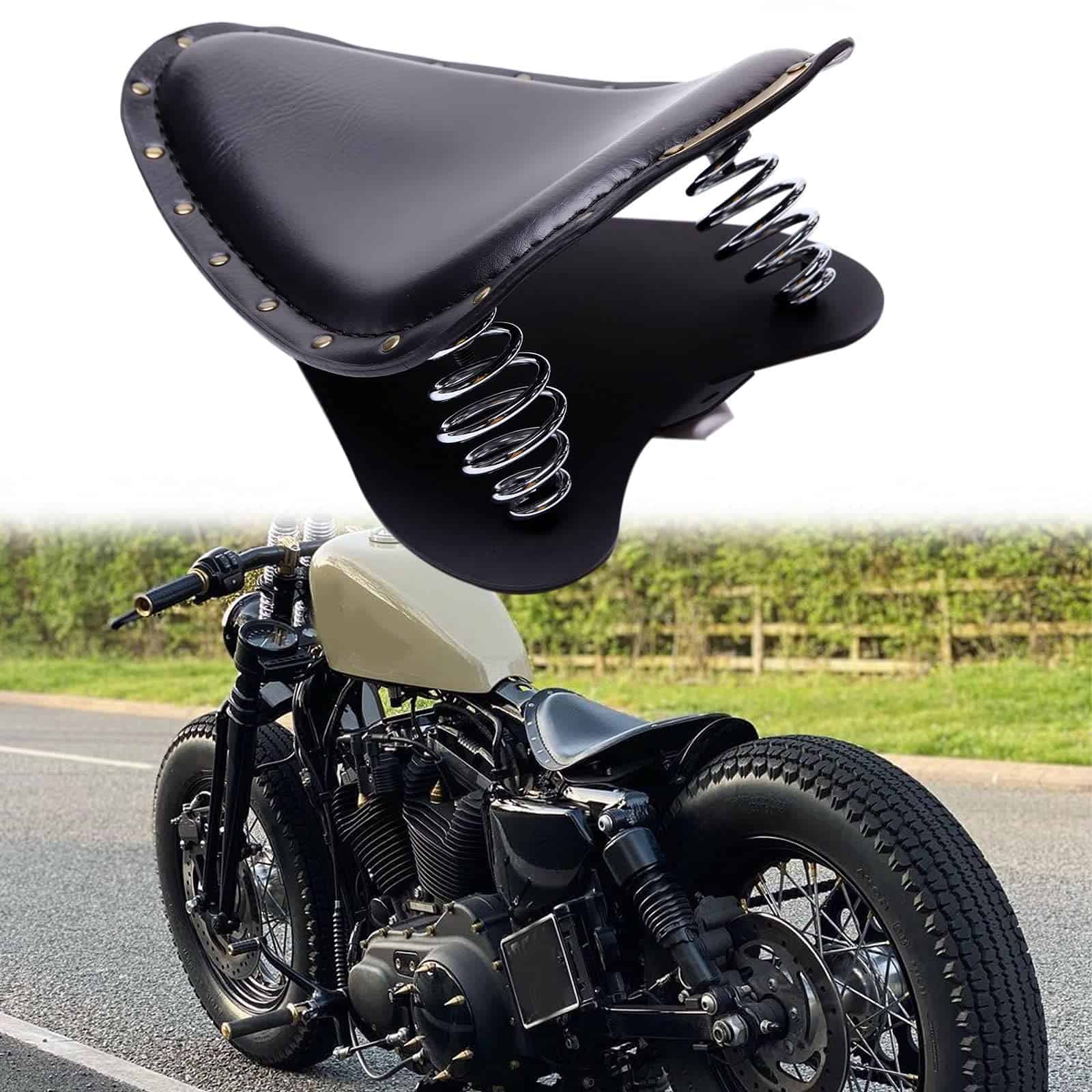 Asiento de motocicleta solo negro con muelles de remache y placa base, diseñado para ser compatible con Harley Chopper Bobber Sportster XL883 1200 48 Chopper. El asiento está hecho de cuero negro de alta calidad y espuma de neopreno para mayor comodidad. El soporte de montaje está fabricado en acero resistente. Este asiento tiene un diseño elegante y es perfecto para decorar tu motocicleta. Por favor, asegúrate de confirmar el tamaño antes de realizar la compra. Fácil de instalar, aunque algunas motocicletas pueden requerir habilidades personalizadas profesionales. El paquete incluye 1 asiento de motocicleta, 1 base de asiento y 2 muelles. Compatible con Harley Sportster Bobber Chopper y aplicaciones personalizadas, ajuste perfecto para Harley Sportster XL883 XL1200.