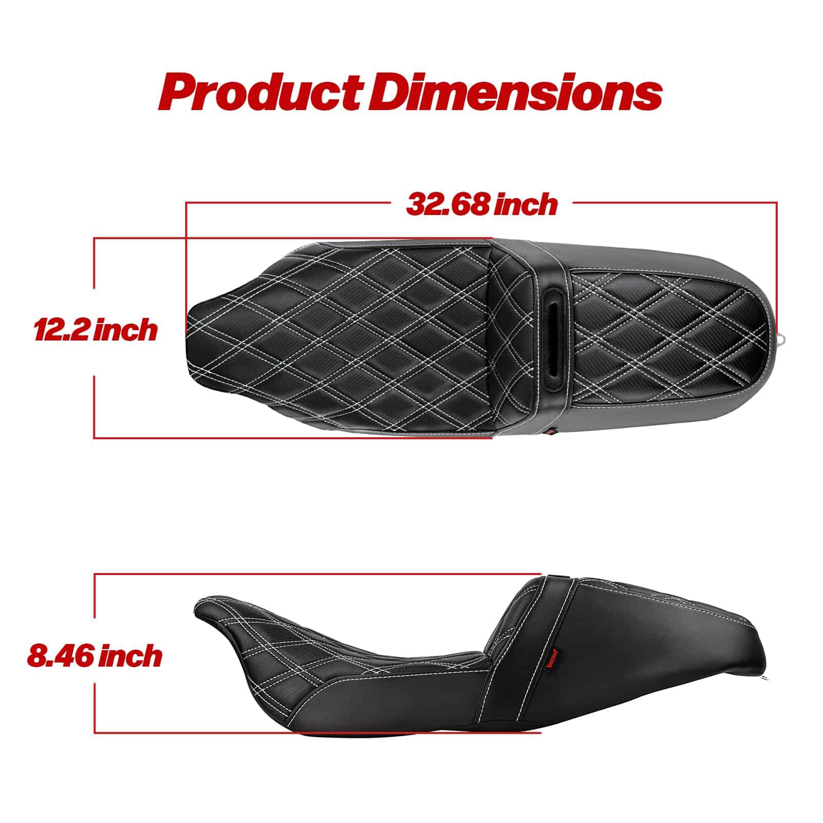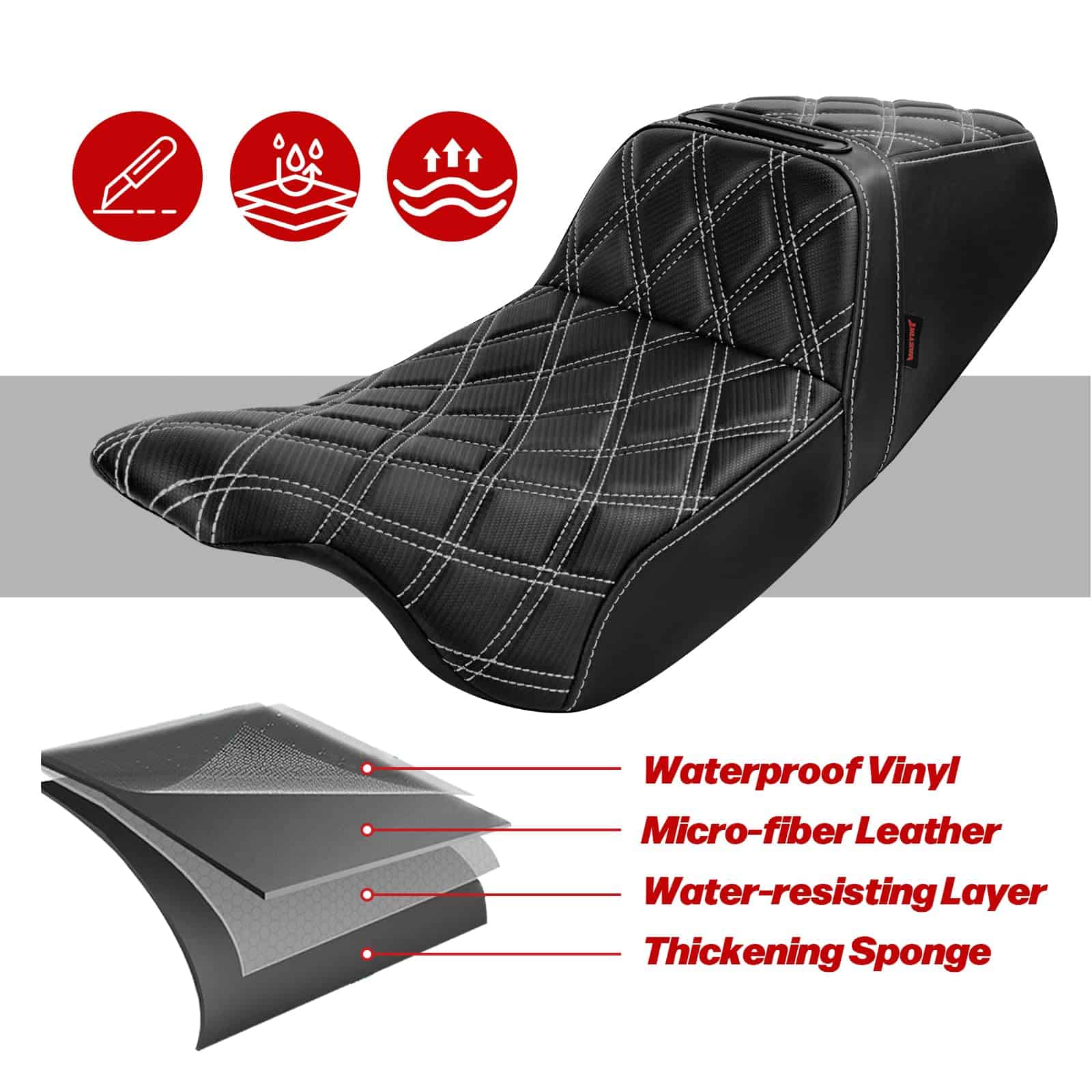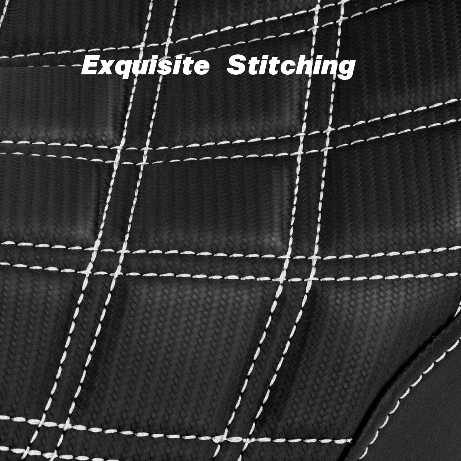 2. Materiales premium, este asiento de motocicleta está fabricado con cuero de alta calidad, espuma y material de gel, garantizando tanto comodidad como durabilidad. El exterior negro con acolchado en forma de diamante añade un toque de lujo a tu motocicleta. El amplio espacio cuenta con un sistema de suspensión de plataforma para un 15% de mejora en la comodidad de conducción.