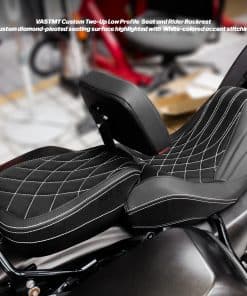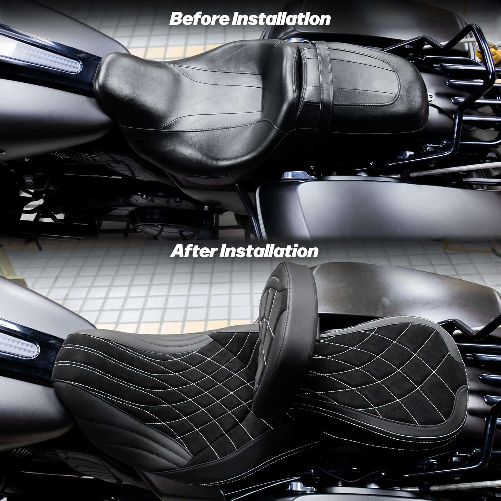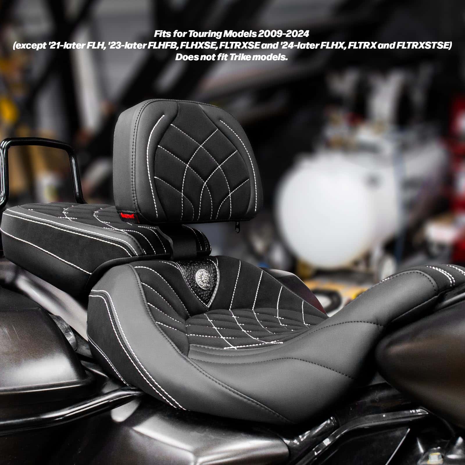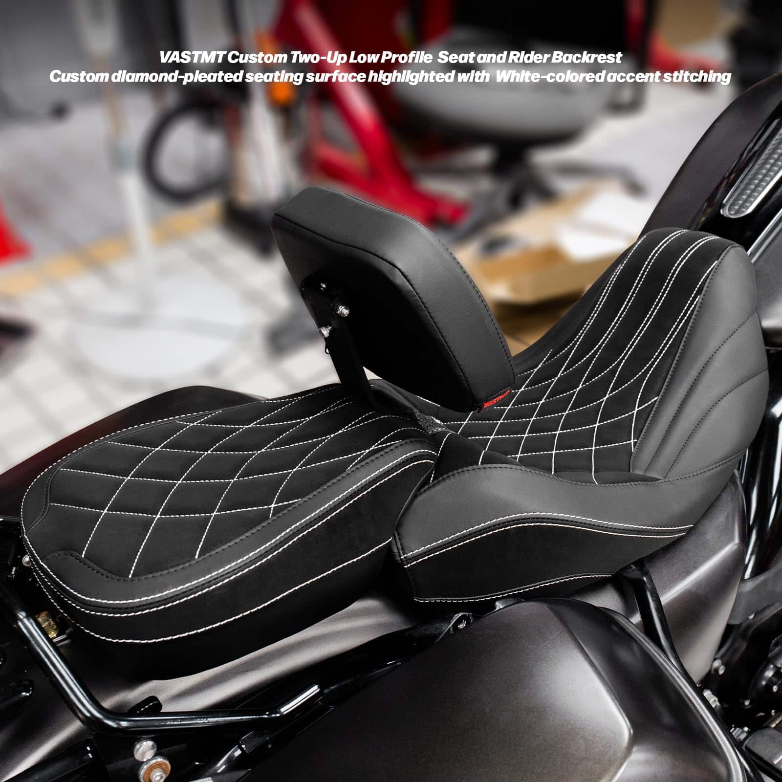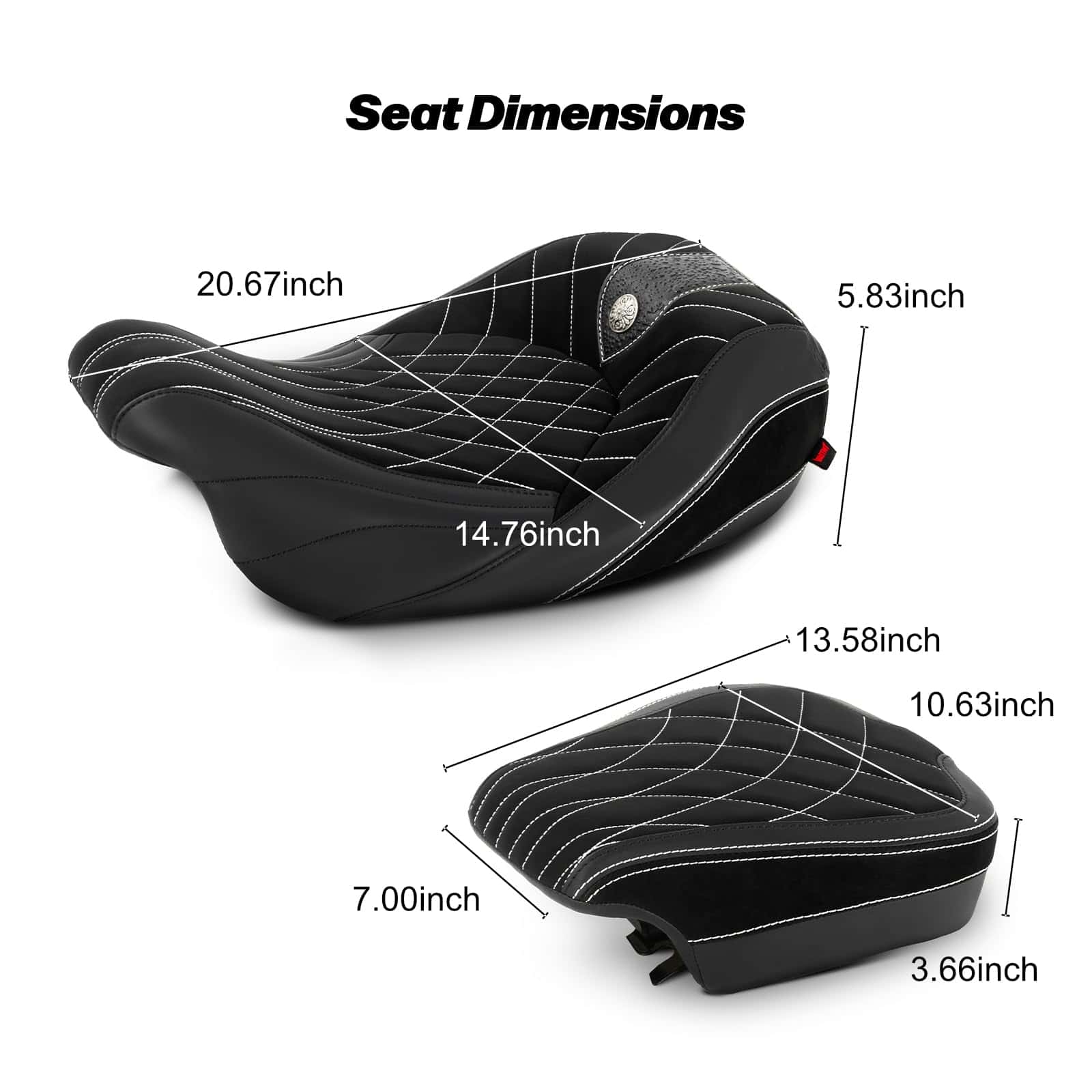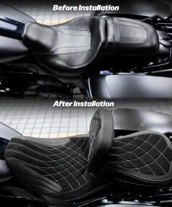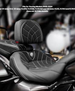 Este asiento de rider y pasajero de perfil bajo personalizado con patrón de costuras blancas es la elección perfecta para aquellos que buscan comodidad y estilo a la vez. Con una construcción de alta calidad y un diseño elegante, este conjunto de asiento está diseñado para adaptarse a los modelos de Harley Touring Road King, Street Glide, Road Glide, Electra Glide de 2009 a 2024.