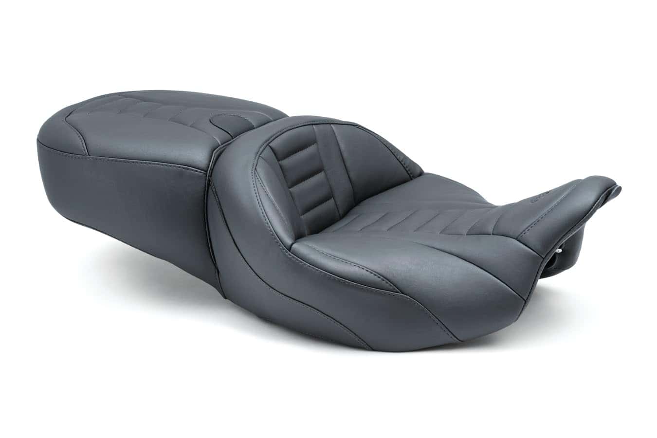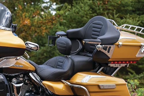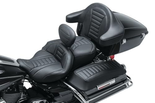 El asiento de una sola pieza Mustang 79006 Super Touring Deluxe delantero sitúa al piloto 1.75″ más hacia atrás en comparación con el asiento de serie y además inclina el cuerpo para mayor comodidad en viajes largos. El asiento trasero brinda apoyo en toda su amplitud y mantiene al pasajero firmemente en la zona de confort. Diseñado siguiendo las últimas tendencias en diseño interior automotriz, el asiento presenta un exquisito detalle de costura. Diseñado para trikes, incluye un orificio de drenaje delantero conveniente para días de lluvia. Incluye (1) asiento de una sola pieza Super Touring Deluxe en negro; se sugiere para instalación (no incluido): destornillador tipo phillips y tornillo trasero de fender de 1/4″-20 x 1/2″. El asiento de una sola pieza Mustang 79006 Super Touring Deluxe es compatible con los siguientes modelos de Harley-Davidson: Road King ’08-’19, Street Glide ’08-’19, Street Glide Trike ’10-’11, Electra Glide ’08-’19, Road Glide ’08-’19 y Tri-Glide ’09-’19; mide 19″ de ancho en la parte delantera y 14″ de ancho en la parte trasera. Este asiento no funcionará con kits de respaldo montados en el marco de Mustang o H-D. El asiento se adaptará con pasamanos. Todas las notas de posición de asiento se comparan con la posición de touring estándar de Electra Glide. Si su asiento es de alcance reducido, alcance extendido o asiento bajo, estas comparaciones pueden no aplicarse.