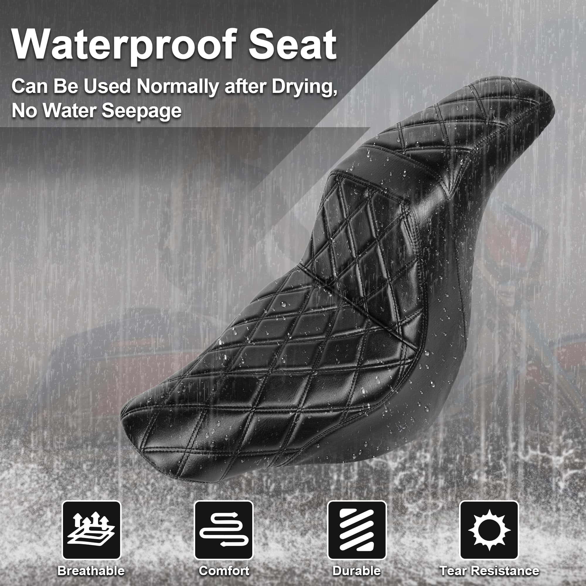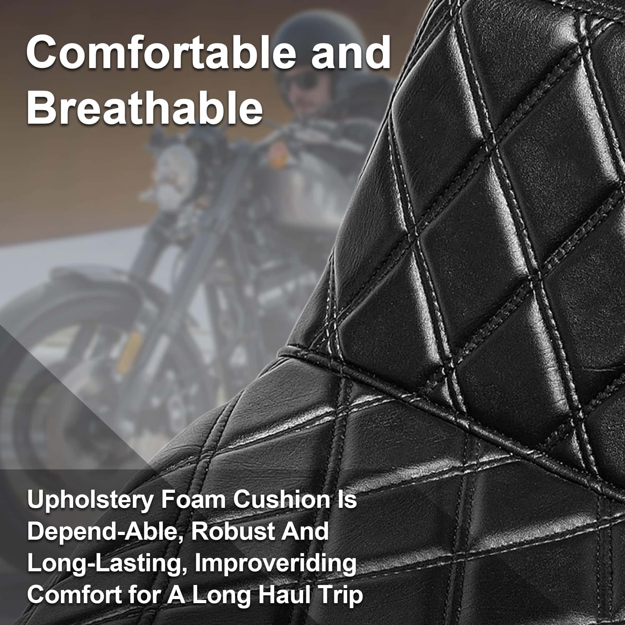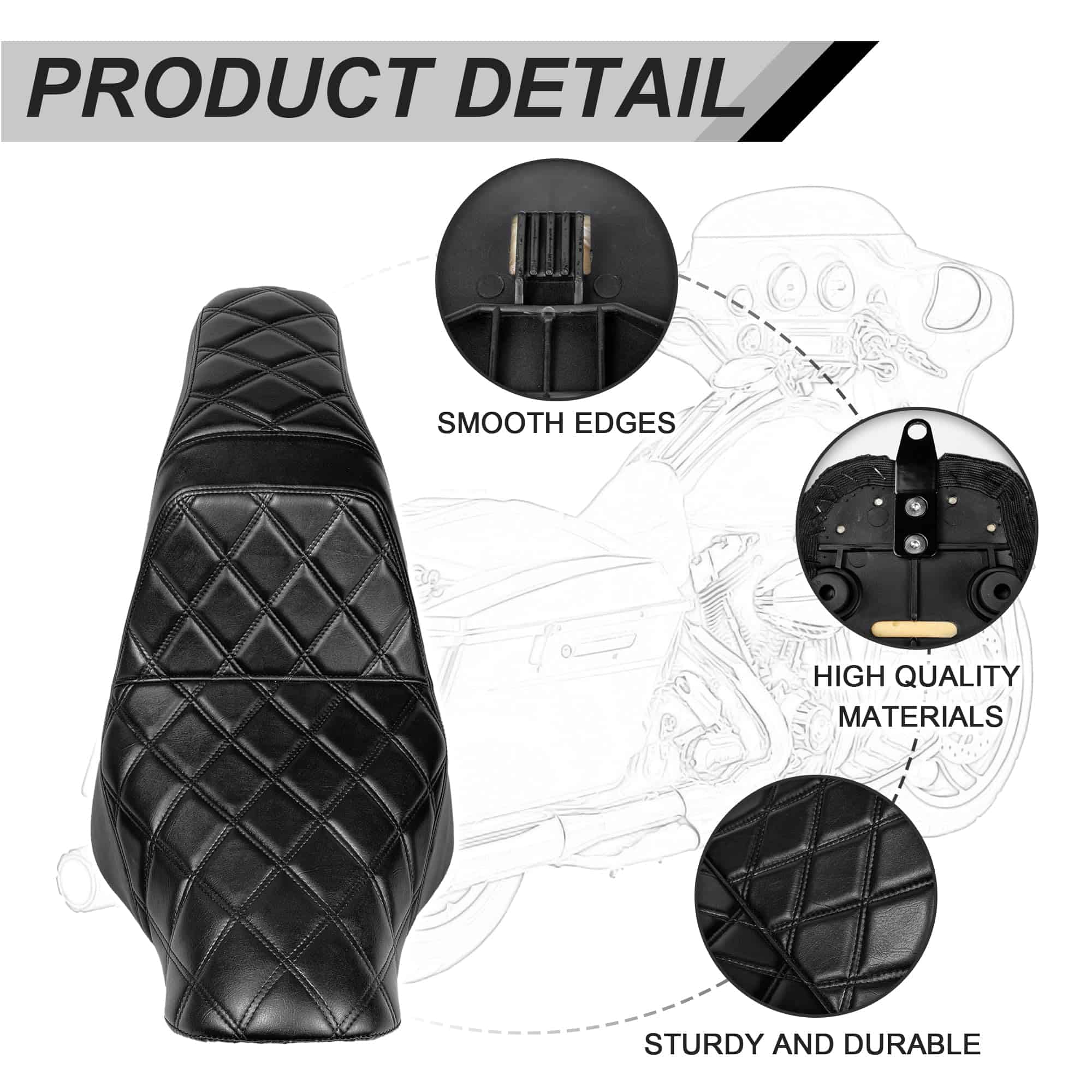 Asiento para Conductor y Pasajero Apto para Harley Softail Sport Glide FLSB Low Rider FXLR FXLRS FXLRST 2018 en Adelante (Costuras Negras) – Este asiento para conductor y pasajero es específicamente diseñado para adaptarse a los modelos Harley FXLR Low Rider 2018-2021, FXLRS Low Rider S 2020-2024 y FXLRST Low Rider ST 2022-2024. El asiento para conductor ofrece un mejor soporte lumbar para el piloto, mientras que el asiento para pasajero cuenta con un acolchado adicional para un paseo suave y cómodo, incluso en terrenos difíciles. Fabricado con cuero sintético de alta calidad y espuma de alta densidad, este asiento garantiza una comodidad duradera y excelente soporte tanto para el conductor como para el pasajero, resistiendo la deformación con el tiempo. Fácil de instalar, este asiento para conductor de Harley es un reemplazo directo para su asiento viejo o dañado, con dimensiones que aseguran un ajuste perfecto y una instalación sin problemas. Disfrute de una mayor comodidad, durabilidad y estilo con este conjunto de asientos premium que incluye 1X asiento para conductor y pasajero.