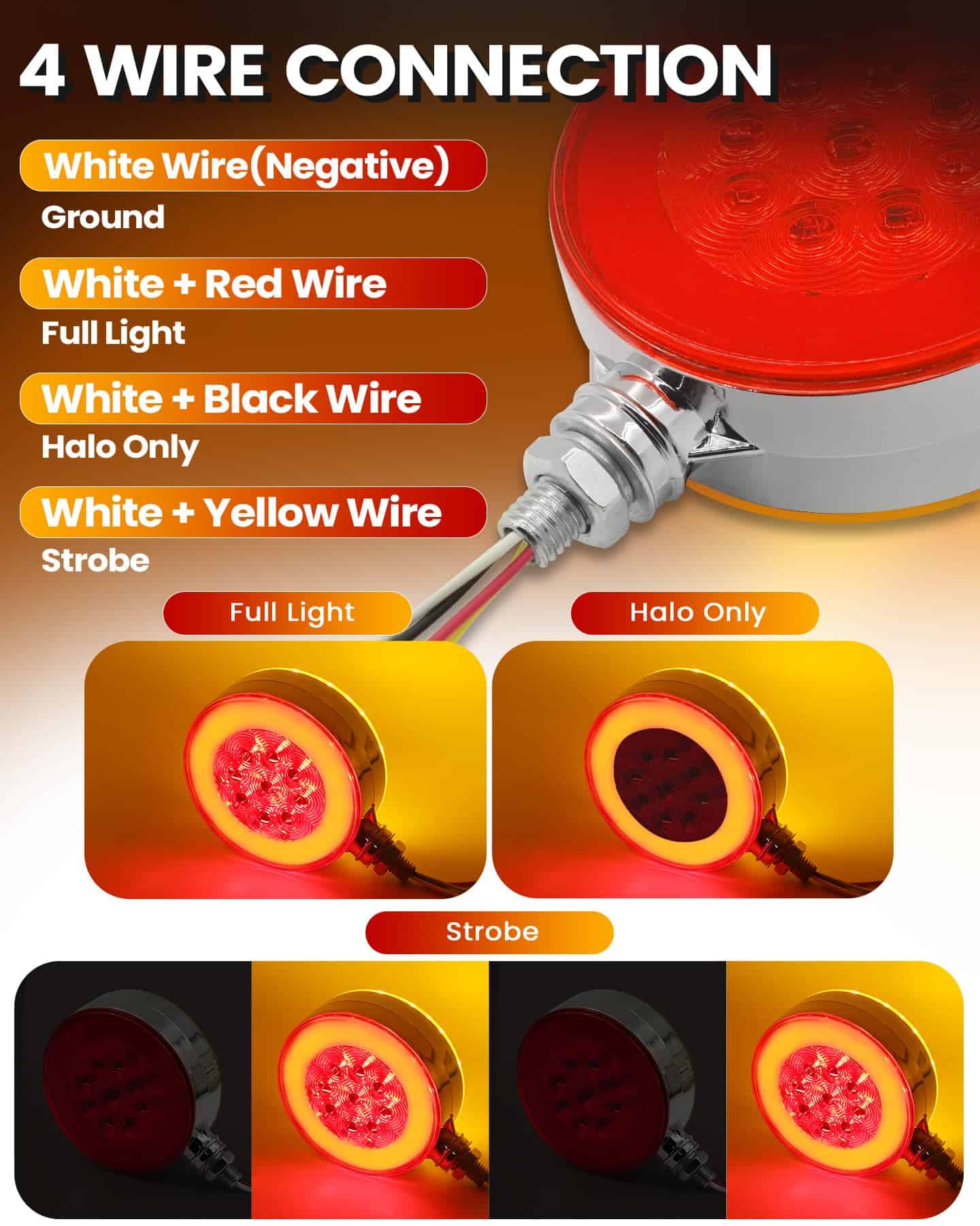 1. INCLUYE EMBALAJE E INSTRUCCIONES DE CABLEADO: 2PCS 74 LED Luz de Camión Redonda de Doble Cara con Halo, disponible con Lente Clara o Lente de Color, configuraciones de color: Delante Ambar y Atrás Ambar o Delante Ambar y Atrás Rojo. Instrucciones de cableado: Cable Blanco (Tierra): Conecte a la tierra. Cable Negro (Solo Halo): Conecte para activar la luz de halo. Cable Rojo (Luz Completa): Conecte para activar tanto la luz de halo como la central. Cable Amarillo (Intermitente): Conecte para activar el modo intermitente.