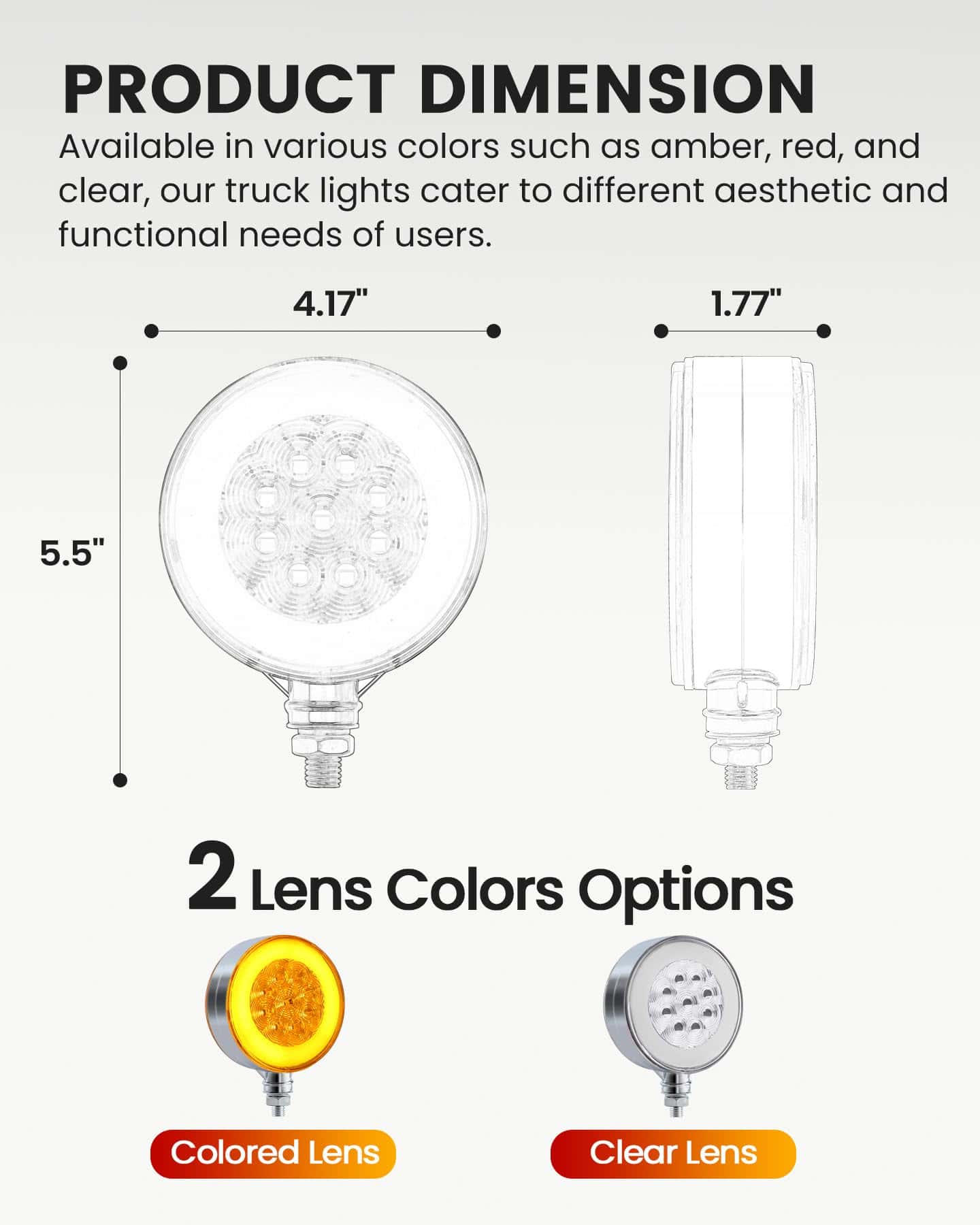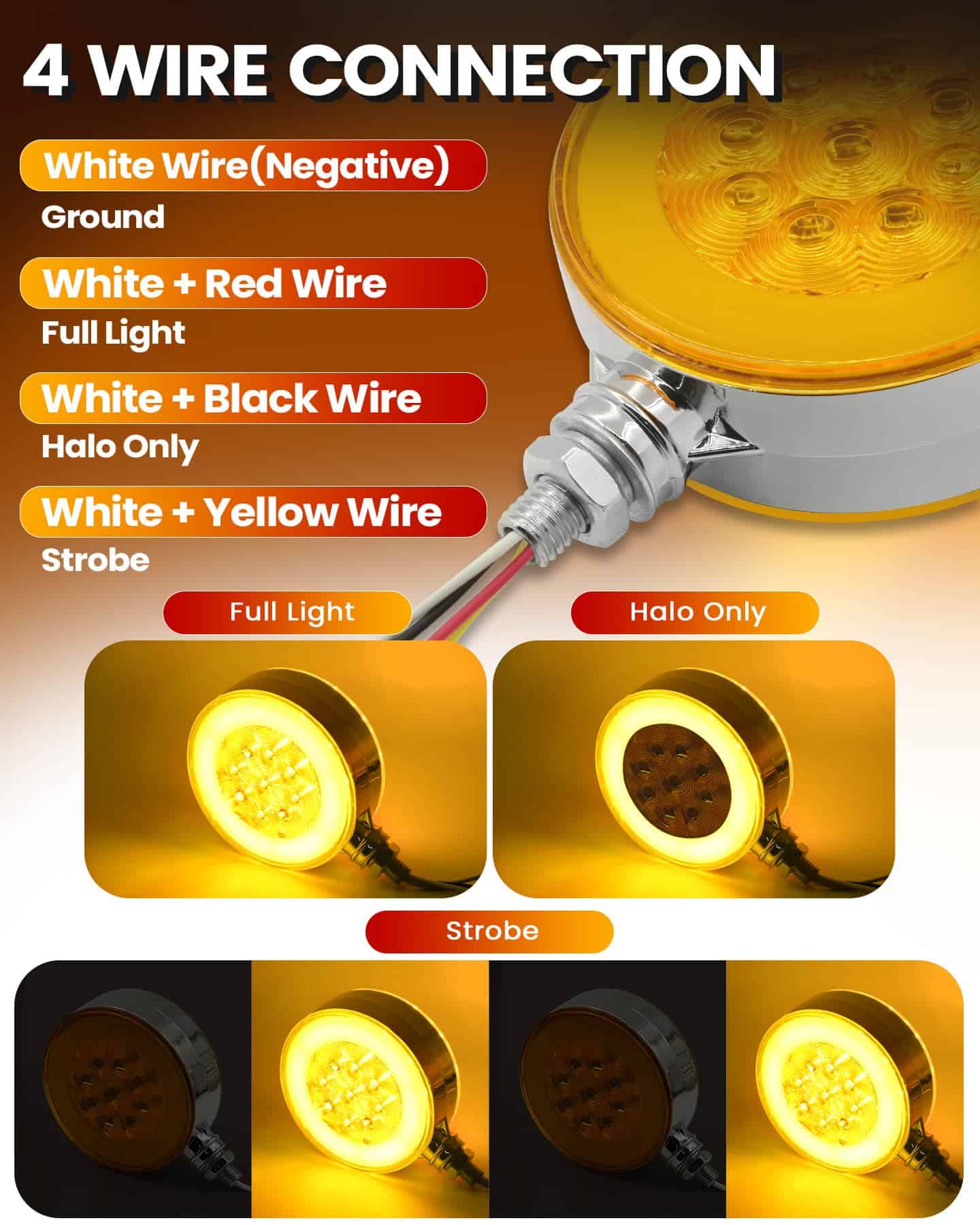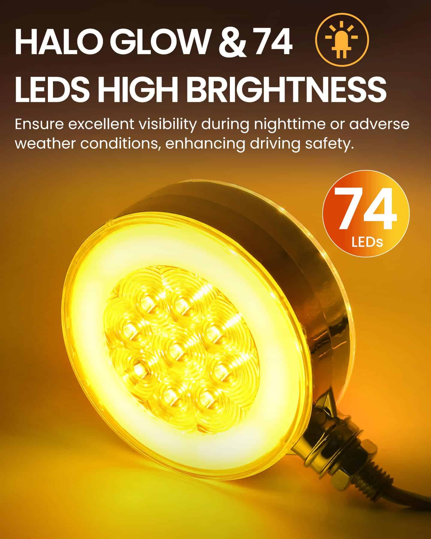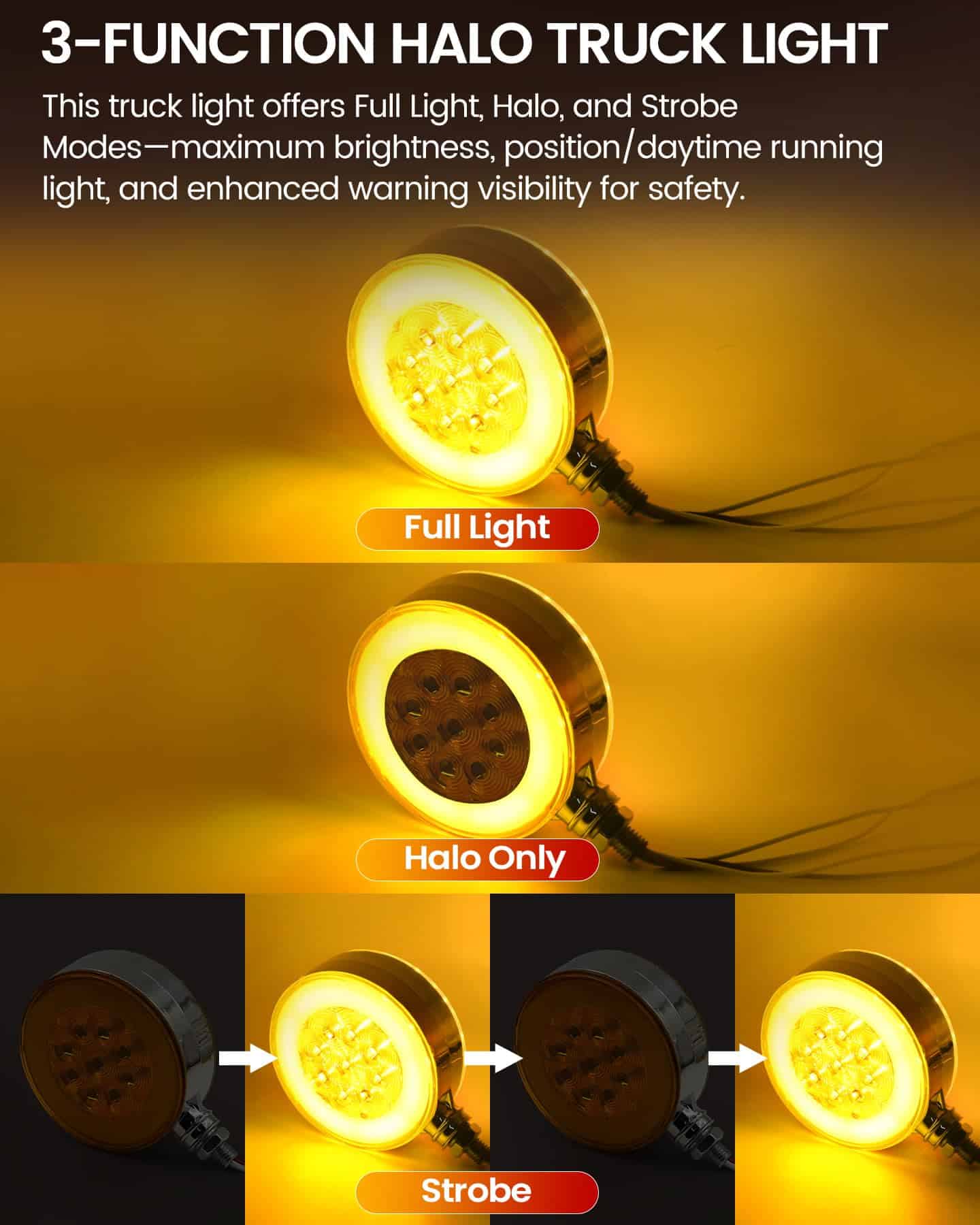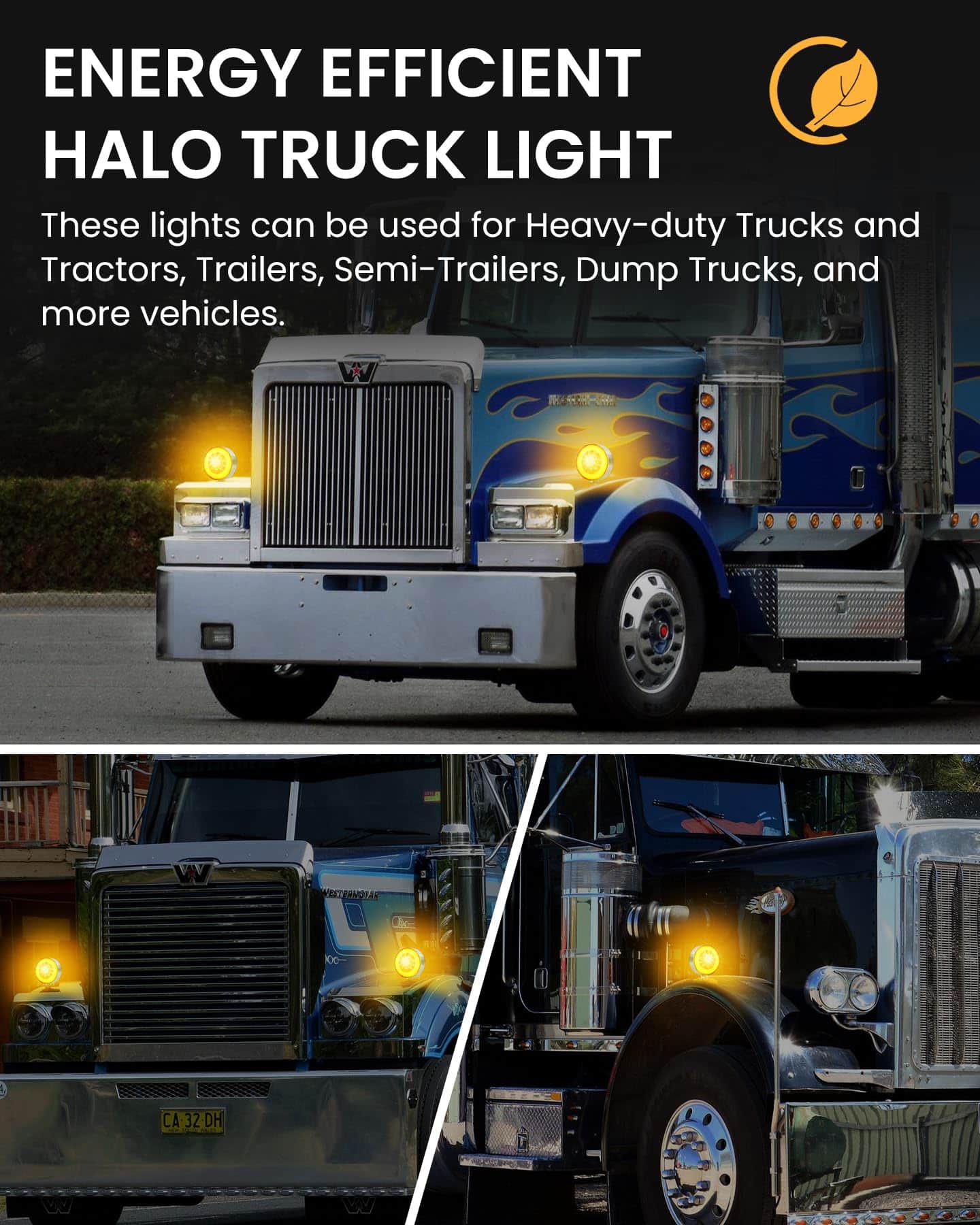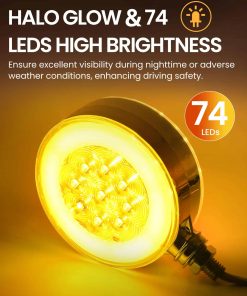 Tamaño del producto: 106 x 106 x 45mm. Cada luz cuenta con un total de 74 LED de alta luminosidad, proporcionando una iluminación más fuerte con iluminación lateral frontal y trasera. Presenta 3 modos de iluminación: Modo de Halo, Modo de Luz Completa, y Modo Intermitente. Compatible con vehículos de 10-30V, como camiones semirremolques, camionetas, remolques, autobuses, vehículos recreativos, camiones pesados, entre otros.