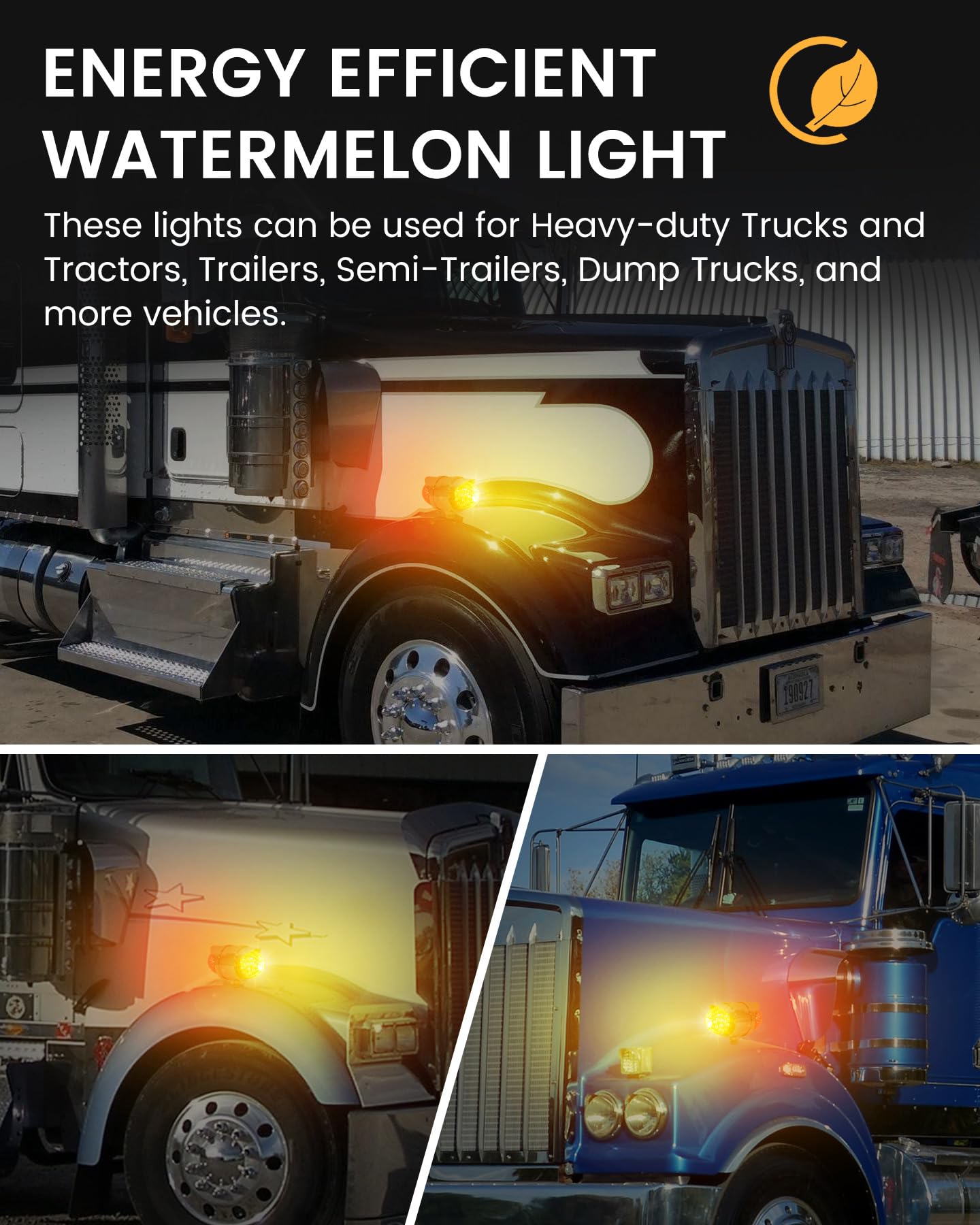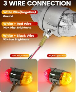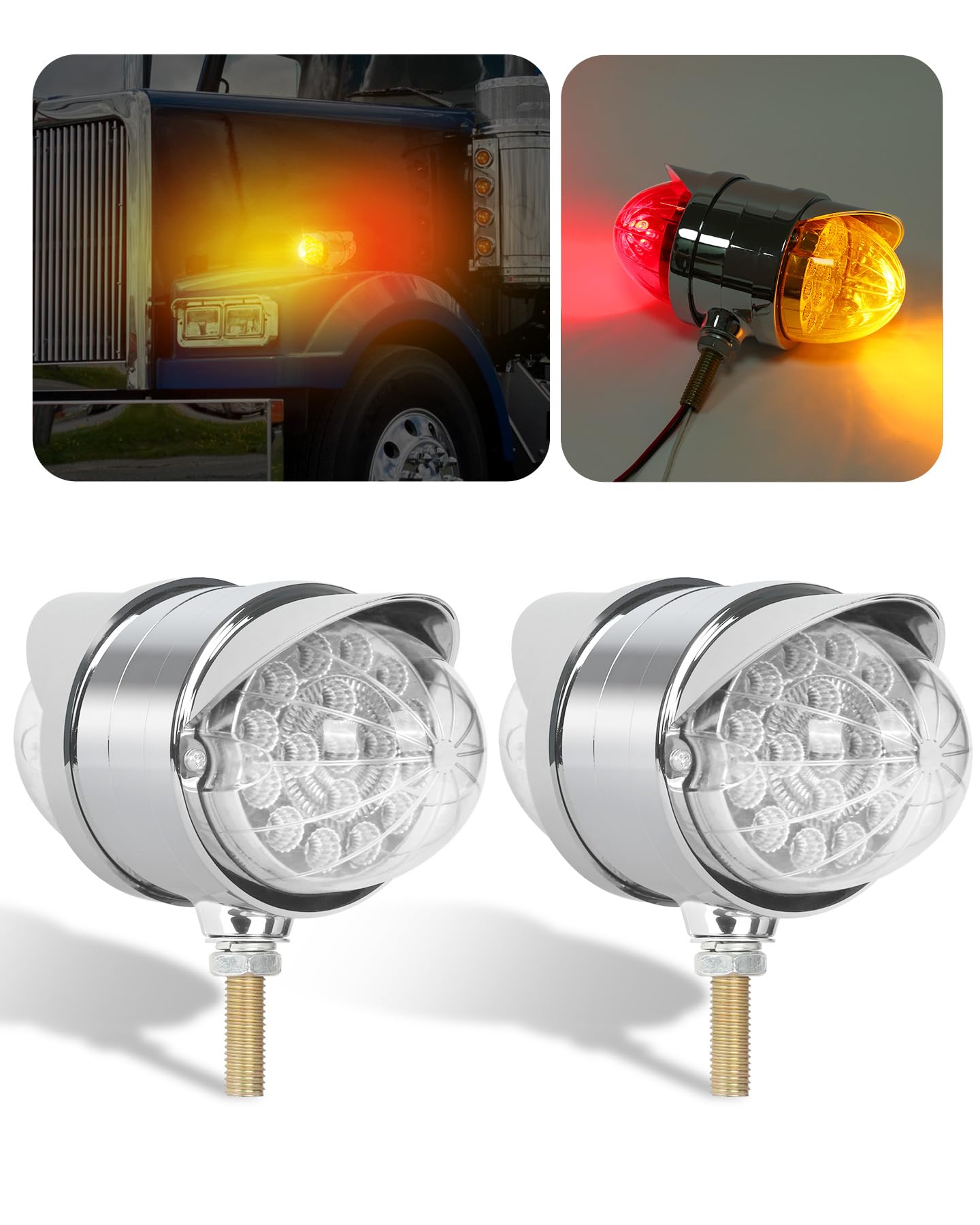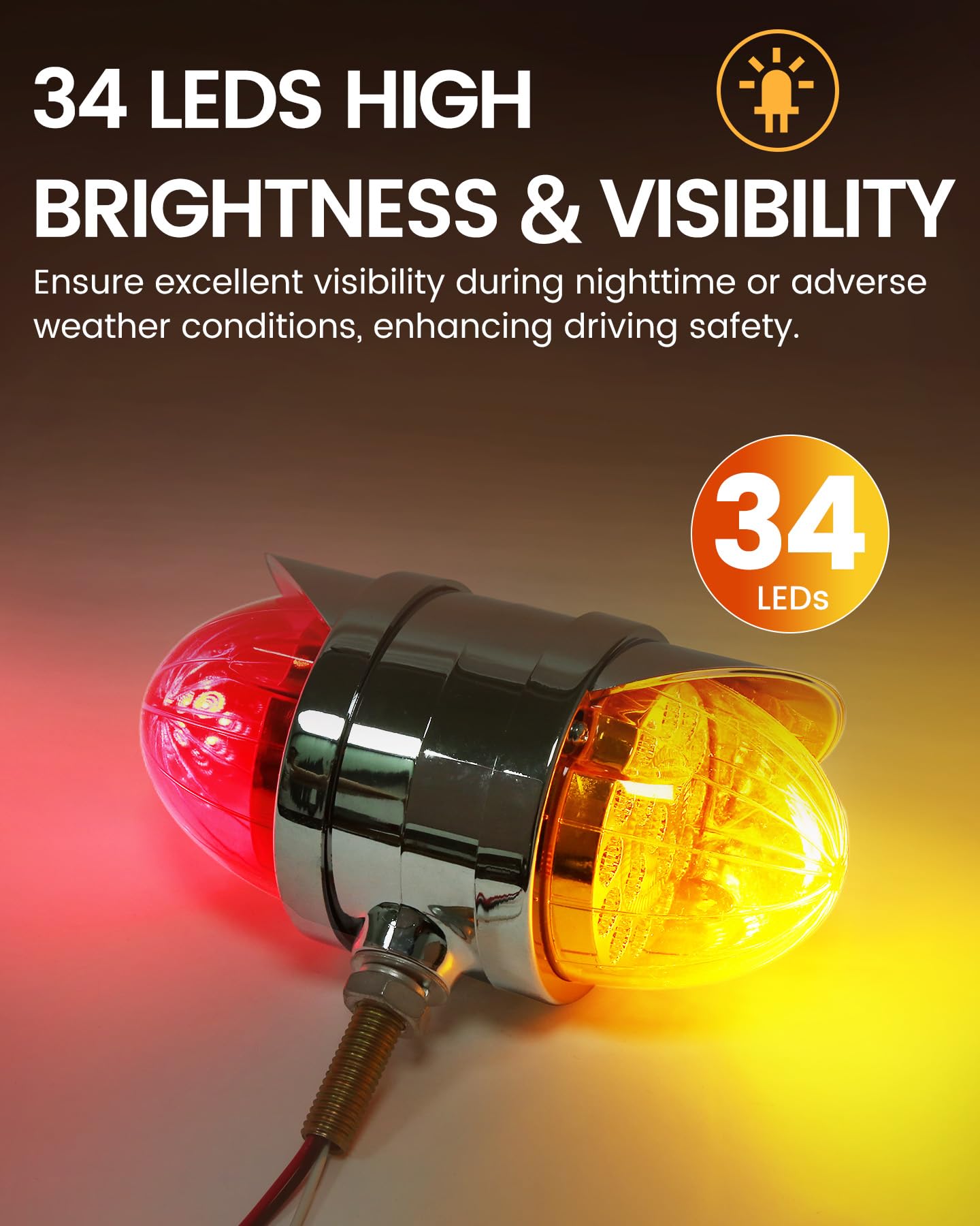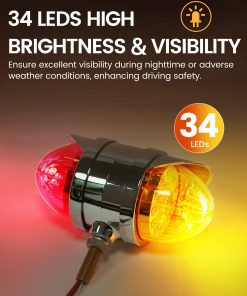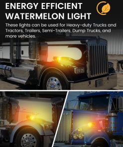 Este conjunto de luces de melón de agua de doble cara cuenta con 34 LEDs de alta intensidad que brindan una visibilidad excepcional, asegurando que su vehículo sea fácilmente reconocible en diversas condiciones climáticas. Cada juego incluye 2PCS (Ámbar delantero y Ámbar trasero) o (Ámbar delantero y Rojo trasero) luces de melón de agua. Disponibles con lentes de colores y claras, permitiéndole personalizar la apariencia basada en el look de su vehículo y sus preferencias personales. Estas luces de melón de agua para camiones semirremolques cuentan con una clasificación impermeable IP68, asegurando que son completamente sumergibles y adecuadas para condiciones climáticas adversas, lo que las hace perfectas para camiones, remolques, pickups, botes, RV, autobuses, furgonetas, camiones de volteo, vehículos recreativos, caravanas y otros vehículos. Fáciles de instalar, estas luces de defensa de doble cara adoptan un diseño de conexión de tres cables, Dimensiones: 3,5″x5,5″x7″. El cable blanco es negativo, blanco + negro es baja luminosidad y blanco + rojo es alta luminosidad. Adecuado para camiones semirremolques Freightliner, Kenworth, Peterbilt, Mack, International, Paccar, así como otros remolques, RVs, camiones semirremolques, camiones de volteo, tractores y más. El robusto armazón cromado exterior y la tecnología de sellado precisa mejoran aún más la durabilidad, garantizando un excelente rendimiento durante el uso prolongado en exteriores.