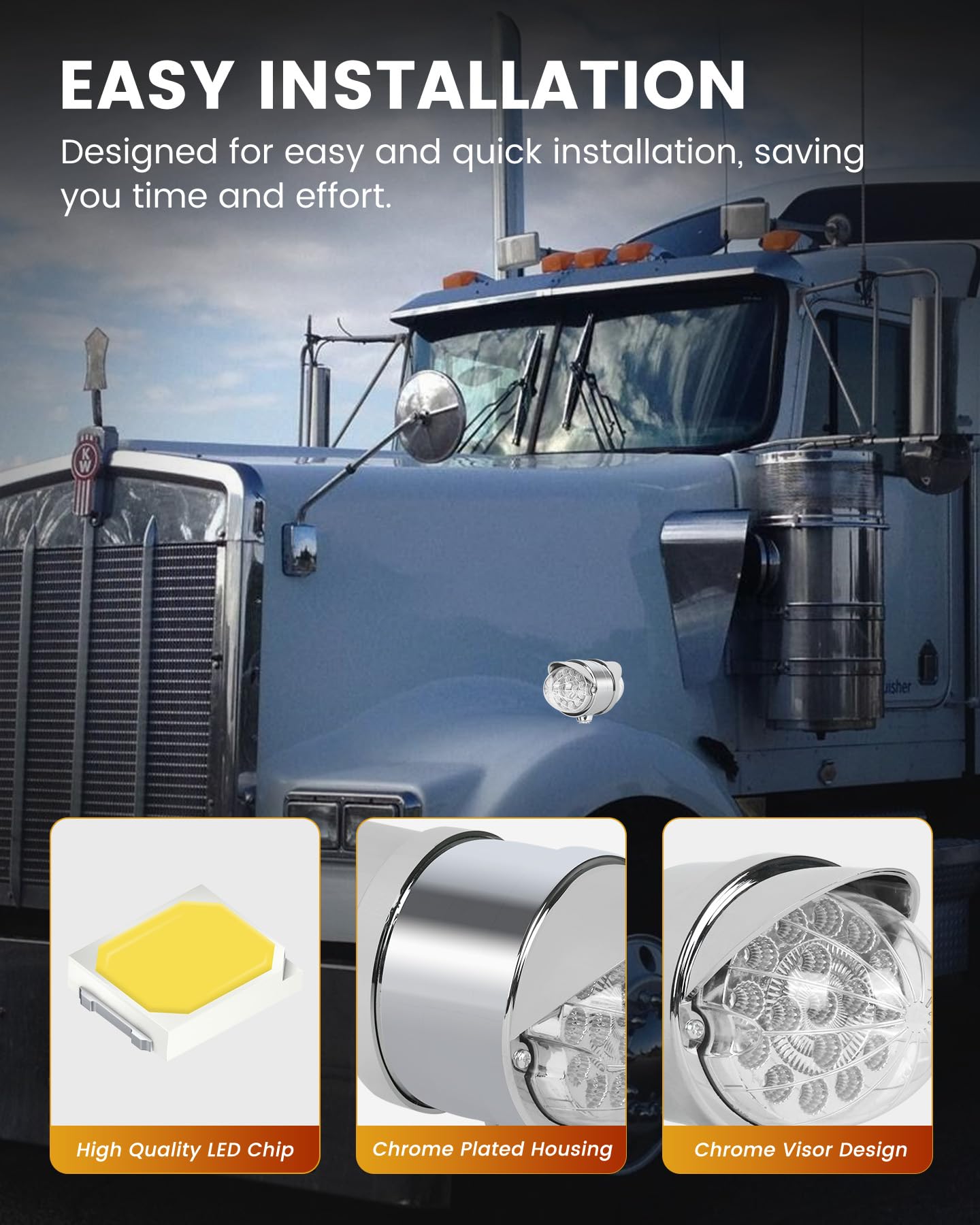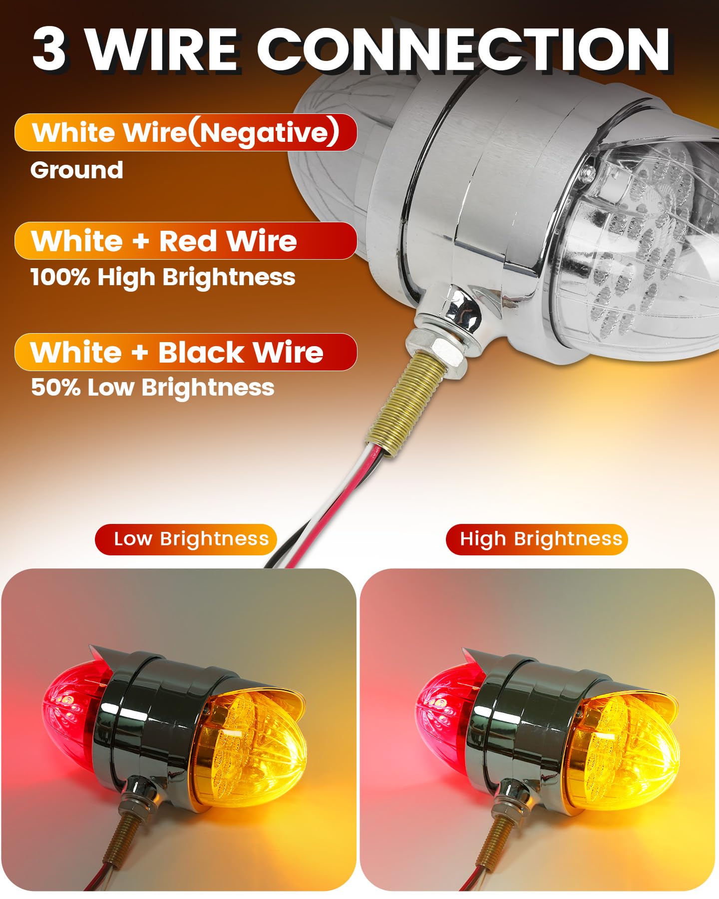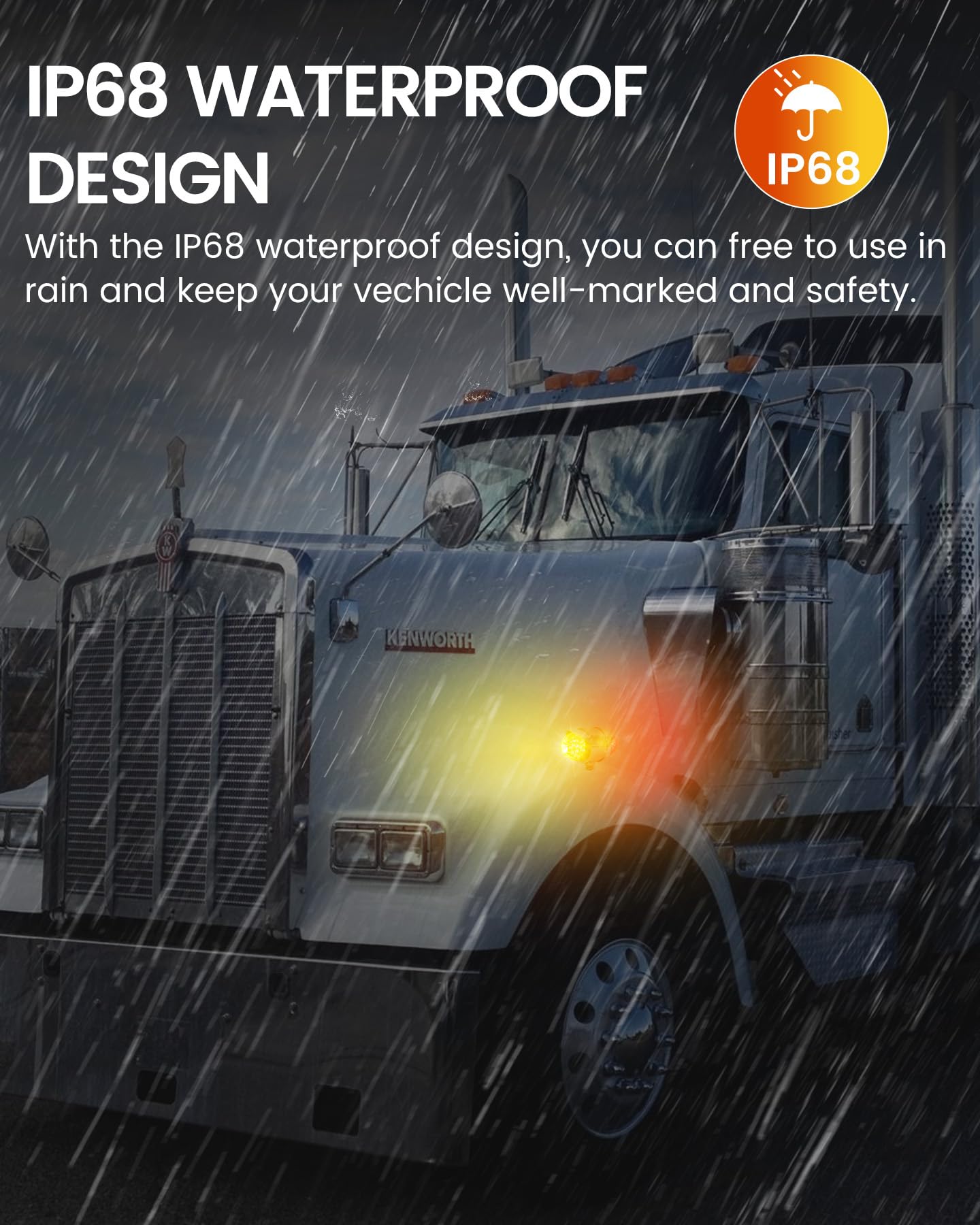 Este conjunto de luces de melón de agua de doble cara cuenta con 34 LEDs de alta intensidad que brindan una visibilidad excepcional, asegurando que su vehículo sea fácilmente reconocible en diversas condiciones climáticas. Cada juego incluye 2PCS (Ámbar delantero y Ámbar trasero) o (Ámbar delantero y Rojo trasero) luces de melón de agua. Disponibles con lentes de colores y claras, permitiéndole personalizar la apariencia basada en el look de su vehículo y sus preferencias personales. Estas luces de melón de agua para camiones semirremolques cuentan con una clasificación impermeable IP68, asegurando que son completamente sumergibles y adecuadas para condiciones climáticas adversas, lo que las hace perfectas para camiones, remolques, pickups, botes, RV, autobuses, furgonetas, camiones de volteo, vehículos recreativos, caravanas y otros vehículos. Fáciles de instalar, estas luces de defensa de doble cara adoptan un diseño de conexión de tres cables, Dimensiones: 3,5″x5,5″x7″. El cable blanco es negativo, blanco + negro es baja luminosidad y blanco + rojo es alta luminosidad. Adecuado para camiones semirremolques Freightliner, Kenworth, Peterbilt, Mack, International, Paccar, así como otros remolques, RVs, camiones semirremolques, camiones de volteo, tractores y más. El robusto armazón cromado exterior y la tecnología de sellado precisa mejoran aún más la durabilidad, garantizando un excelente rendimiento durante el uso prolongado en exteriores.
