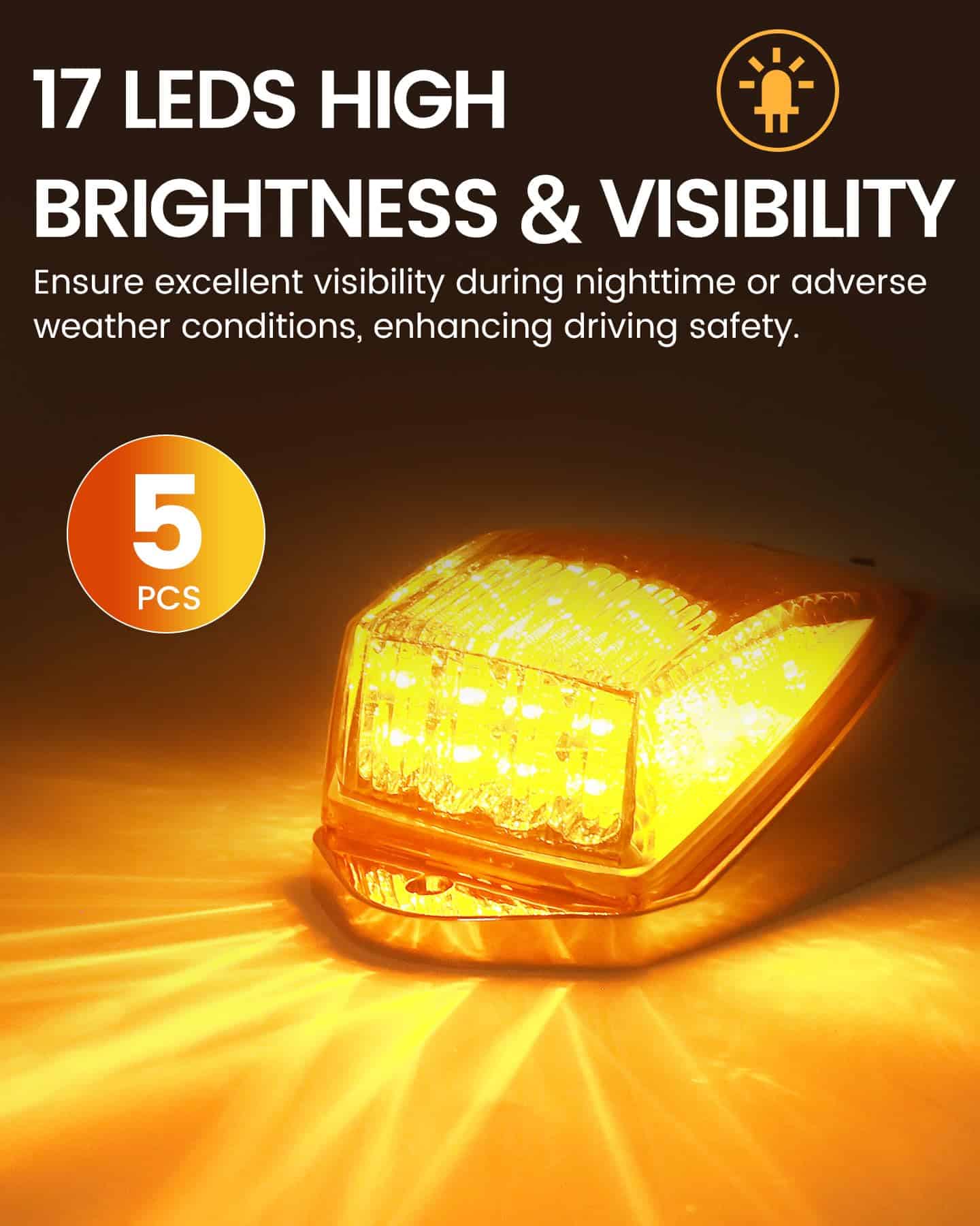1. ILUMINACIÓN DE TECHO LED BRILLANTE Y EFICIENTE ENERGÉTICAMENTE: Este conjunto de luces de techo cuenta con 17 LEDs de alta intensidad que proporcionan una visibilidad excepcional, asegurando que su vehículo sea fácilmente reconocible en diversas condiciones climáticas. Cada juego incluye 5PCS, con las luces en color ámbar.