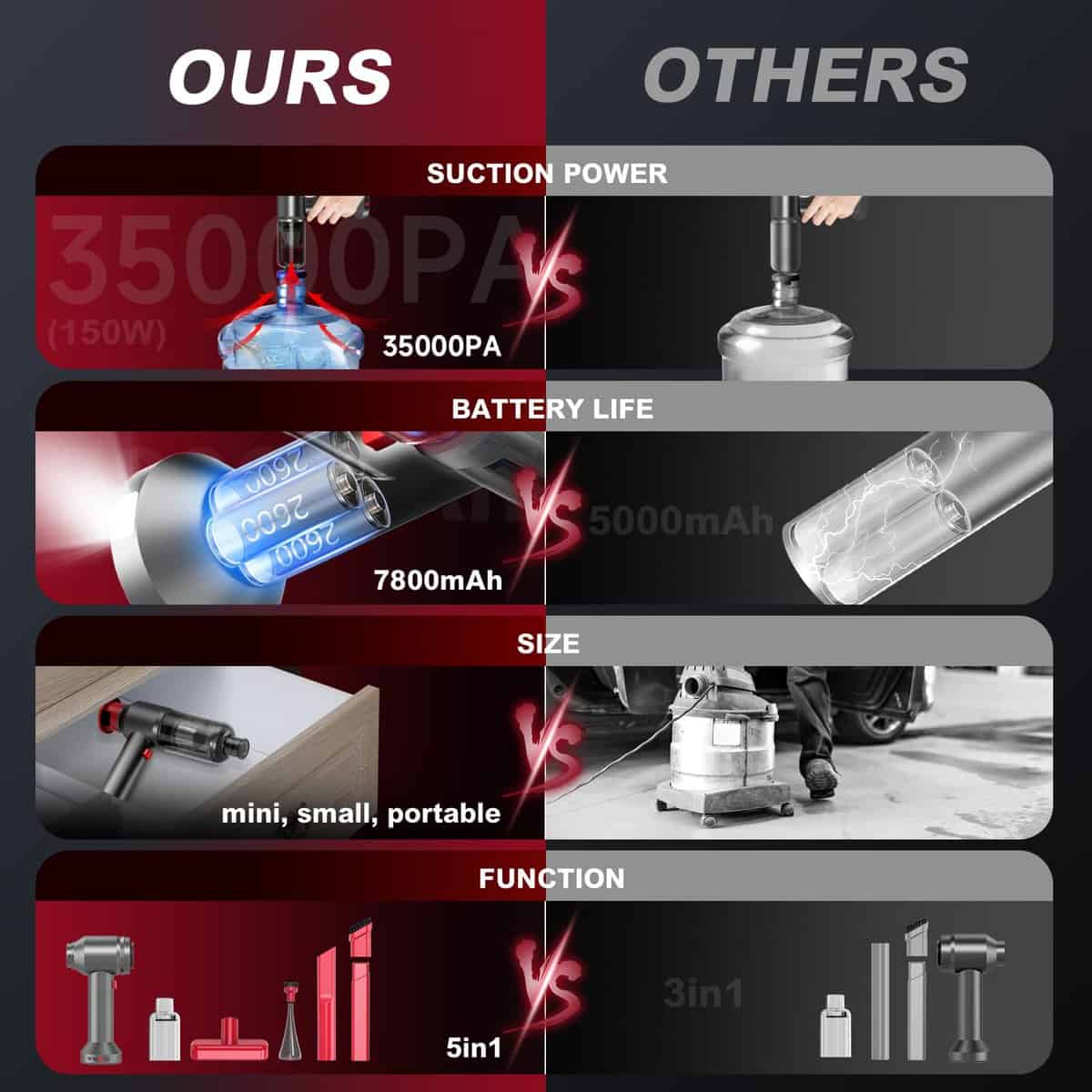 1. Potente Succión de 35000PA Este aspirador de coche inalámbrico con motor sin escobillas tiene 2 modos de succión ajustables de 13000PA y 35000PA, 150W. Cuenta con una estructura de doble turbina con una velocidad de hasta 110,000 r/min. Este aspirador de mano inalámbrico está equipado con una barra extensible y boquilla para ayudar a limpiar migas, polvo o pelo de mascotas en las grietas fácilmente.