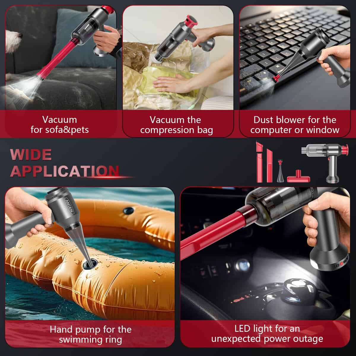 2. 5 en 1 Aspiradora Multifuncional Función de aspiración, función de soplador de polvo, función de bomba de mano y función de luz. Puede aspirar automóviles y sofás, aspirar bolsas de compresión, soplar aire para limpiar computadoras e inflar globos. La luz LED de 6000k es lo suficientemente brillante para actuar como linterna. Satisface las necesidades de varios escenarios en la vida diaria.