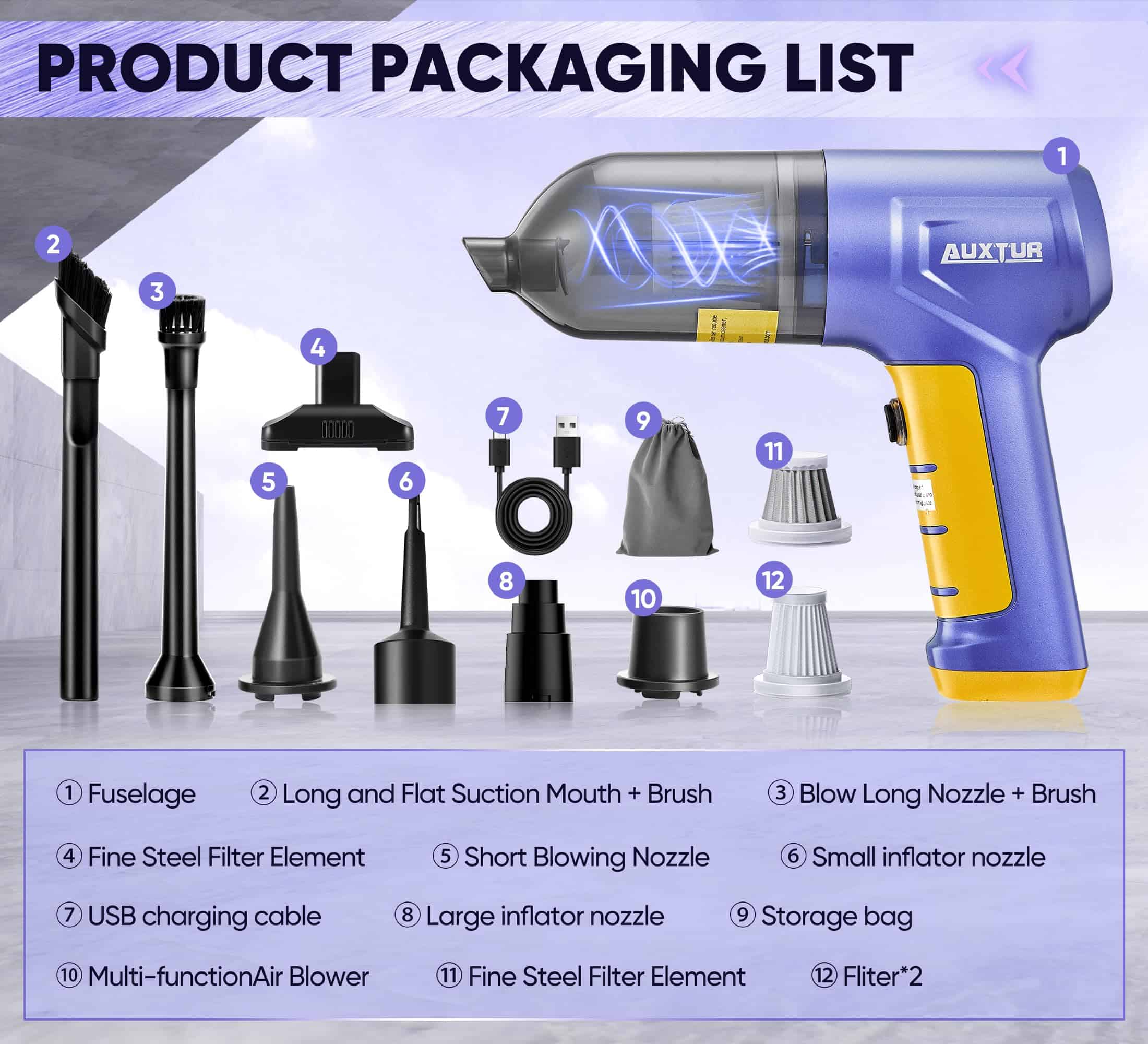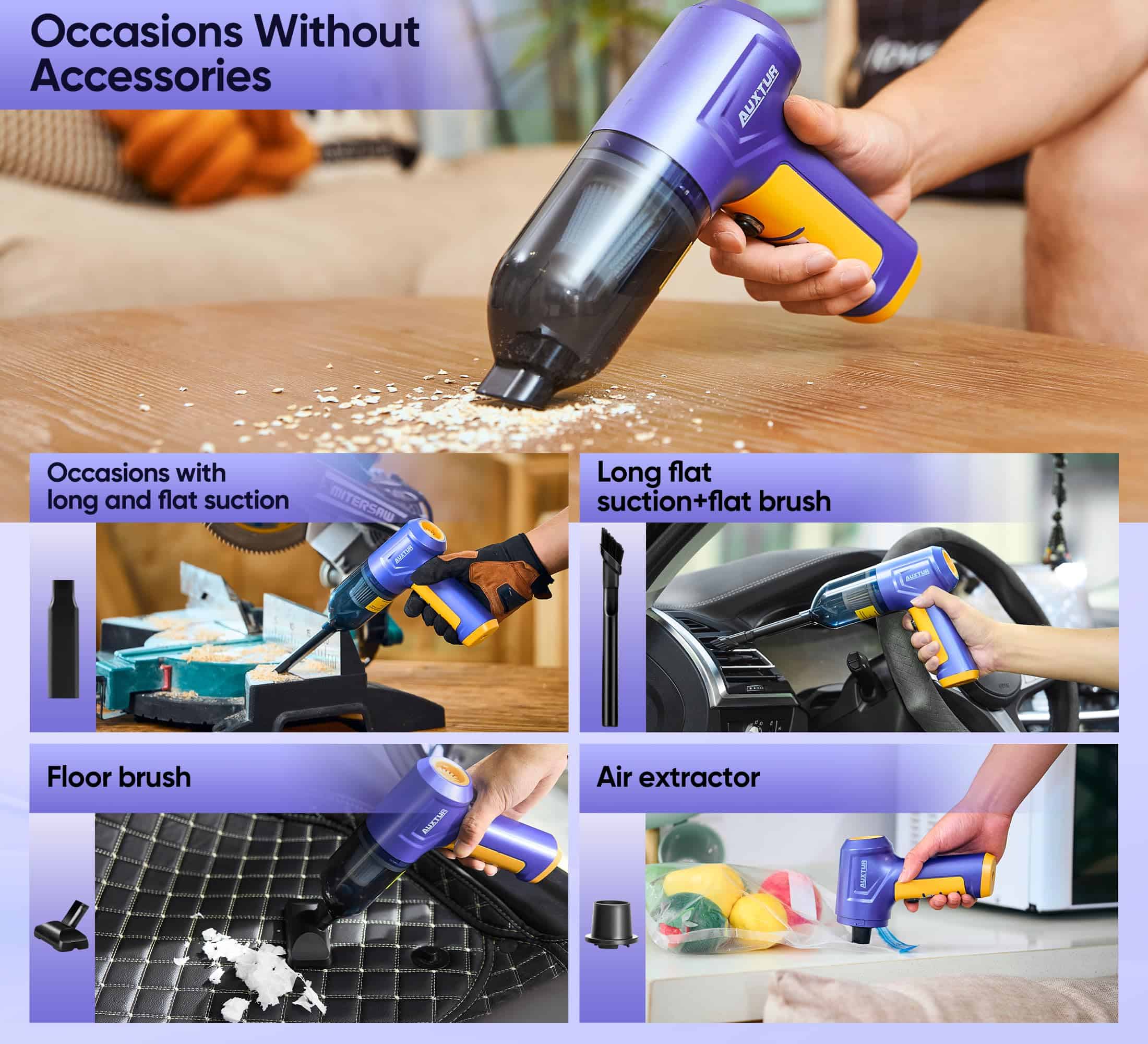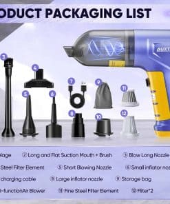 4. Componentes Incluidos Con la aspiradora de mano para coches AUXTUR viene un accesorio de cepillo, que facilita la limpieza de cada recoveco de tu coche. Su factor de forma permite un agarre cómodo, asegurando una limpieza sin esfuerzo. Esta aspiradora de coche de alta potencia es perfecta para los entusiastas del coche que quieren una mini aspiradora que proporcione una limpieza potente. La aspiradora portátil para alfombras es ligera y fácil de maniobrar, lo que la hace ideal para limpiar interiores de coches. No se limita solo a los coches, ya que esta versátil aspiradora también se puede utilizar como aspiradora para colchones, asegurando que tu espacio para dormir se mantenga fresco y limpio.