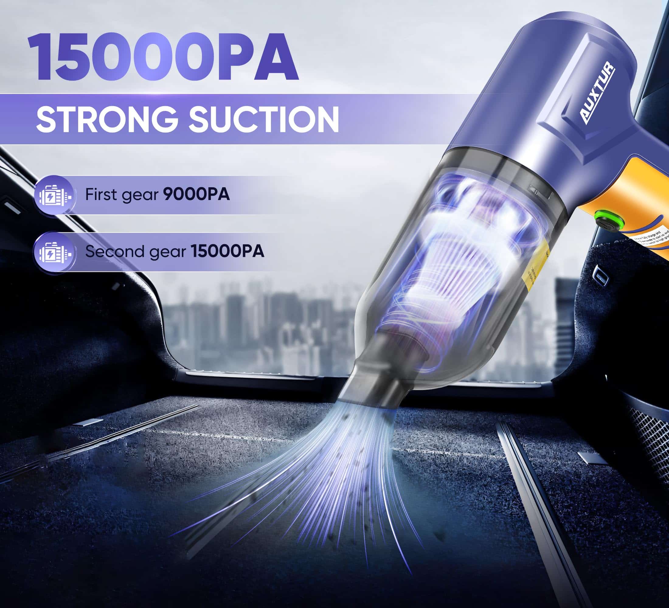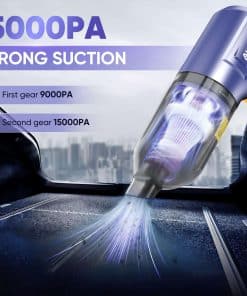 3. Alta Potencia de Succión La aspiradora de mano inalámbrica AUXTUR Con una fuerte potencia de succión de 15000PA, esta aspiradora de mano para coches aspira rápidamente y sin esfuerzo la suciedad y el pelo del interior de tu coche, dejándolo impecable y fresco. Es una aspiradora de coche compacta y ligera, lo que la hace fácil de usar y maniobrar. Ya sea que necesites limpiar la tapicería de tu coche, alfombras o incluso colchones, este kit de limpieza de coche portátil es versátil y conveniente. Mantén tu coche y tu casa frescos y limpios con las avanzadas características de esta aspiradora de mano.