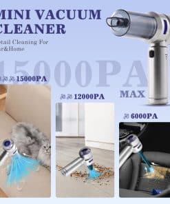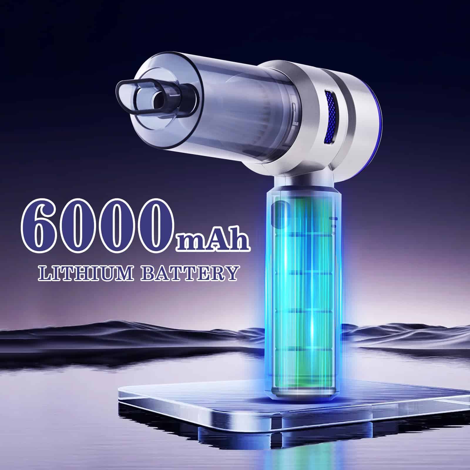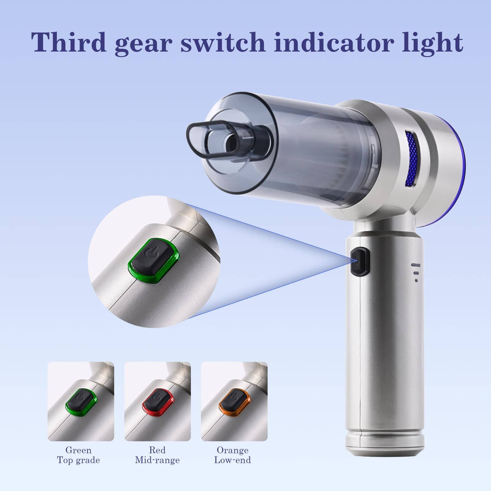 Aspiradora Multifuncional 4 en 1: La aspiradora portátil está equipada con una amplia gama de accesorios, que pueden hacer perfectamente el trabajo de aspirar, soplar, inflar y extraer. La aspiradora inalámbrica se puede utilizar para limpiar asientos de coche, tableros, alfombras, huecos, ventilaciones de aire y cualquier otro lugar sin dejar residuos. No solo para la limpieza, la aspiradora también se puede usar para inflar anillos de natación, como un ventilador para barbacoas y para desinflar bolsas de almacenamiento al vacío. Motor sin Escobillas Potente de 3 Marchas: La lata de aire comprimido presenta un motor potente y 3 velocidades de viento, garantizando una eliminación eficiente del polvo con tiempos de funcionamiento variables: Marcha-1 durante 35 min; Marcha-2 durante aproximadamente 20 minutos; Marcha-3 durante aproximadamente 15 minutos. Filtro HEPA Reutilizable y Lavable: Viene con 1 filtro HEPA, que filtra el polvo fino durante el uso y se puede lavar y reutilizar fácilmente. También viene con un recipiente de polvo de gran capacidad de 400 ml. El diseño transparente le permite ver claramente el proceso de recolección de polvo y le recuerda cuándo necesita vaciarse. Es fácil de girar y quitar para vaciar fácilmente. El diseño de cierre giratorio es más seguro para que no tenga que preocuparse por derrames de polvo. Mantenga su coche y su hogar impecables Nuestra aspiradora inteligente inalámbrica es la herramienta perfecta para limpiar su coche y su hogar en cualquier momento y lugar.