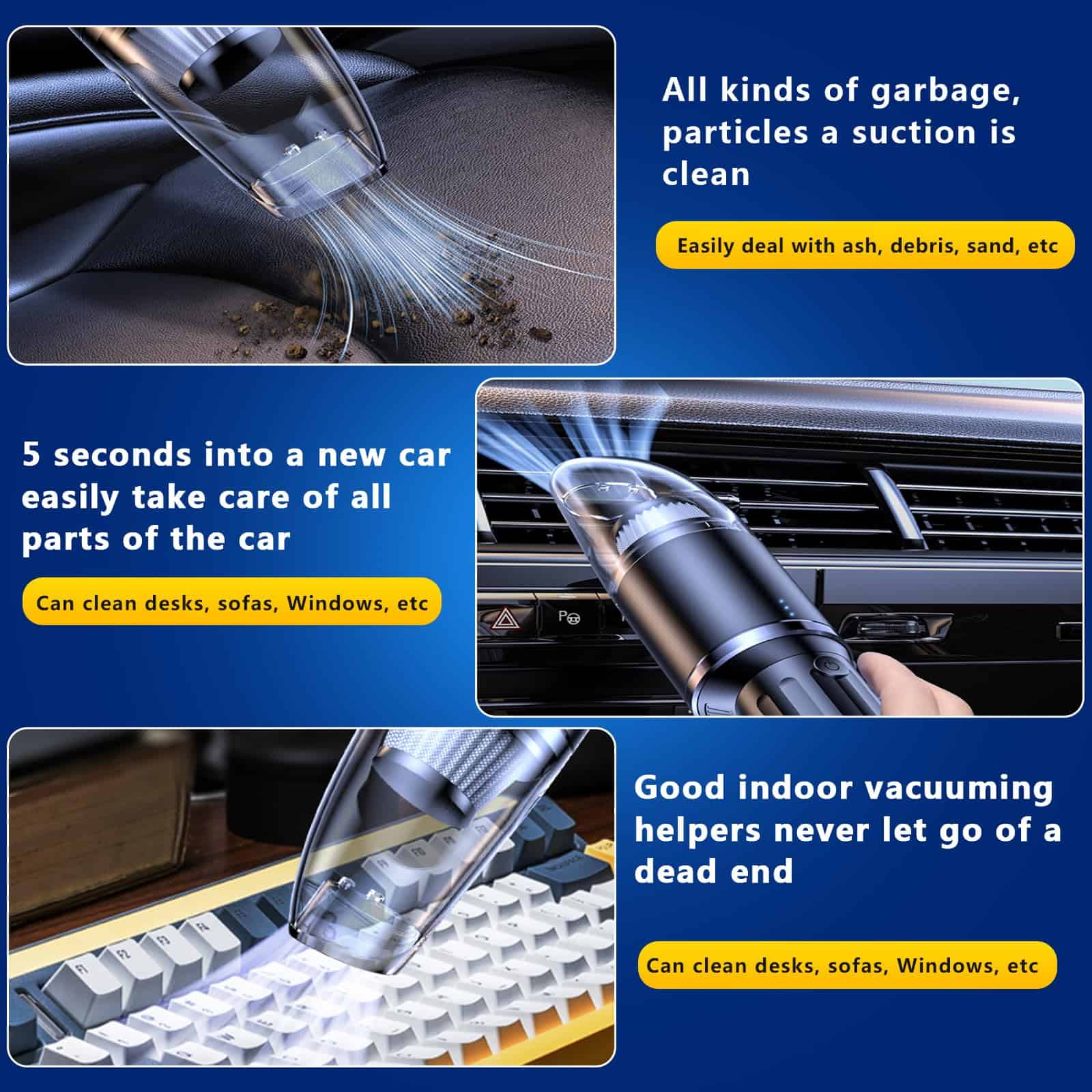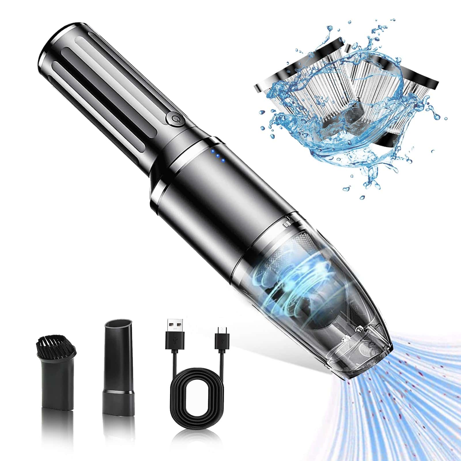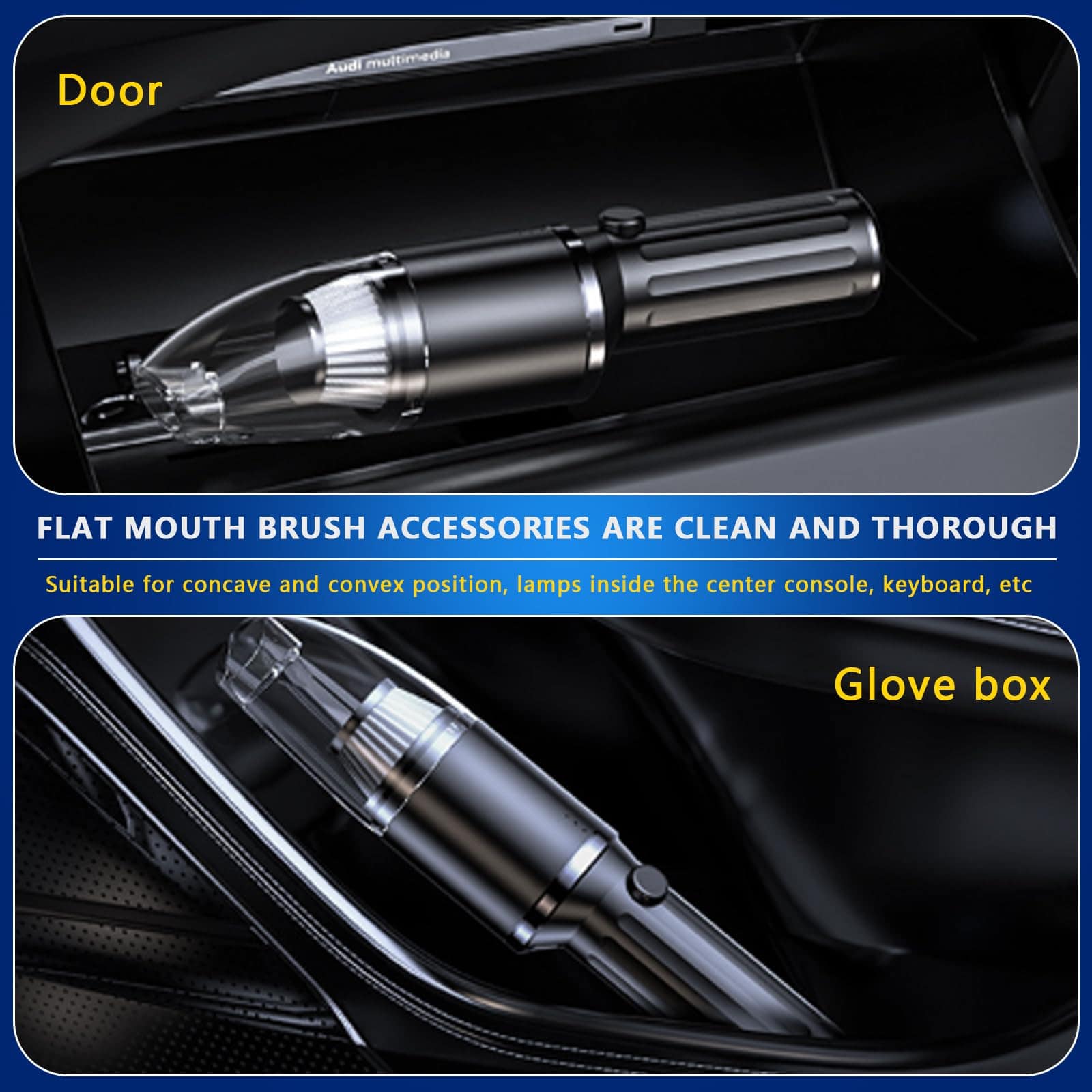 1. Boquilla de succión extendida: adecuada para limpiar diversos huecos como puertas de automóviles, asientos, esquinas de gabinetes, cajones y ceniceros.