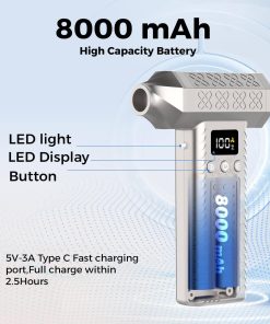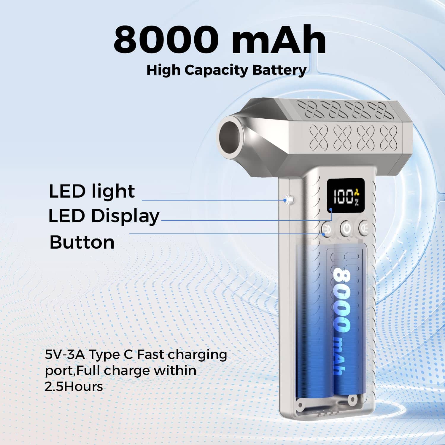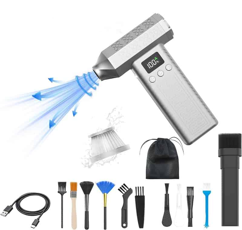 Nuestra aspiradora de aire comprimido VITSR es una herramienta versátil y potente que le permitirá limpiar de manera eficiente y rápida todo tipo de equipos y superficies, tanto en interiores como en exteriores. Con un motor de nueva tecnología de 200000 RPM, esta aspiradora eléctrica le proporciona un potente flujo de aire para limpiar escombros y polvo a fondo. Además de funcionar como un soplador de aire, también se puede utilizar como una mini aspiradora inalámbrica para eliminar el polvo y los residuos de cualquier dispositivo electrónico, teclado de computadora u otras superficies en su automóvil, hogar u oficina. Gracias a su diseño ligero y portátil, podrá llevar esta aspiradora a cualquier lugar y utilizarla para una variedad de tareas, como limpiar escritorios, teclados, lentes de cámara, computadoras portátiles, asientos de automóvil y persianas. También puede inflar camas, botes salvavidas, limpiar pisos o aspirar bolsas de vacío de manera rápida y eficiente. La aspiradora de mano viene con una batería de alta capacidad de 8000mAh para una autonomía de hasta 1 hora con una carga completa, y se carga rápidamente a través de USB-C en solo 2 horas. Además, su motor sin escobillas proporciona una succión potente de 10000pa en modo máximo, eliminando polvo, migas, pelo de mascotas y otros desechos grandes en segundos. Incluimos un juego de cepillos y una bolsa de almacenamiento con su pedido para que tenga todo lo necesario para empezar a limpiar de inmediato. Si tiene alguna pregunta sobre nuestro producto, no dude en ponerse en contacto con nosotros. Estamos aquí para ayudarlo.