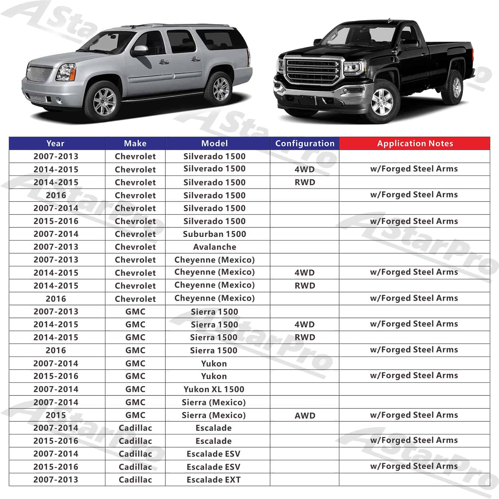 Brazos de control superiores delanteros de calidad premium ASTARPRO con articulaciones esféricas de reemplazo para vehículos Chevy, GMC, Cadillac. Este juego de 2 piezas incluye un brazo de control superior del lado del conductor y un brazo de control superior del lado del pasajero. Los brazos de control están fabricados con acero forjado para mayor resistencia y durabilidad. Los bujes de control de caucho natural premium garantizan una conducción suave y silenciosa. Las articulaciones de bola servibles con engrasador aseguran una vida útil más larga, mientras que la bota de bloqueo evita que los contaminantes entren y dañen las articulaciones. Compatible con varios modelos de Cadillac Escalade, Chevrolet Avalanche, Chevy Silverado, Suburban, Tahoe, GMC Sierra, Yukon y más. Número de OE: 15096197, 25812725, 15096198, 25812726, 521-023, 521-024, RK80669, RK80670.