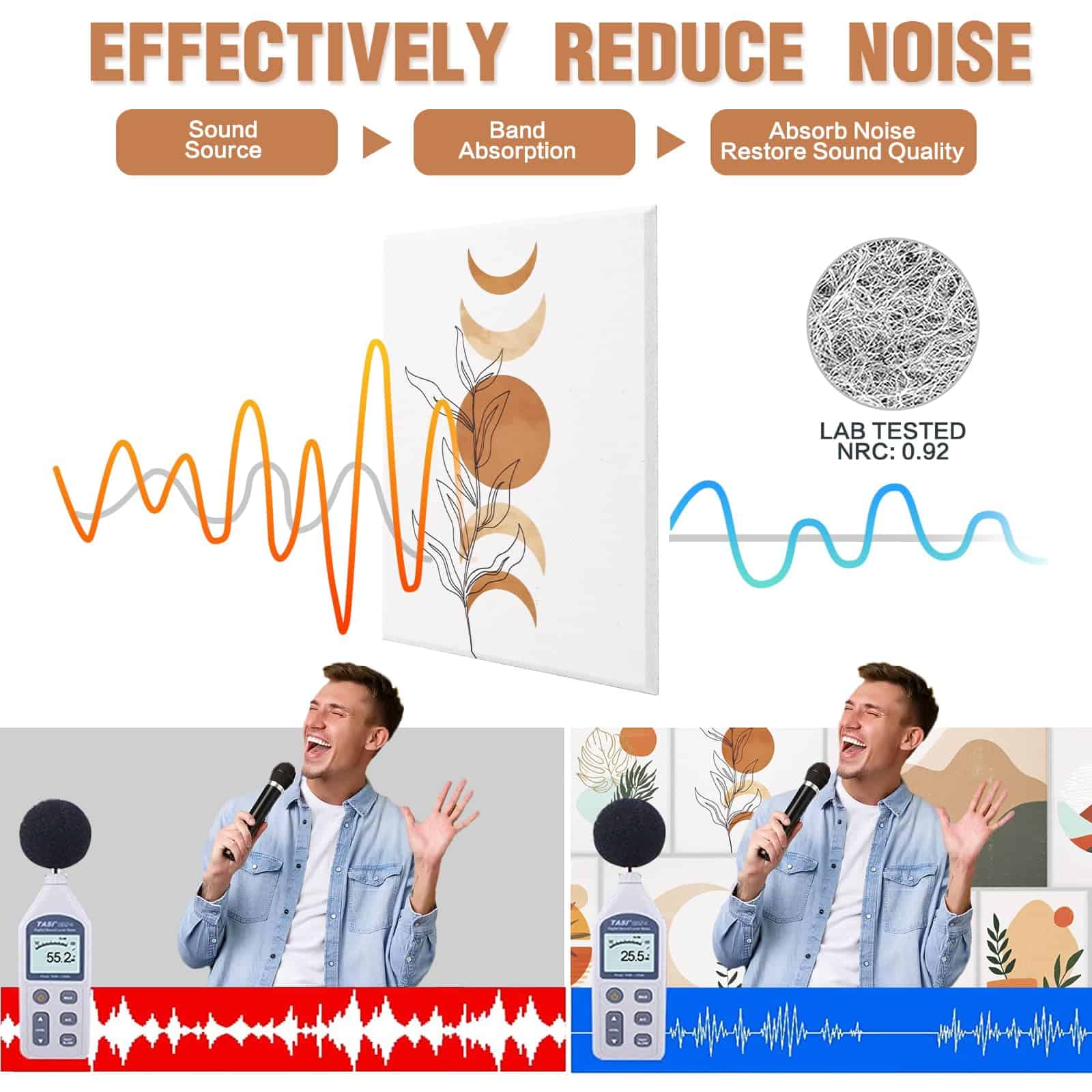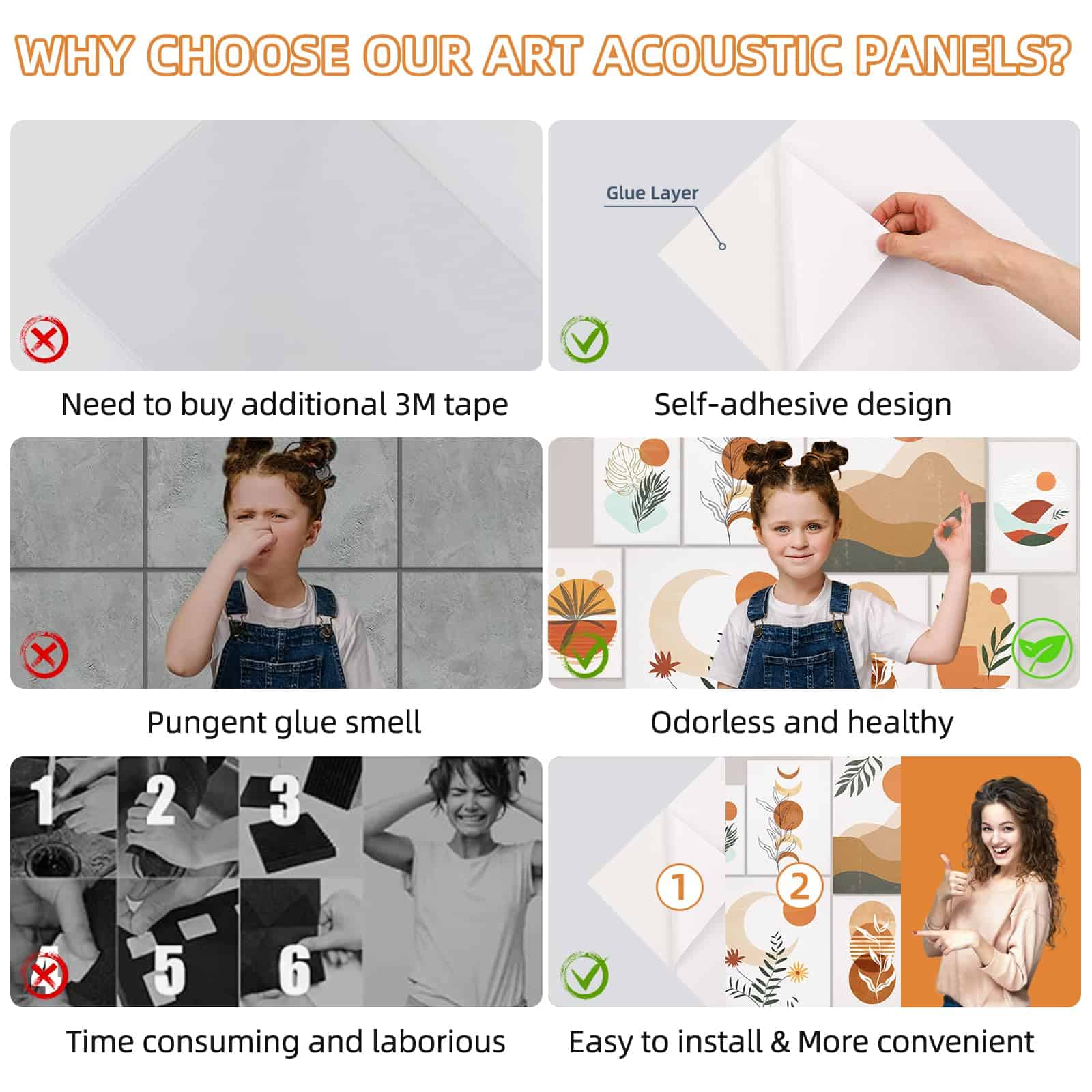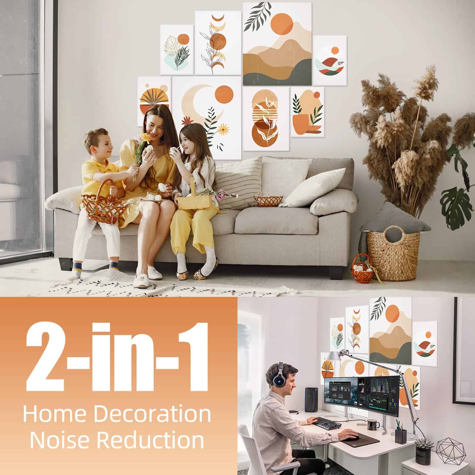 1. PAQUETE INCLUYE: Recibirás 8 piezas de paneles de pared absorbentes de sonido de estilo bohemio, con 3 tamaños diferentes de paneles autoadhesivos disponibles. Puedes consultar el diagrama de tamaños, donde elementos como hojas, siluetas de montañas y puesta de sol están perfectamente integrados, creando un rico sentido de diseño. Al combinar absorción de sonido y reducción de ruido con decoración de pared, puedes agregar color y destaques de diseño a tu espacio. 2. AUTOADHESIVO Y FÁCIL INSTALACIÓN: La parte trasera de cada panel absorbente de sonido está cubierta con una capa de adhesivo autoadhesivo, nuestro panel de pared de sonido se puede pegar a cualquier superficie plana, seca y libre de polvo. 3. REDUCCIÓN DE RUIDO EFECTIVA: Coeficiente de reducción de ruido: 0.92, paneles de pared insonorizantes de densidad de 9,7 lb/ft. Esto significa que nuestros paneles acústicos son mejores que los paneles de espuma en la reducción de ruido, reduciendo la reverberación y absorbiendo el eco, y también tienen un efecto significativo en mejorar la claridad y calidad del sonido. 4. SEGURIDAD DEL MATERIAL Y AMPLIAMENTE UTILIZADO: Material de fibra de poliéster de alta calidad al 100%. Nuestros paneles son no tóxicos, inodoros, retardantes de llama, resistentes a la decoloración, resistentes a impactos, transpirables y el contacto con ellos es seguro, y se pueden utilizar ampliamente en dormitorios, salas de estar, salas de grabación, oficinas, salas de ensayo, etc. 5. GARANTÍA DE SERVICIO POST-VENTA: Te proporcionaremos un servicio post-venta de alta calidad. Si no estás satisfecho con el producto o si hay algún problema con tu pedido, no dudes en contactarnos en cualquier momento. Nuestro equipo de servicio al cliente profesional te proporcionará asistencia profesional.