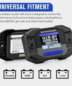 El monitor de batería ATEM POWER está diseñado para adaptarse a una amplia gama de baterías, desde litio hasta plomo-ácido (AGM, gel, húmedas) e incluso hidruro de níquel-metal. Con este monitor de batería, puedes mejorar el rendimiento y la longevidad de tu batería en sistemas de energía solar, vehículos recreativos, 4WD o embarcaciones.