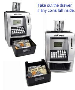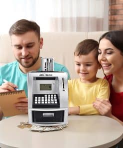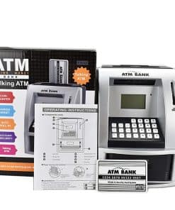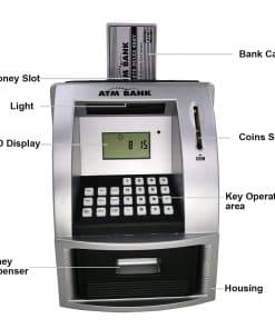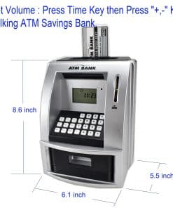 Enseñando a Tu Hijo a Ahorrar Dinero Comienza su educación financiera temprano 1. Discutir Deseos vs. Necesidades 2. Permitirles Ganar su Propio Dinero 3. Establecer Metas de Ahorro 4. Proporcionarles un Lugar para Ahorrar 5. Hacer un Seguimiento de los Gastos 6. Ofrecer Incentivos de Ahorro Características del Producto: 1. Reconocimiento de monedas, ingrese la cantidad de billetes para depositar dinero; 2. Utilice tarjeta y contraseña para retirar dinero, la cantidad retirada debe ser menor que el saldo de la cuenta; 3. El saldo se actualiza automáticamente después de depositar y retirar dinero; 4. Configuración y consulta de objetivos de depósito; 5. Modificación de contraseña, puede establecer su propia contraseña de 4 dígitos; 6. Cajón cerrado con llave electrónica; 7. Indicación de voz en inglés, puede ajustar el volumen, puede silenciar; 8. Memoria incorporada, guarda: saldo, objetivo, despertador; 9. Incluye: reloj, despertador, calculadora, con indicaciones de voz en inglés. Paquete incluido: 1 Hucha de Ahorro ATM, 2 Tarjetas Bancarias para operar el cajero automático y manual de instrucciones. Se requieren 3 pilas AA (no incluidas).
