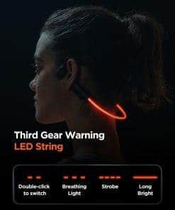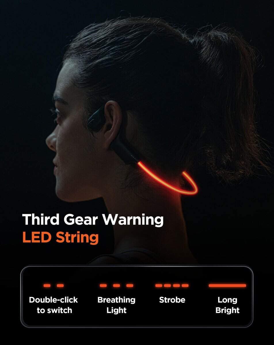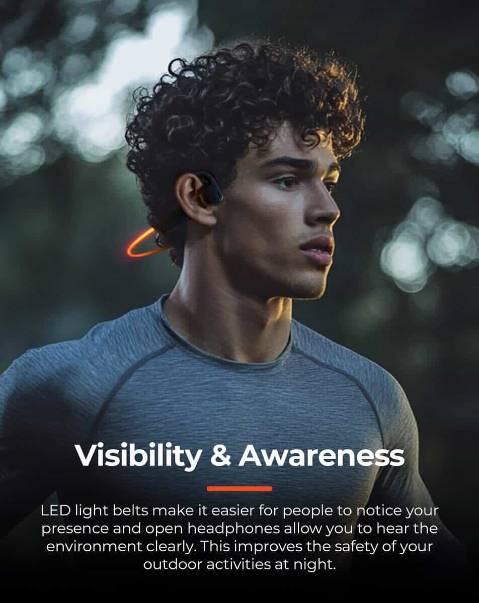2. Ilumina tu noche: Imagínate corriendo por la noche. Nuestros audífonos cuentan con una tira de luz LED que no solo se ve genial, sino que también garantiza que seas visible para los demás. Elige entre modos de luz constante, intermitente o respiración para adaptarse a tu estado de ánimo y entorno, haciendo tus actividades nocturnas más seguras y divertidas.