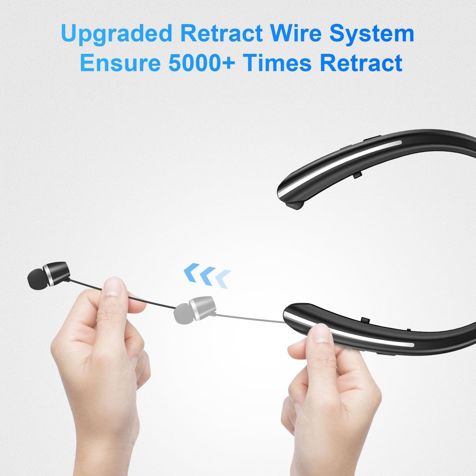 3. Diadema ergonómica y auriculares retráctiles. Peso de solo 1.5 oz ultra ligero y flexible cuello ergonómico, puedes llevar los auriculares en tu cuello cómodamente. Además, adoptamos un alambre de alta calidad en este sistema retráctil, el alambre se puede retraer más de 5000 veces. Calidad premium, portátil y conveniente de usar.