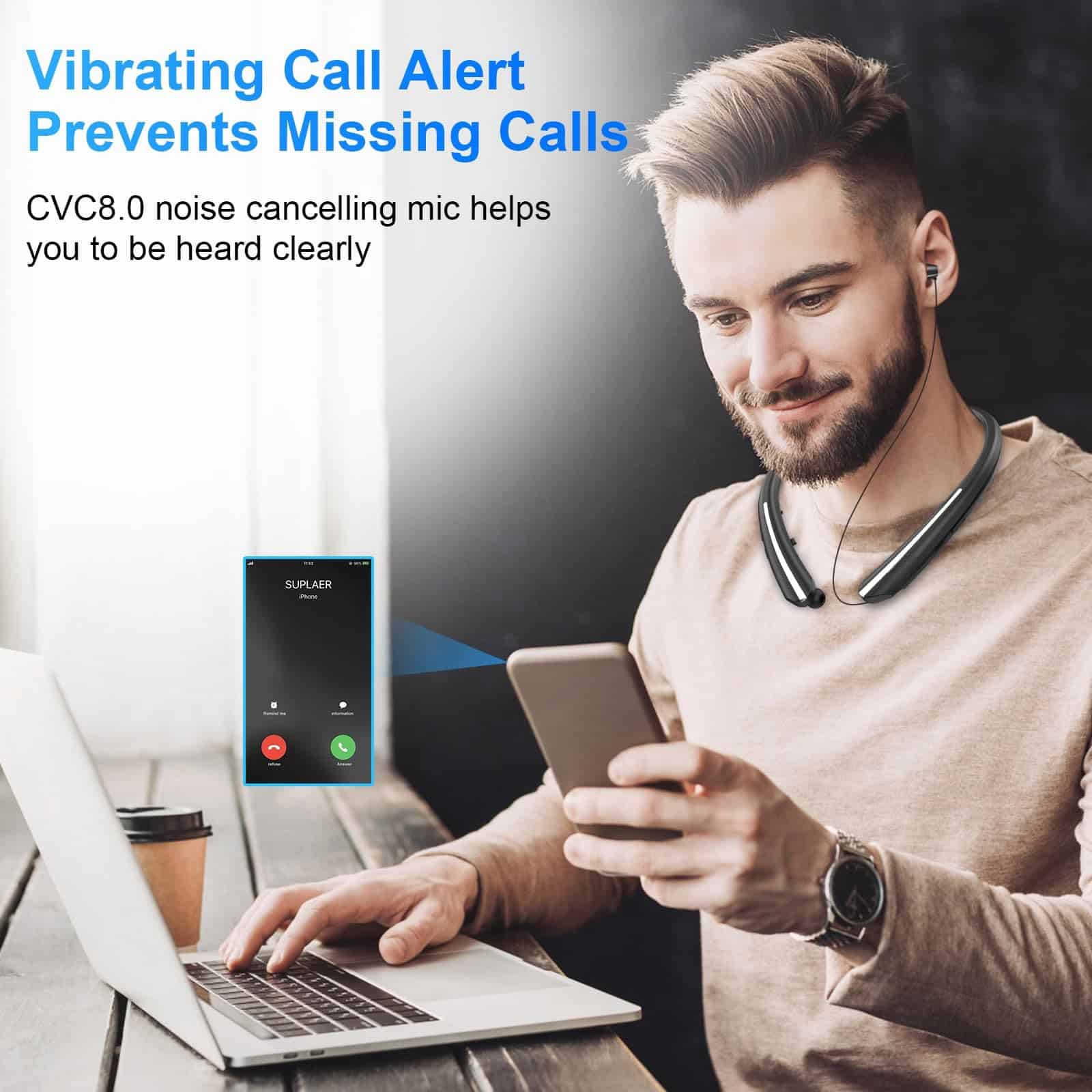 4. Resistente al sudor IPX5 y llamadas manos libres. Los auriculares Bluetooth deportivos son resistentes al sudor IPX5, perfectos para correr, hacer senderismo, andar en bicicleta, hacer fitness, gimnasio, etc. Además, los auriculares Bluetooth de banda para el cuello te recordarán mediante vibración cuando haya una llamada entrante, nunca te perderás ninguna llamada incluso si estás en un entorno ruidoso o haciendo ejercicio.