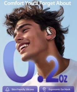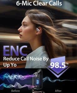 1. Extremadamente cómodo y ajuste seguro. Nuestros audífonos están diseñados para no causar dolor. El auricular pesa solo 8,5 g, y la superficie exterior es de un material de silicona líquida amigable con la piel. El gancho para la oreja está incrustado con metal de memoria flexible para un ajuste seguro. 2. Rendimiento de sonido superior 17 altavoces grandes de 12 mm que proporcionan un audio de conducción aérea completo y rico. Con un algoritmo de mejora de frecuencias medias y bajas, estos auriculares ofrecen una salida de audio bien equilibrada, creando una experiencia de audio inmersiva. 3. Mantenga la conciencia del entorno Nuestros auriculares de oído abierto le permiten mantenerse conectado con su entorno mientras disfruta de su música favorita. Manténgase en sintonía con el mundo exterior durante el trabajo y las actividades al aire libre. 4. Vida útil de la batería extendida y conveniente pantalla LED La vida útil de la batería extendida y la conveniente pantalla LED le permiten verificar fácilmente la energía restante de ambos auriculares y el estuche de carga. 40 horas de tiempo de reproducción le permiten disfrutar de la música sin ansiedad por la batería. 5. Cancelación avanzada de ruido con tecnología ENC (cancelación de ruido ambiental), estos auriculares reducen significativamente el ruido de fondo durante las llamadas, brindando una experiencia excepcional de llamadas en entornos diarios y comerciales. Tenga en cuenta que si bien ENC mejora la claridad de la llamada, no está diseñado para la cancelación activa de ruido durante la reproducción de música