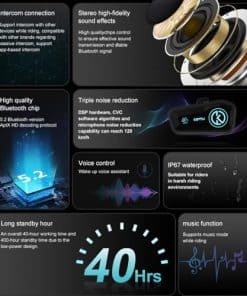 Disfruta de una claridad de sonido superior y una experiencia de audio envolvente con los audífonos Bluetooth para motocicleta KEVTU K3S. Este auricular está diseñado para ser resistente al agua, lo que te permite disfrutar de tu música favorita incluso en condiciones húmedas. Además, con la conveniente función de carga TYPC, podrás cargar tu auricular K3S fácilmente en cualquier momento y lugar. No más molestias con el ruido de fondo no deseado mientras conduces, gracias a la avanzada tecnología de cancelación de ruido de este auricular. Su batería de 1000 mAh proporciona una larga duración en espera, asegurando que tengas música y comunicación ininterrumpidas a lo largo de tu viaje. El auricular K3S también ofrece soporte para llamadas manos libres, reproducción de música y navegación GPS, brindándote una experiencia completa y conveniente mientras estás en la carretera.