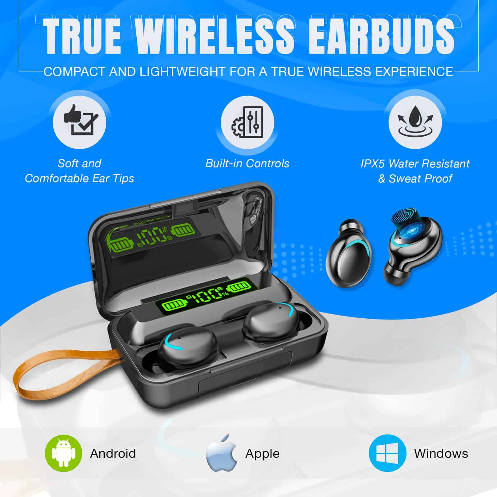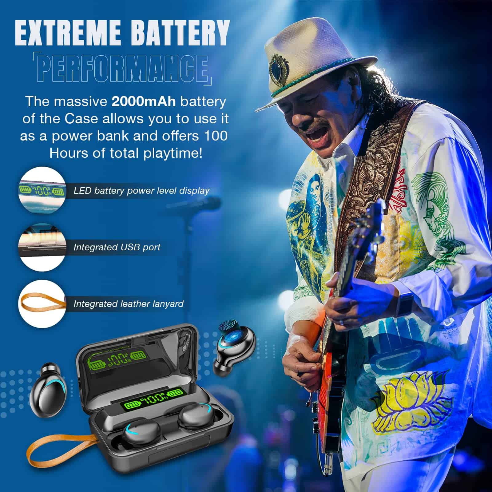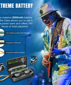 1. AUDÍFONOS INALÁMBRICOS VERDADEROS QUE FUNCIONAN COMO POWERBANK: ¡Presentamos los audífonos inalámbricos Santana Bembele que funcionan como un Powerbank de 2000mAh y ofrecen hasta 100 horas de tiempo total de reproducción! Sin cables que te detengan, puedes moverte libre y cómodamente. Y cuando tu teléfono u otros dispositivos se queden sin batería, simplemente utiliza la función de Powerbank para darles un impulso. Nuestros audífonos están equipados con una pantalla de nivel de batería LED, lo que facilita el seguimiento de tu vida útil de la batería.