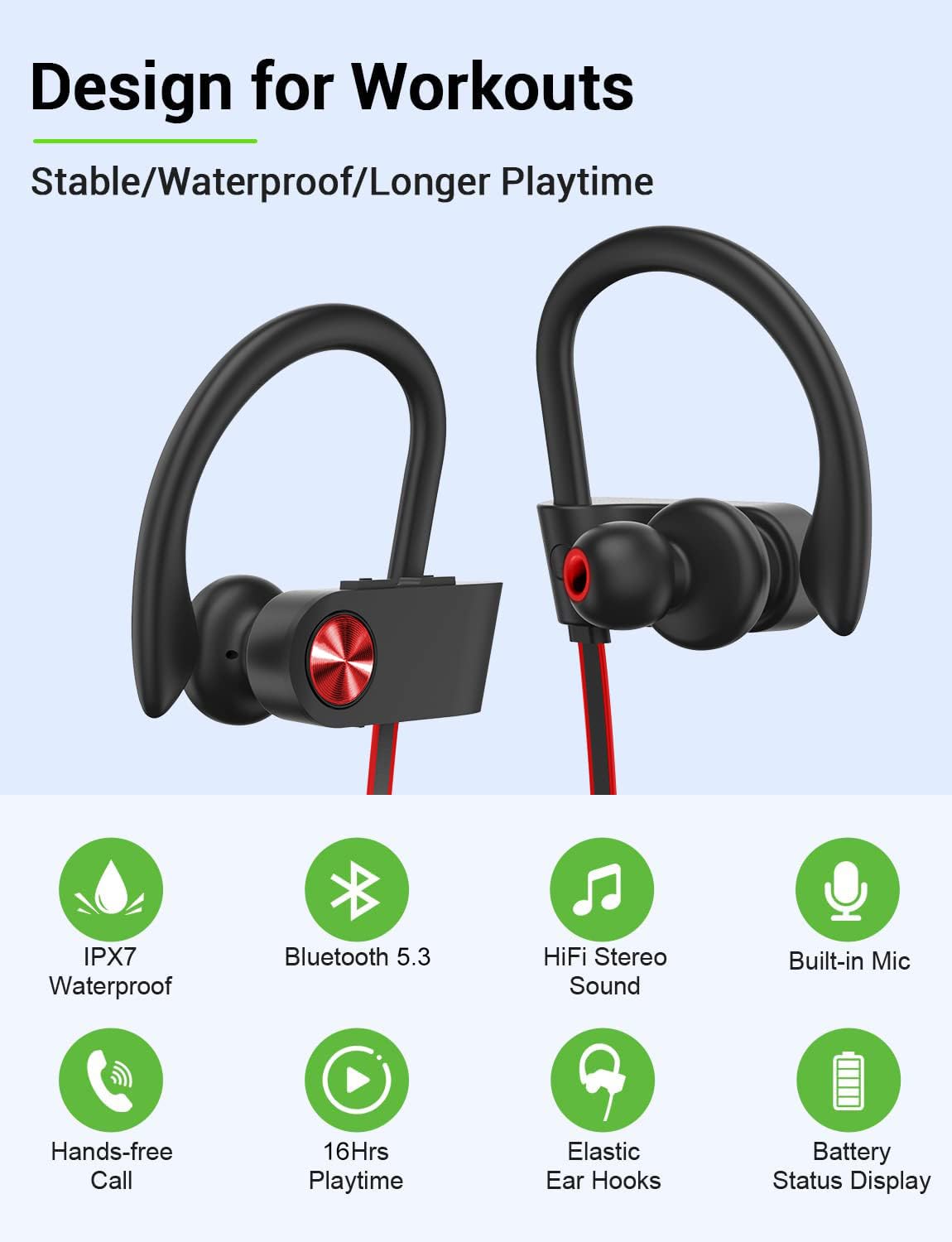 Nuestros audífonos Bluetooth V5.0 ofrecen una conexión rápida a dispositivos previamente conectados, baja latencia, bajo consumo de energía y un sonido más claro y estable. Con controladores dinámicos y chip CSR, estos audífonos inalámbricos ofrecen un sonido auténtico y bajos potentes. La tecnología de micrófono con cancelación de ruido CVC6.0 filtra mejor el ruido de fondo y captura tu voz de forma clara. Con calificación IPX7 a prueba de agua y tecnología de nano-revestimiento interior, nuestros audífonos de ejercicio pueden resistir eficazmente el sudor o la lluvia, garantizando un buen funcionamiento y seguridad durante el entrenamiento. La batería recargable de estos audífonos Bluetooth ofrece hasta 16 horas de reproducción con solo 2 horas de carga. Se mostrará la energía restante de los audífonos en la pantalla de tu teléfono. Con un diseño ligero y ergonómico, estos audífonos deportivos son una excelente combinación de comodidad y estabilidad con ajuste en la oreja y gancho para deporte diseñados para entrenamientos extenuantes en exteriores o en casa. Viene con 4 tamaños de almohadillas para los oídos (XS/S/M/L) para adaptarse perfectamente a tu oreja.
