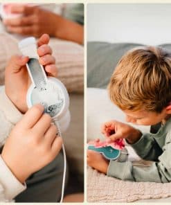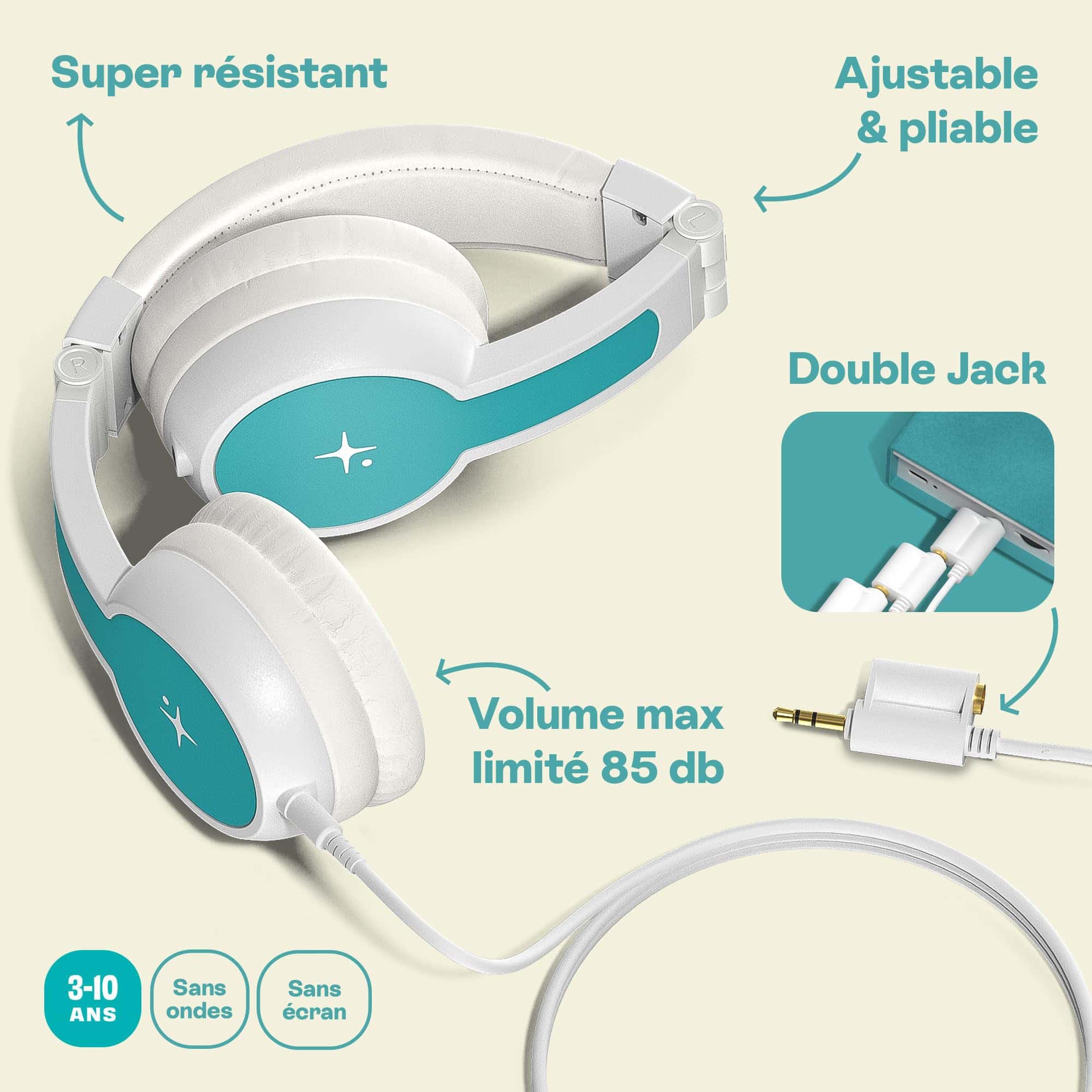 Ajuste perfecto para oídos más pequeños, audífonos diseñados para niños (Edades 3+). Ultra resistente, plegable y ajustable. El volumen máximo está limitado a 85 dB (recomendación de la OMS) para proporcionar una experiencia auditiva segura. Personalizable con pegatinas de personajes HoomKid incluidas en el paquete. Compartir es más fácil con un doble jack, conectable a cualquier otro par de audífonos, se puede usar en cualquier lugar: en el coche, en el tren o en el avión.