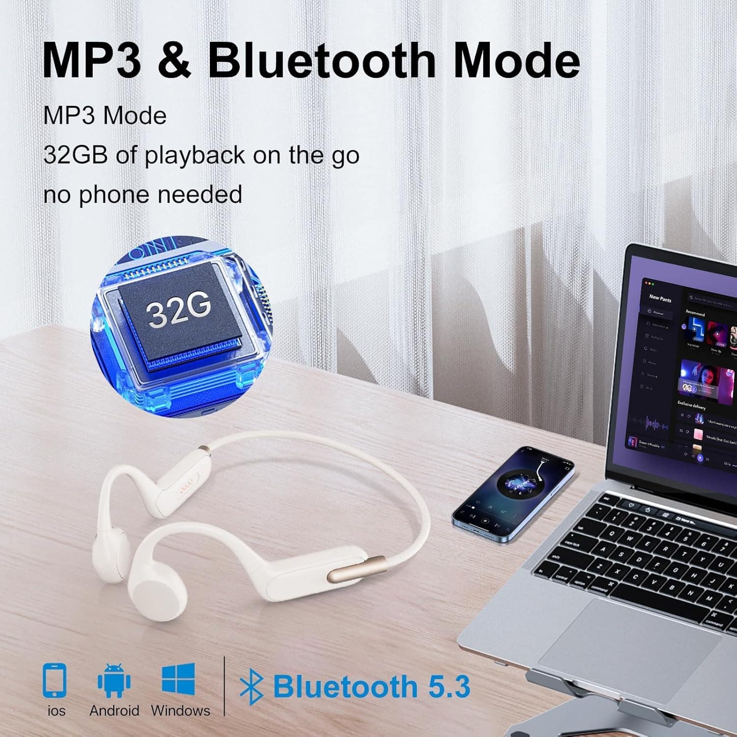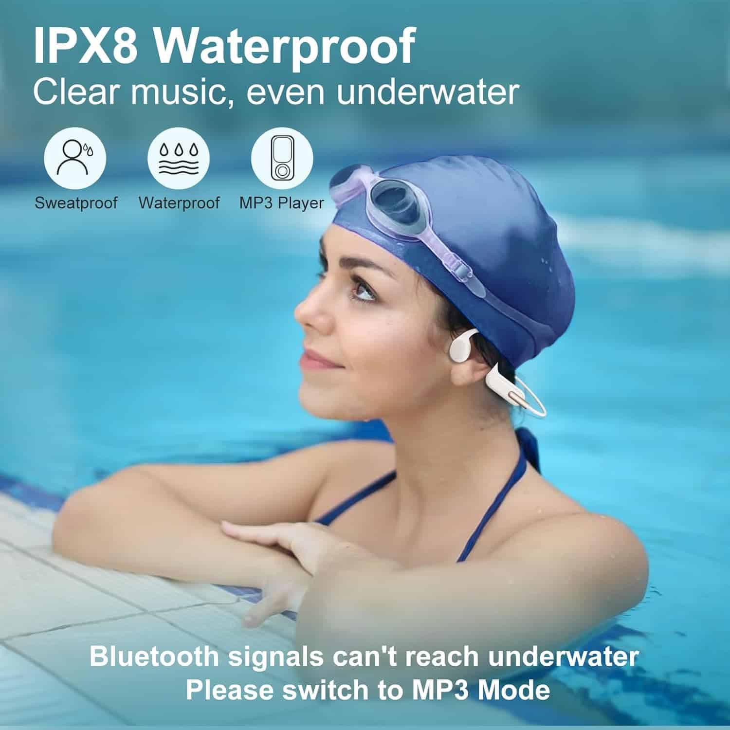 2. Memoria de 32GB integrada: Cambia al modo MP3 y accede a tus pistas favoritas con la memoria integrada de 32GB. Compatible con varios formatos de música y audiolibros, estos auriculares hacen que los entrenamientos sean más agradables. (Nota: Bluetooth no funciona bajo el agua.).