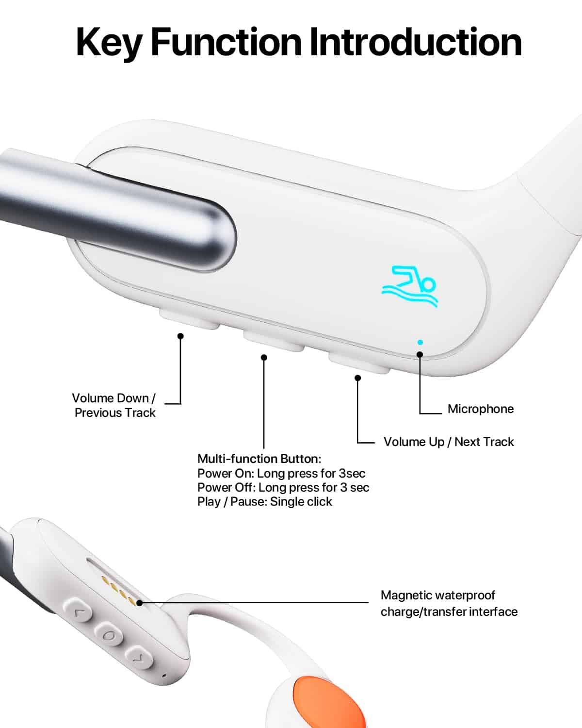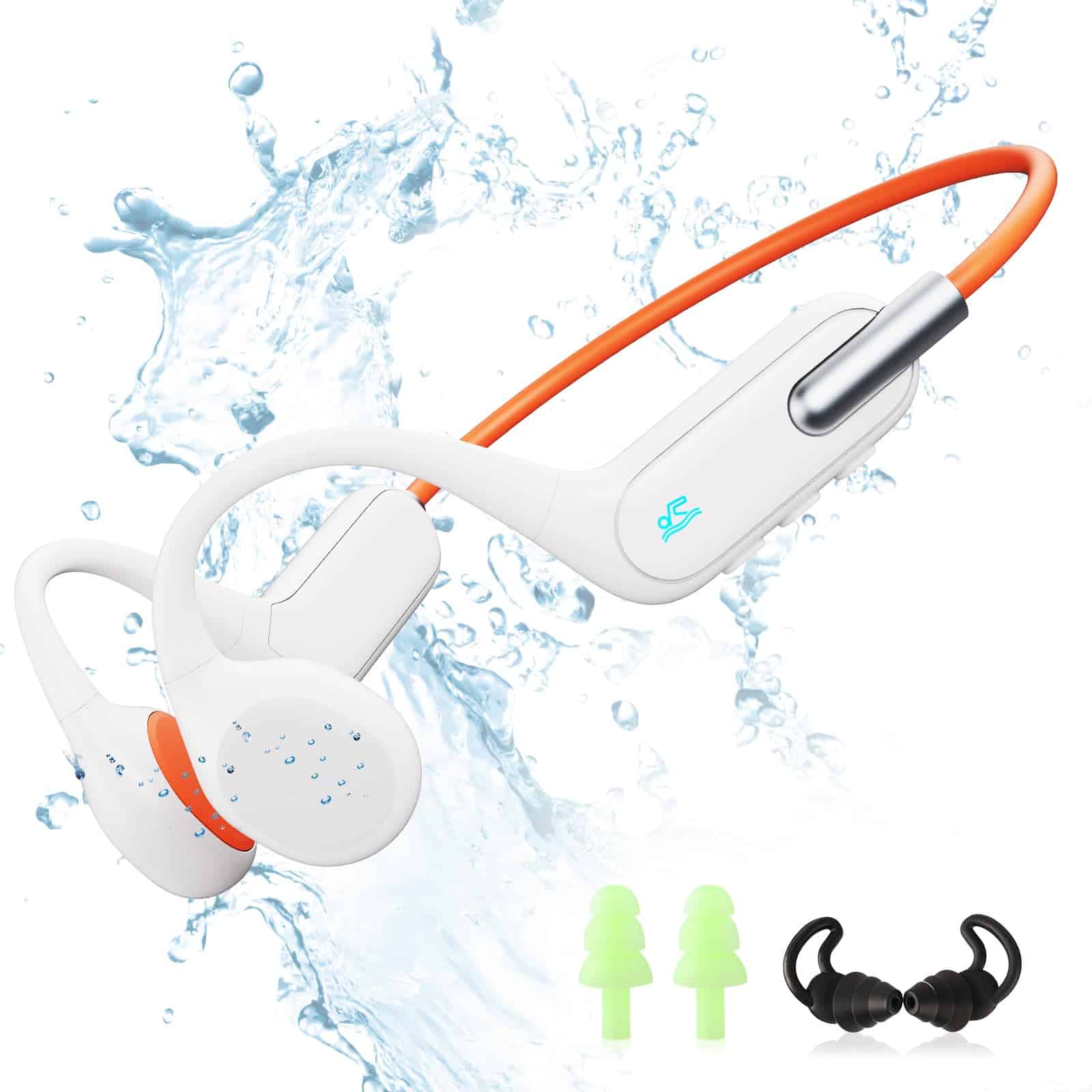 3. MP3 de memoria de 32G: Estos audífonos para nadar tienen una memoria incorporada de 32G, que puede almacenar alrededor de 8000 canciones. El Bluetooth no funciona bajo el agua, por lo que puedes cambiar al modo MP3 mientras nadas. Así podrás disfrutar de tu música y audiolibros favoritos bajo el agua. Soportan varios formatos que incluyen MP3, FLAC, WMA, AAC, WAV, APE y M4A. Ideal para cuando quieres disfrutar de tu música mientras sales a correr al aire libre sin necesidad de llevar tu teléfono.