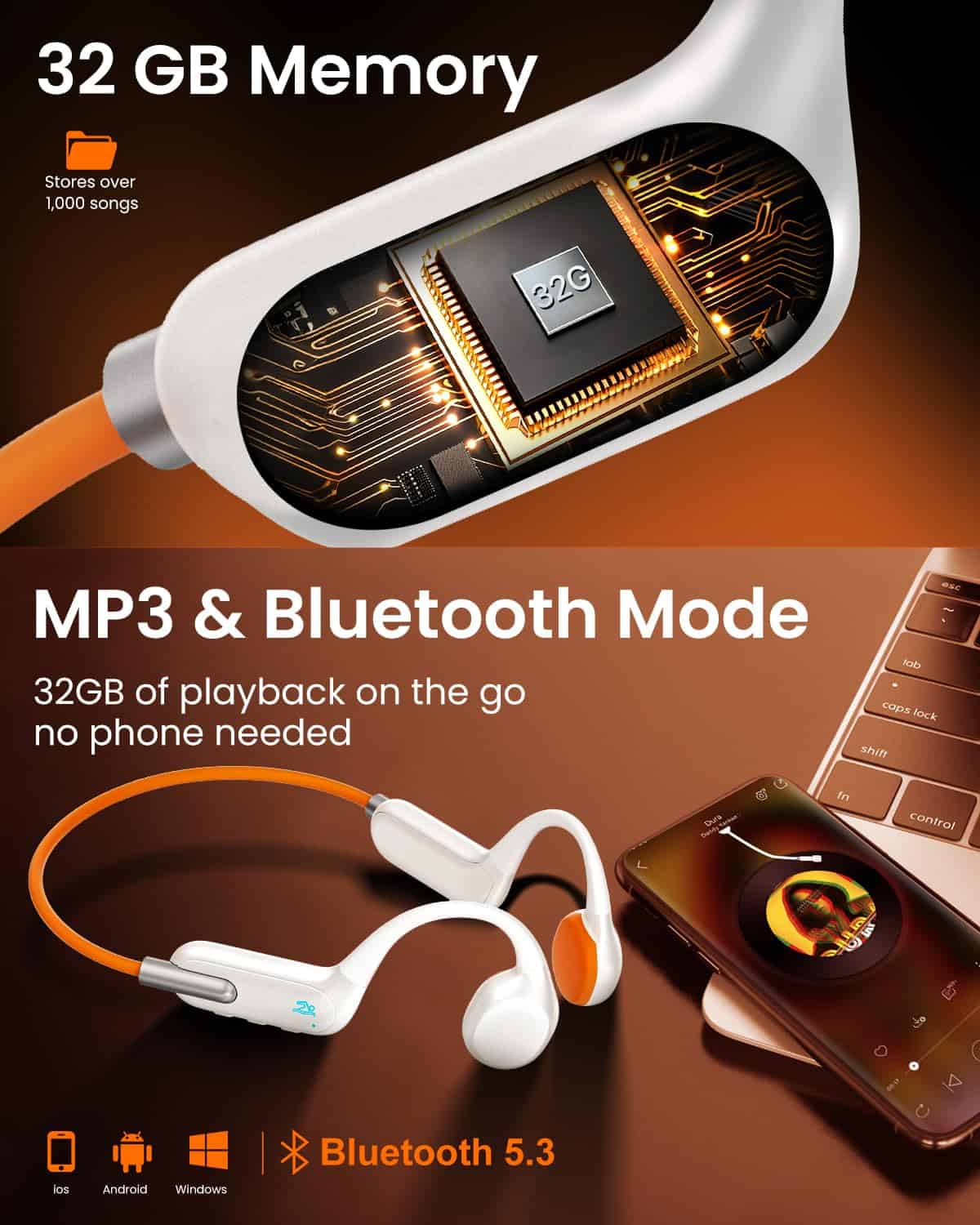 4. Conexión Bluetooth 5.3 estable: Estos auriculares de conducción ósea cuentan con el último chip Bluetooth 5.3, proporcionando una conexión más rápida y estable. Disfruta de 8 horas ininterrumpidas de música y llamadas con nuestros auriculares Bluetooth. Son compatibles con dispositivos iOS y Android.
