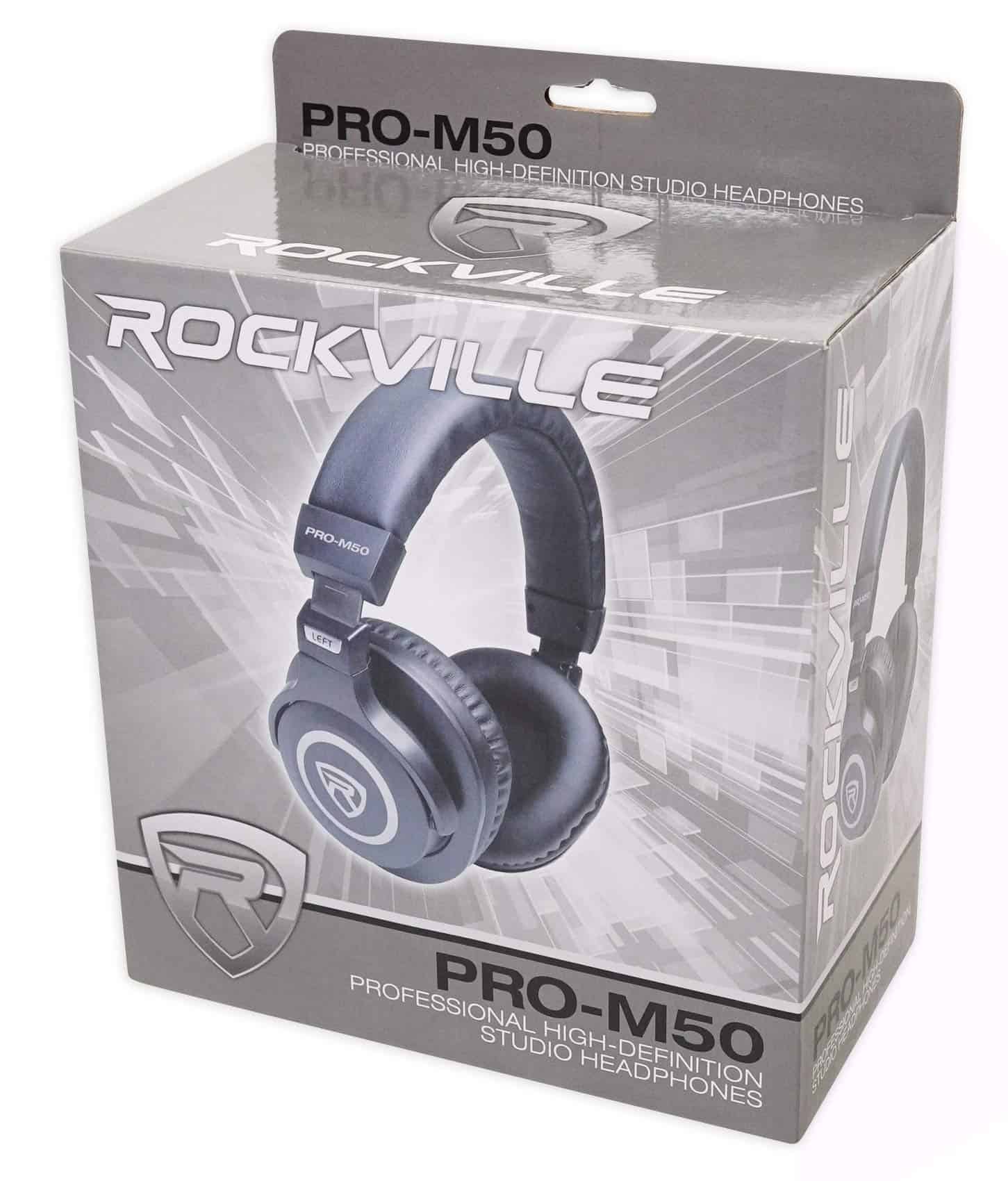 1. Audífonos de Estudio Rockville PRO-M50 con Cable de Bobina Desmontable, Estuche+Almohadilla Extra. Audífonos de Estudio de Alta Definición Profesional. Controladores de Neodimio de 40mm. Copas auditivas giratorias ergonómicamente diseñadas. Aislamiento supremo del sonido. Reproducción precisa del sonido. Sangrado mínimo. Diadema y brazos de acero robustos y duraderos.