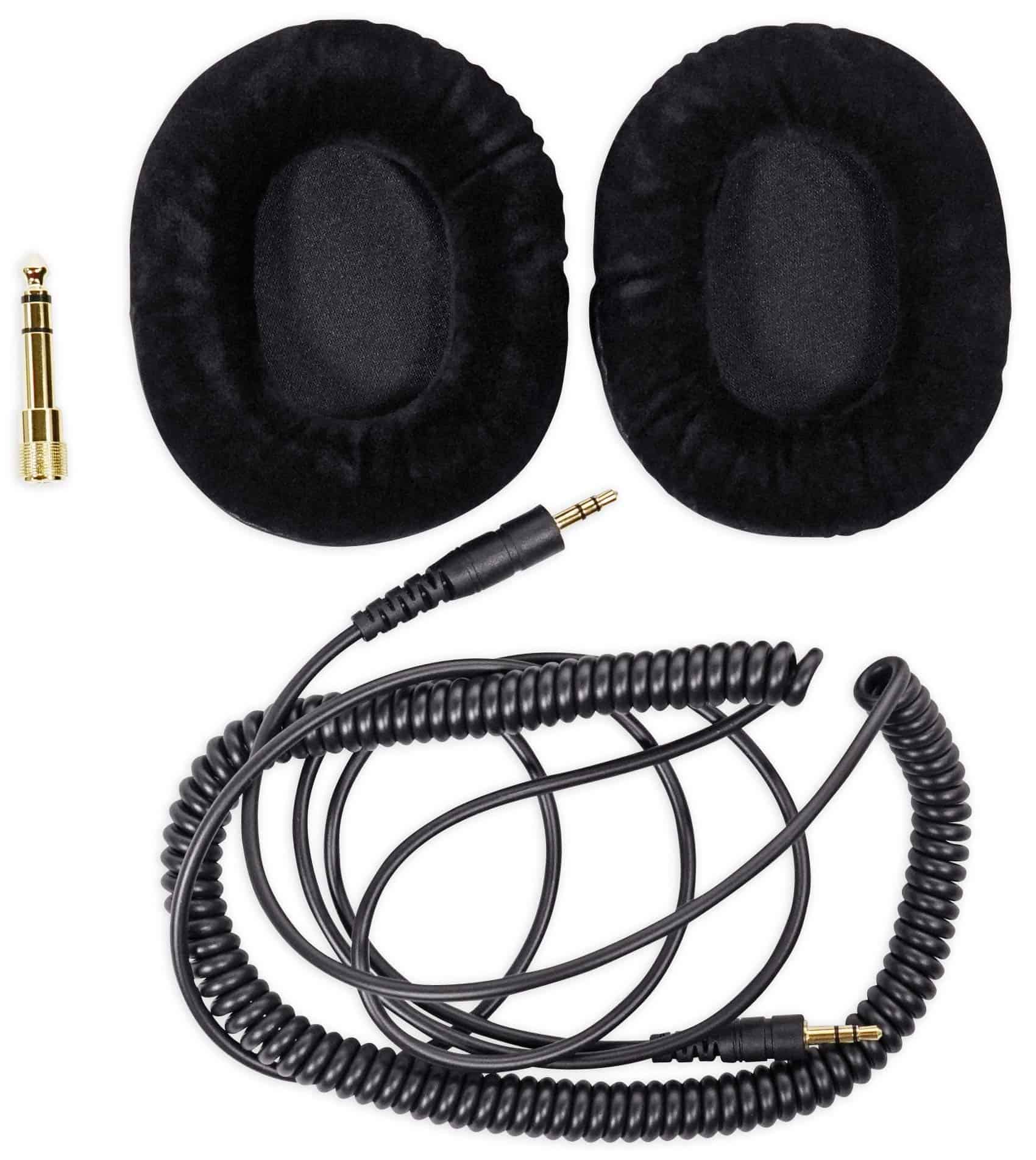 2. Cubierta de diadema de cuero suave. Incluye fundas intercambiables de las copas auditivas de cuero y gamuza suave. Cable de bobina desmontable de 51 , hecho de cobre 100% libre de oxígeno (158 completamente extendido). Conector chapado en oro de 3.5mm. Adaptador chapado en oro. Estuche rígido de cuero. El marco de diadema de acero inoxidable y los brazos móviles son duraderos y de larga duración.