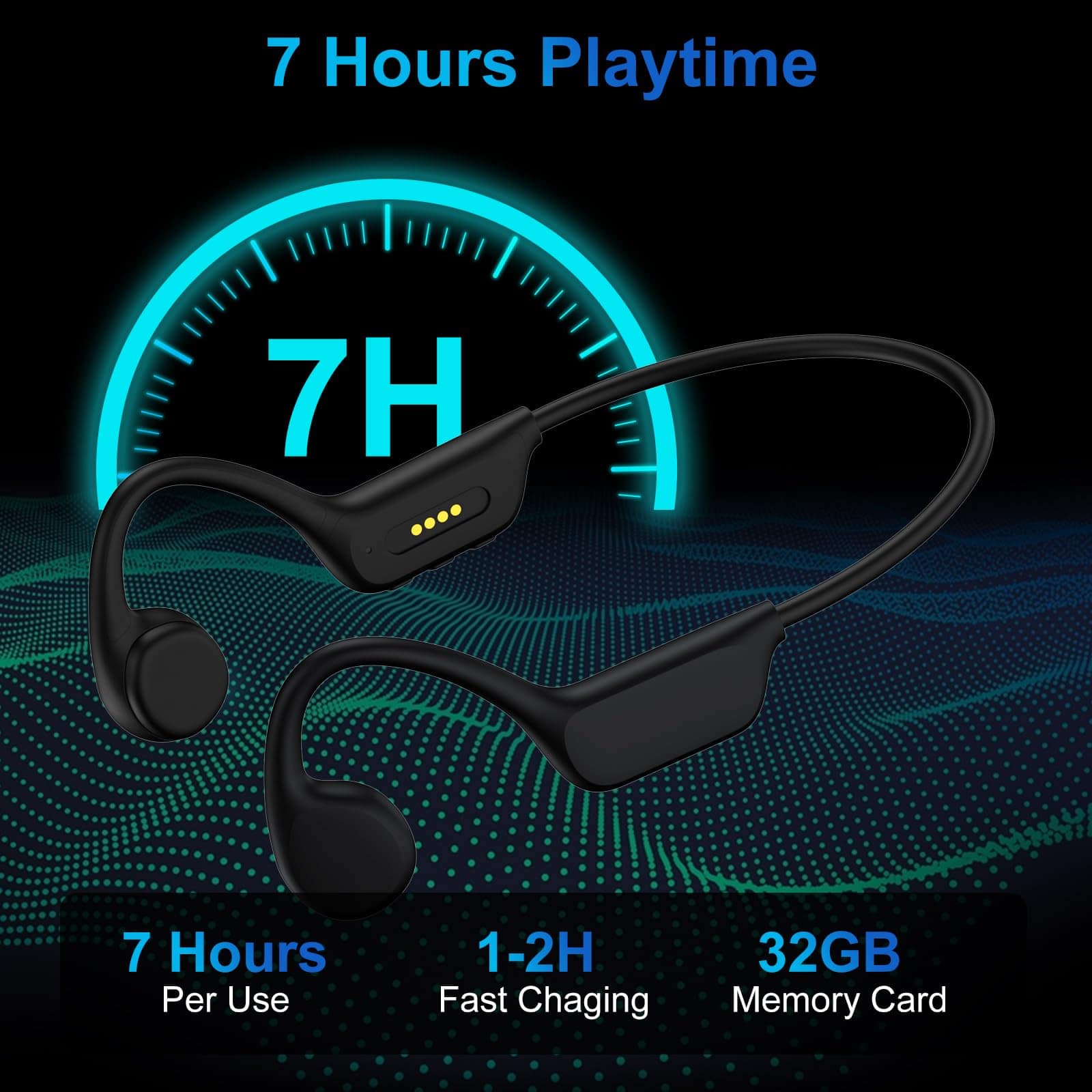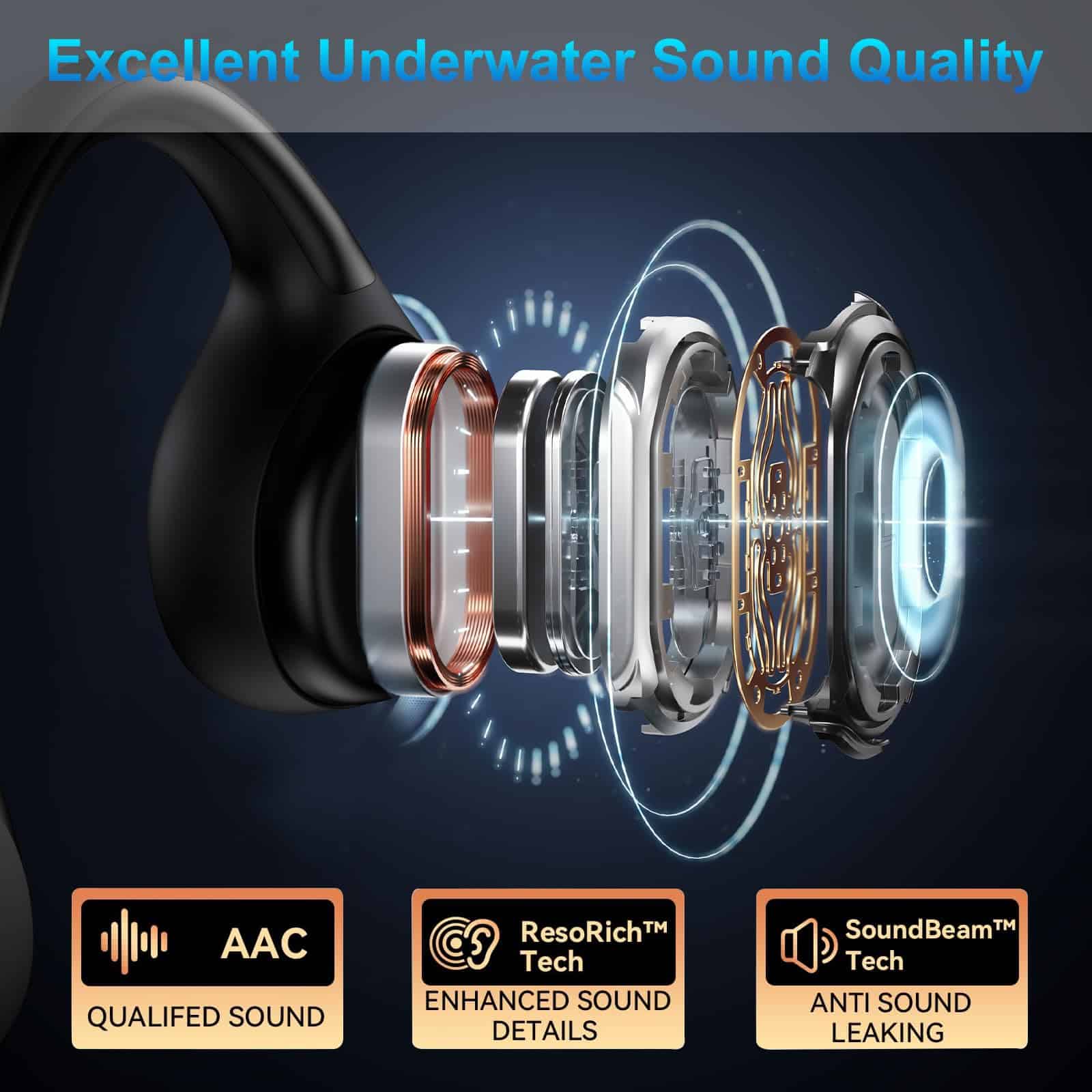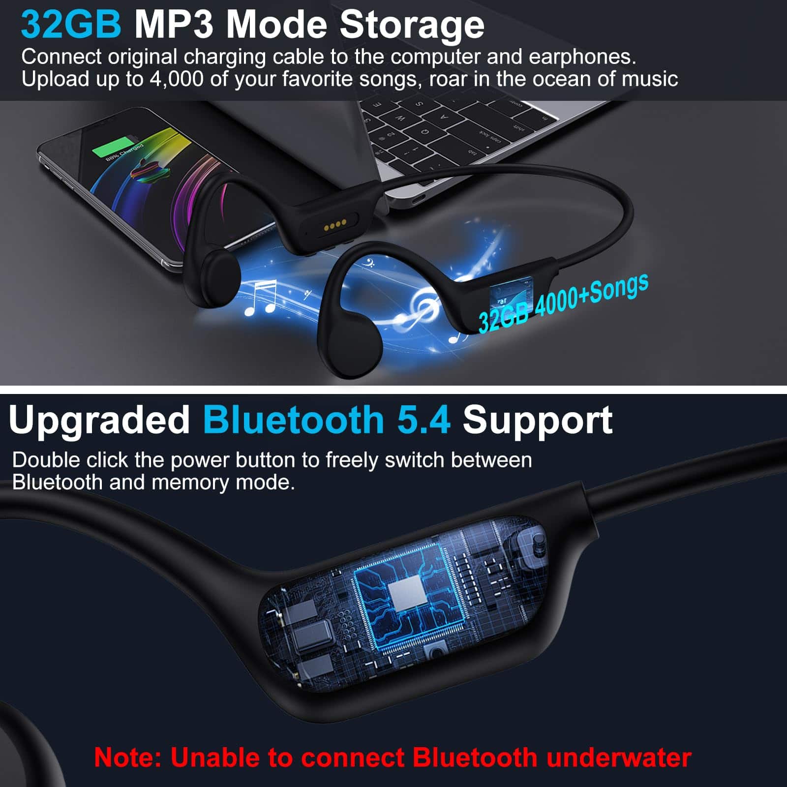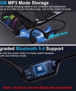 1. Audífonos de natación de conducción ósea para mantenerse consciente del entorno. 2. Nivel profesional de resistencia al agua IPX8. 3. Modo MP3 y memoria de 32GB. 4. Bluetoeth 5.4 mejorado y 7 horas de reproducción. 5. Servicio al cliente garantizado