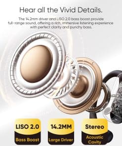 Disfruta de un sonido premium en cada canción gracias a los controladores dinámicos de 14,2 mm y el impulso de graves LISO 2.0 que ofrecen una experiencia auditiva rica e inmersiva. Además, con los 3 modos de ecualización integrados, puedes personalizar el audio según tus preferencias, sin necesidad de una aplicación adicional.