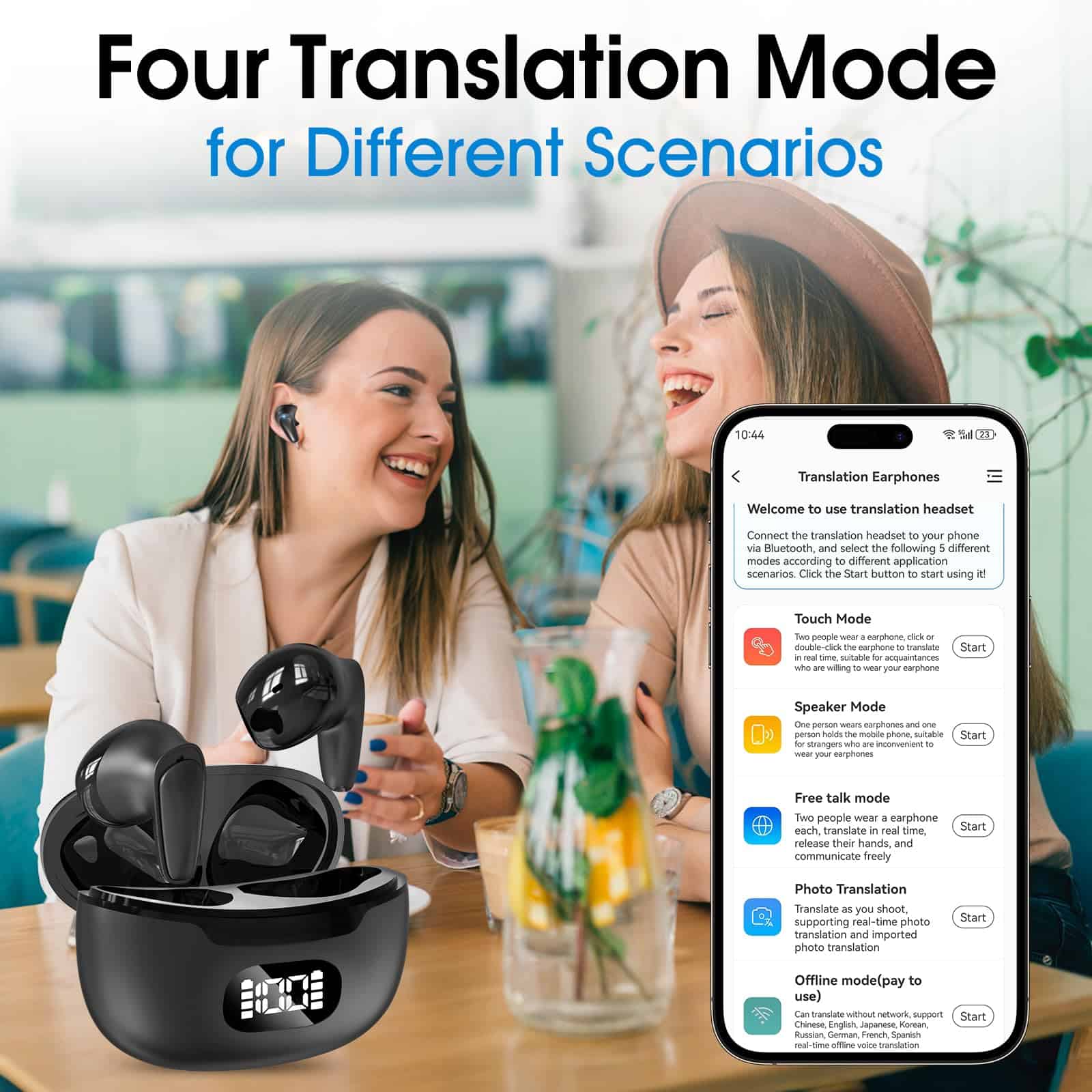 2. Modos de traducción versátiles con protección de privacidad: Estos auriculares traductores ofrecen varios modos de traducción, incluyendo Habla libre, Sin conexión, Transcripción de audio. El modo sin conexión garantiza una funcionalidad de auriculares traductores en tiempo real sin problemas, priorizando la privacidad al evitar retrasos en la red y protegiéndose contra fugas de datos.