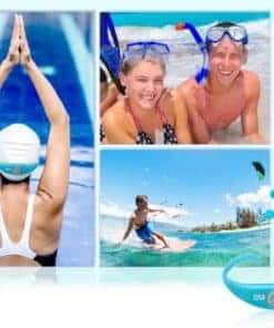 Bluetooth incorporado: Transmite música de forma inalámbrica Micrófono integrado: Responde llamadas manos libres Compatible con teléfonos inteligentes, reproductores de MP3, tabletas y otros dispositivos con Bluetooth Construcción resistente al agua de grado marino IPX8 Controles fáciles de usar Unidad de control de MP3 se desmonta para cargar Batería recargable se carga a través de un puerto USB Ideal para deportes activos Un tamaño para todos Estilo de diadema Indicadores de luces LED Duración de la batería de hasta 6 horas Tiempo de espera: 20 horas Versión de Bluetooth 2.1+ EDR Rango de operación de Bluetooth: 33 pies Rango de temperatura: 32 F – 176 F Se carga a través del puerto USB de Mac/PC o un cargador USB de 5V 1A Dimensiones (An x Al): 4.9″ x 1.0″