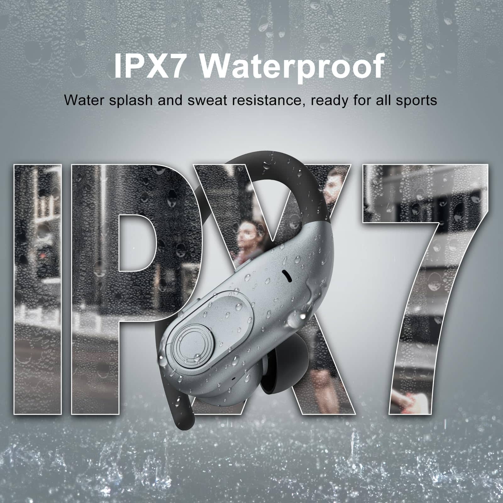 5. Impermeables IPX7: Estos auriculares inalámbricos deportivos tienen una calificación IPX7 impermeable, la superficie de ambos audífonos inalámbricos está sellada para evitar que el sudor o la lluvia entren, y el nano-revestimiento interno protege los componentes de la humedad en el aire. Protege los audífonos Bluetooth de las ligeras gotas de lluvia o el sudor durante entrenamientos intensos. Ampliamente aplicado a correr, ejercicios, gimnasio, viajes, incluso en un día lluvioso.