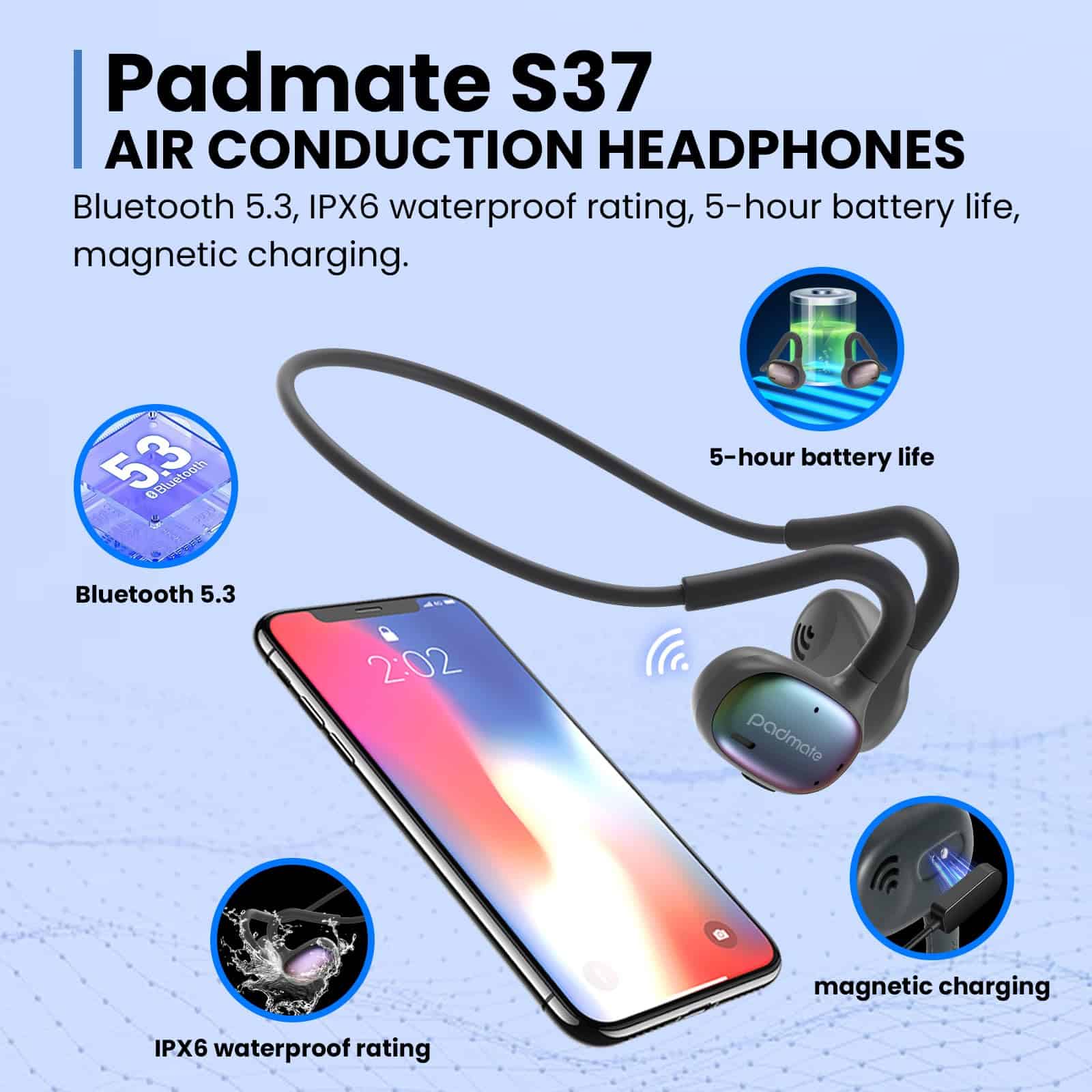 5. Impermeables y Ligeros: Los auriculares de conducción de aire S37 son impermeables, lo que los hace adecuados para una variedad de actividades y entornos. Ya sea que esté haciendo ejercicio, trotando bajo la lluvia o sudando durante una actividad extenuante, la resistencia al agua garantiza que sus auriculares estén protegidos y funcionando. Son muy ligeros, solo pesan 20g.